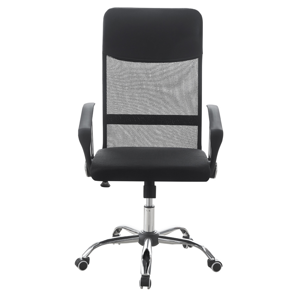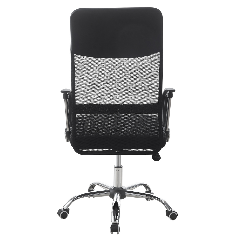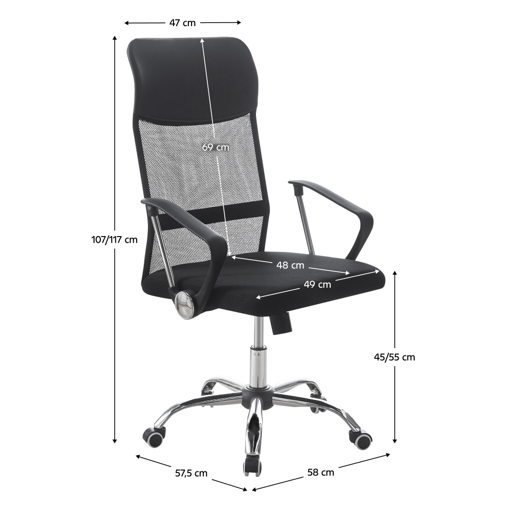 Materiál: ekokůže/síťovina/plast/kov Oděruodolnost ekokůže podle testu Martindale: 100 000 oděrů Oděruodolnost textilie podle testu Martindale: 90 000 oděrů Barva: černá/chrom Rozměry (ŠxHxV): 59,5x57,5x107-117 cm Nastavitelná výška sedu Výška sedu: 45-55 cm Hloubka sedu: 48 cm Šířka sedu: 49 cm Šířka zádové opěrky: 47 cm Výška zádové opěrky: 67 cm Nosnost: 100 kg Otočná Univerzální kolečka Kolečka vhodná pro měkké i tvrdé podlahy Mechanismus houpání Kancelářské Kovová růžice, plastové opěrky rukou Dodáváno v demontu