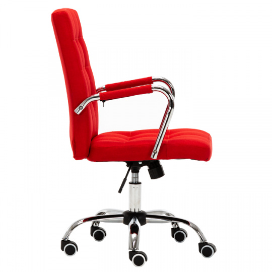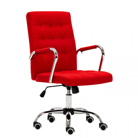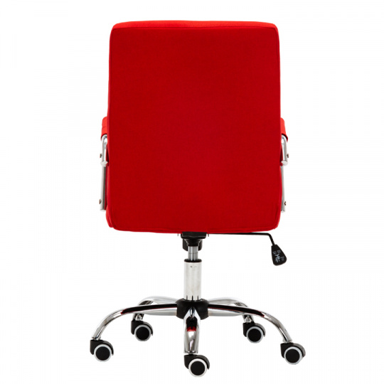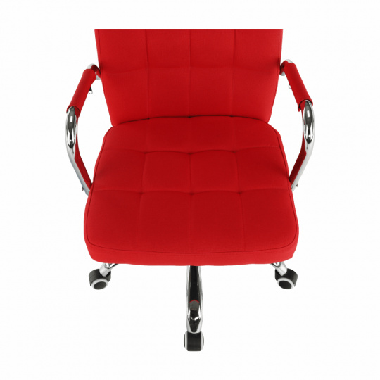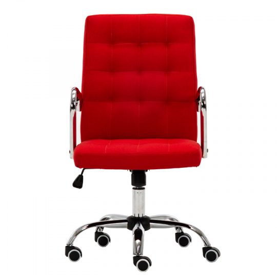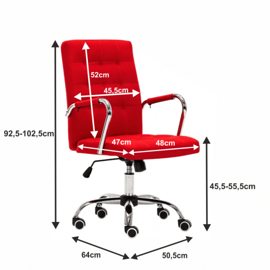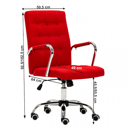 Kancelářské křeslo MORGEN Materiál: látka / kov Oděruodolnost textilie podle testu Martindale: 80 000 oděrek Barva: červená / chrom Rozměry (ŠxHxV): 50,5x64x92,5-102,5 cm Výška sedu: 45,5-55,5 cm Hloubka sedu: 49 cm Houpací mechanismus: ano Nastavení výšky sezení: ano Látka: 100% polyester Hmotnost: 13,5 kg Nosnost: 100kg Opěrka zad (ŠxV): 45,5x52 cm Sedadlo (ŠxH): 48x47 cm Univerzální kolečka vhodná pro měkké i tvrdé podlahy Dodávané v demontu