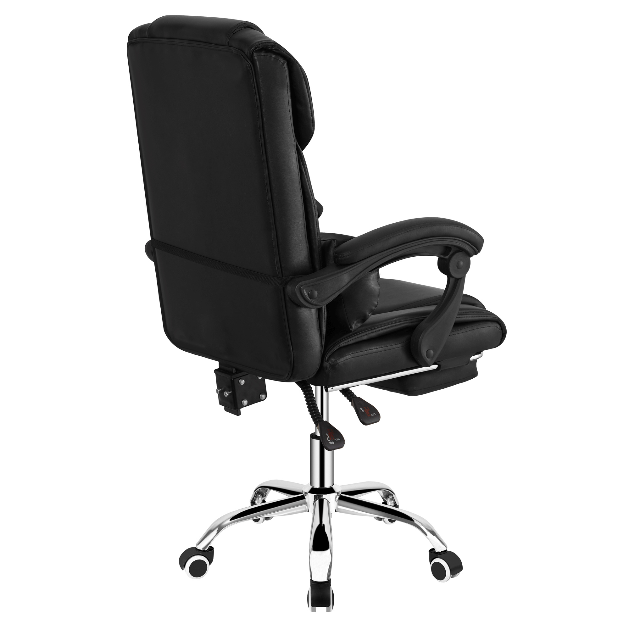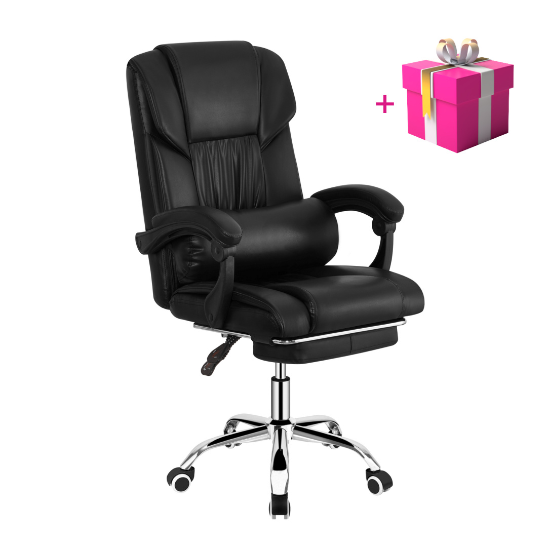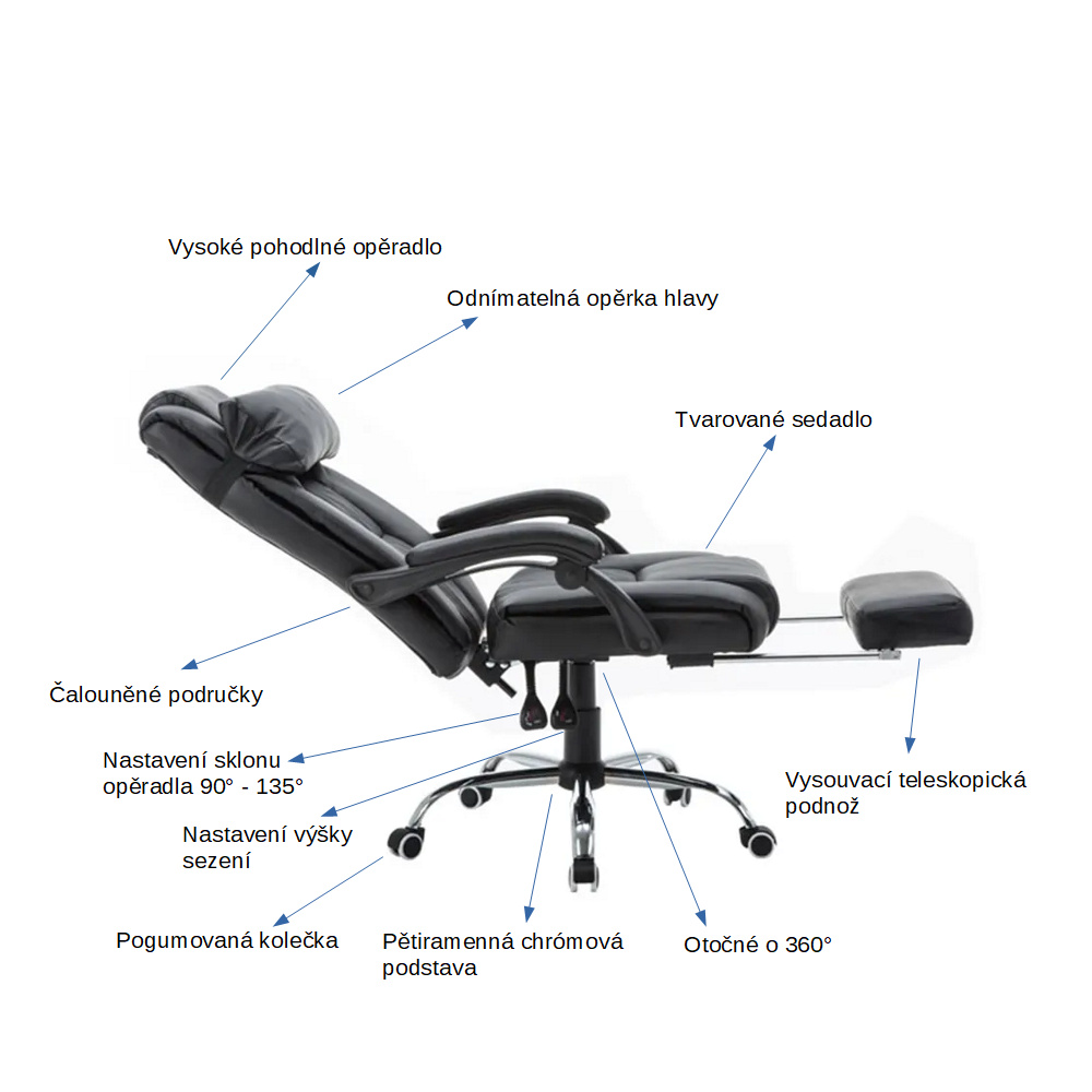Barva: černá/chromovaná Materiál: ekokůže/kov Oděruodolnost ekokůže podle testu Martindale: 100 000 oděrů Rozměry (ŠxHxV): 65x77x105-115 cm Výška sedu: 45-55 cm Hloubka sedu: 50 cm Šířka sedu: 50 cm Šířka zádové opěrky: 50 cm Výška zádové opěrky: 67 cm Nosnost: 110 kg Výsuvná teleskopická podnož Otočná o 360° Nastavení sklonu opěradla 90° - 135° S odnímatelnou opěrkou hlavy Tvarované sedátko Možnost nastavit výšku sedu Čalouněné plastové opěrky na ruce Pětiramenná chromová podstava Univerzální kolečka Vhodné pro tvrdé a měkké podlahy Dodáváno v demontu