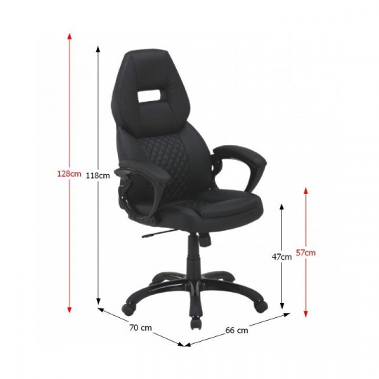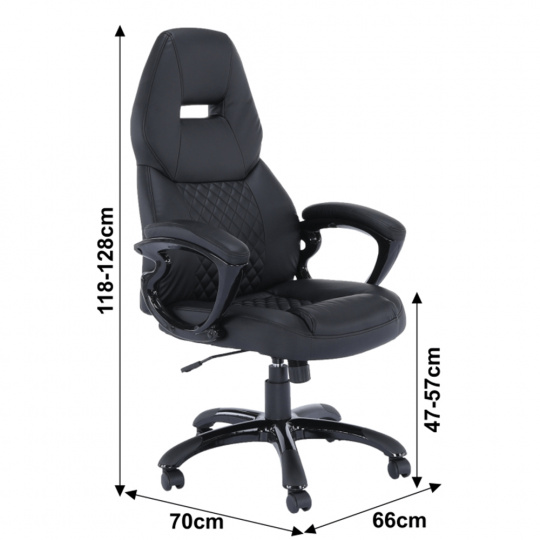 Designové kancelářské křeslo, provedení: černá, materiál: ekokůže + plast, Oděruodolnost textilie podle testu Martindale: 100 000 oděrek rozměry ŠxHxV: 66x70x118-128 cm, výška sezení: 47-57 cm, maximální nosnost 150kg