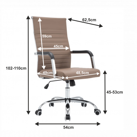 Moderní kancelářské křeslo FARAN Barva: taupe / chrom Materiál: ekokůže Oděruodolnost ekokůže podle testu Martindale: 100 000 oděrek Rozměry (ŠxHxV): 54x62,5x102-110 cm Výška sedu: 45-53 cm Hloubka sedu: 49 Nosnost: 110 kg Opěrka zad (ŠxV): 45x59 cm Sedadlo (ŠxH): 48,5x49 cm Univerzální kolečka vhodná pro měkké i tvrdé podlahy Dodávané v demontu.