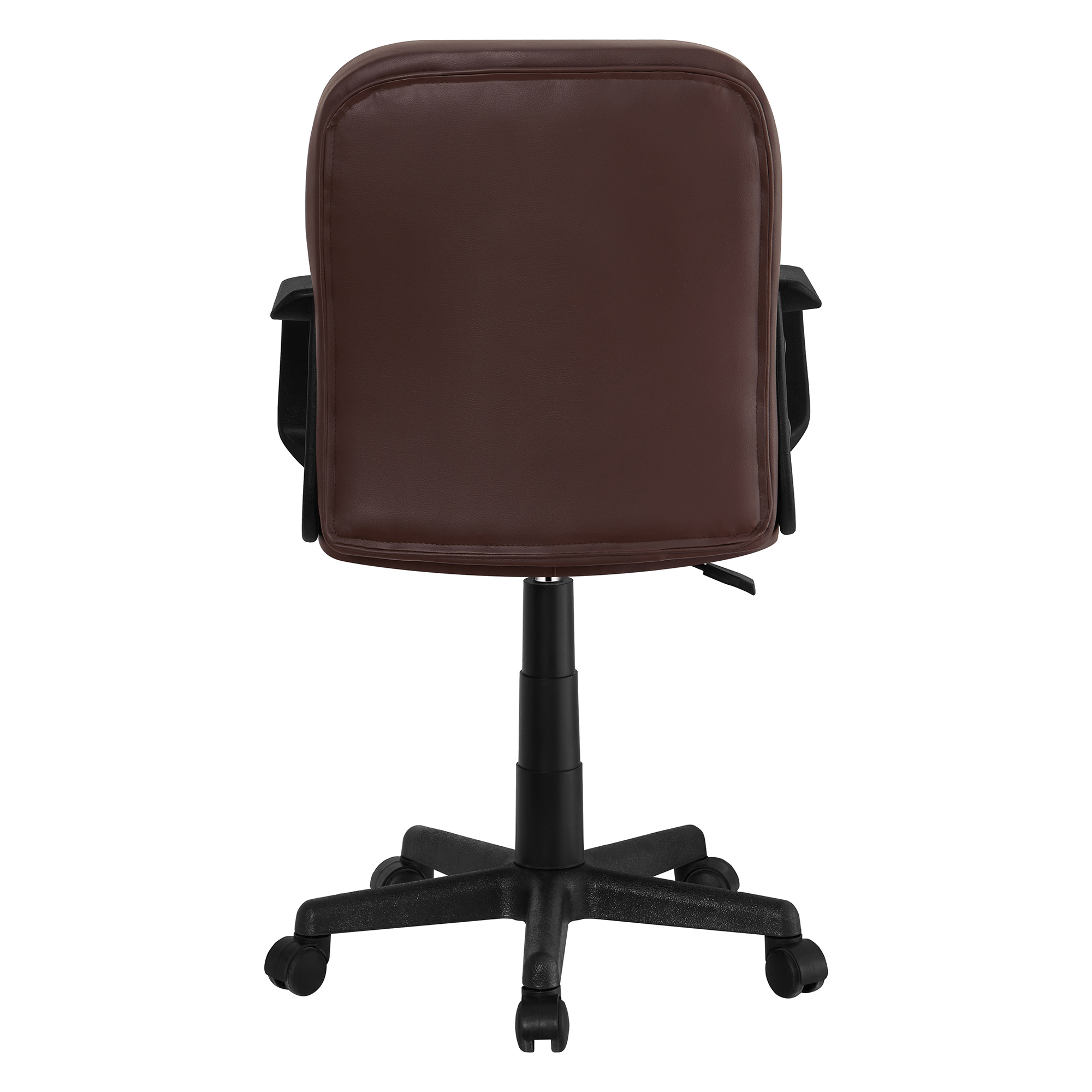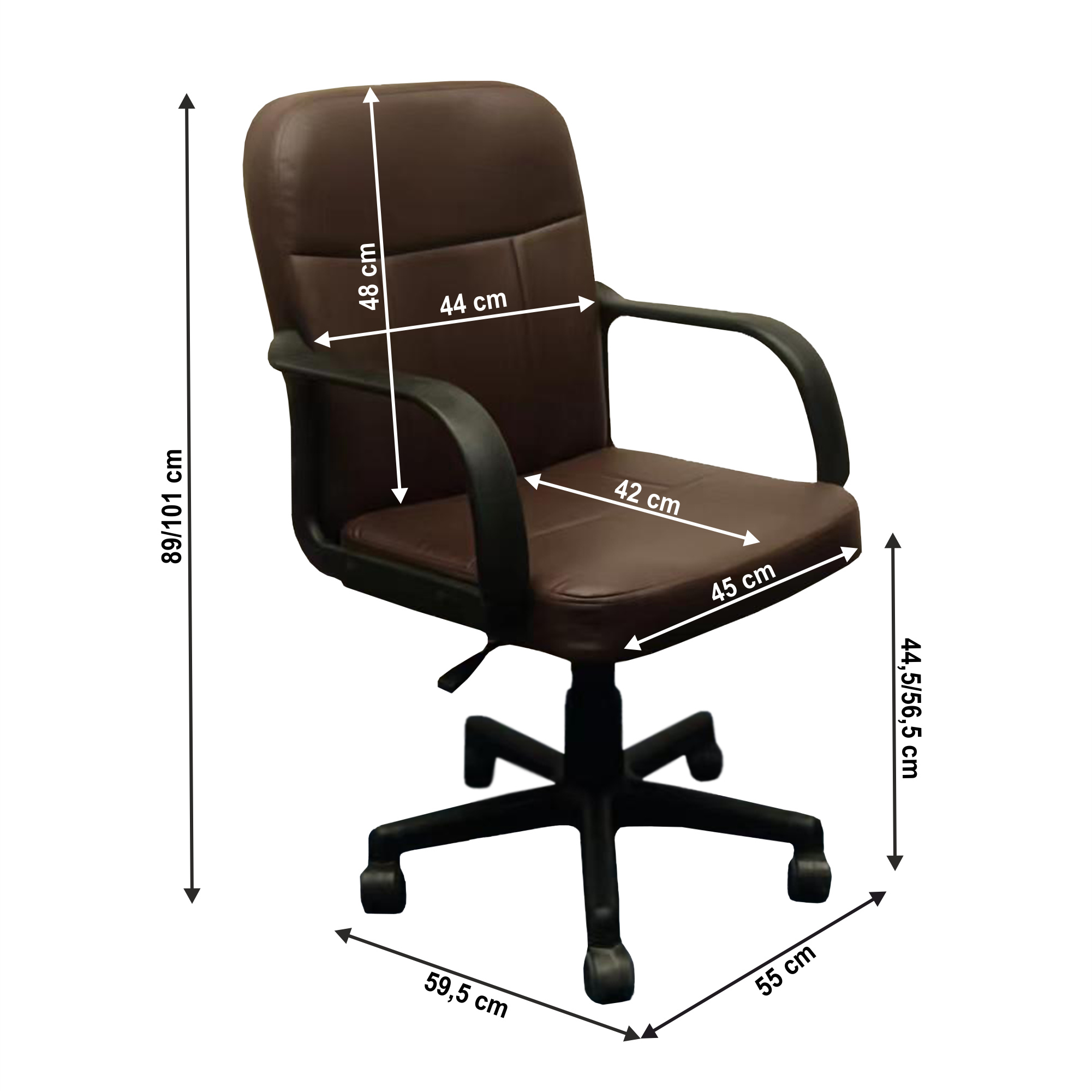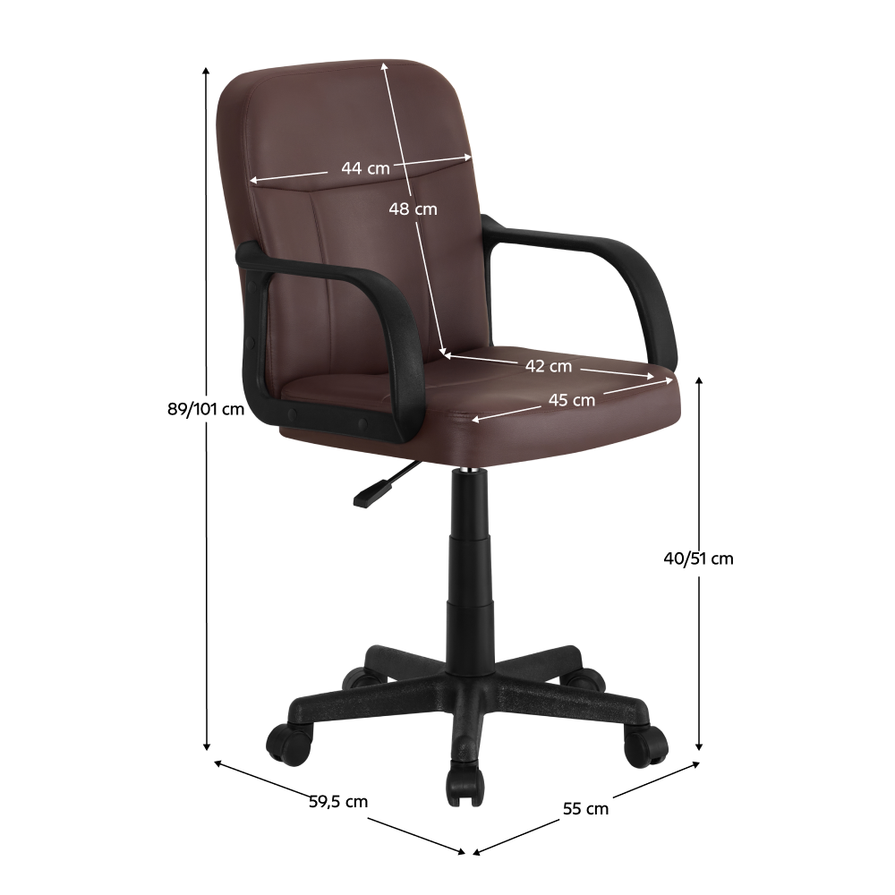 Kancelářské křeslo AYLA NEW Materiál: ekokůže/plast Oděruodolnost textilie podle testu Martindale: 100 000 oděrů Barva: hnědá/černá Rozměry (ŠxHxV): 55x59,5x89-101 cm Výška sedu: 40-51 cm Hloubka sedu: 42 cm Šířka sedu: 45 cm Šířka zad: 44 cm Výška zad: 48 cm Spodní růžice a opěrky na ruce z plastu Nosnost: 80 kg Nastavitelná výška sedu Otočná Na kolečkách Dodáváno v demontu