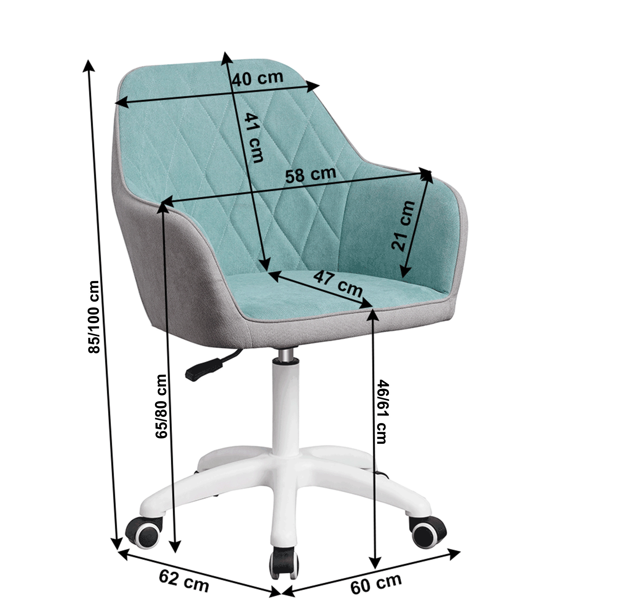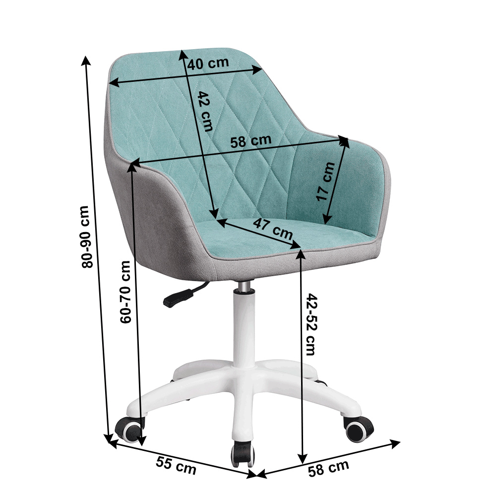 Materiál: látka/plast/kov Barva: mentol / šedá / bílá Oděruodolnost textilie podle testu Martindale: 80 000 oděrek Rozměry (ŠxHxV): 60x62x85-100 cm Nastavení výšky křesla Nastavitelná výška sedu: 46-61 cm Hloubka sedu: 47cm Maximální nosnost: 90 kg otáčivé Pěticípá plastová růžice na kolečkách Univerzální kolečka vhodná pro měkké i tvrdé podlahy Dodávané v demontu
