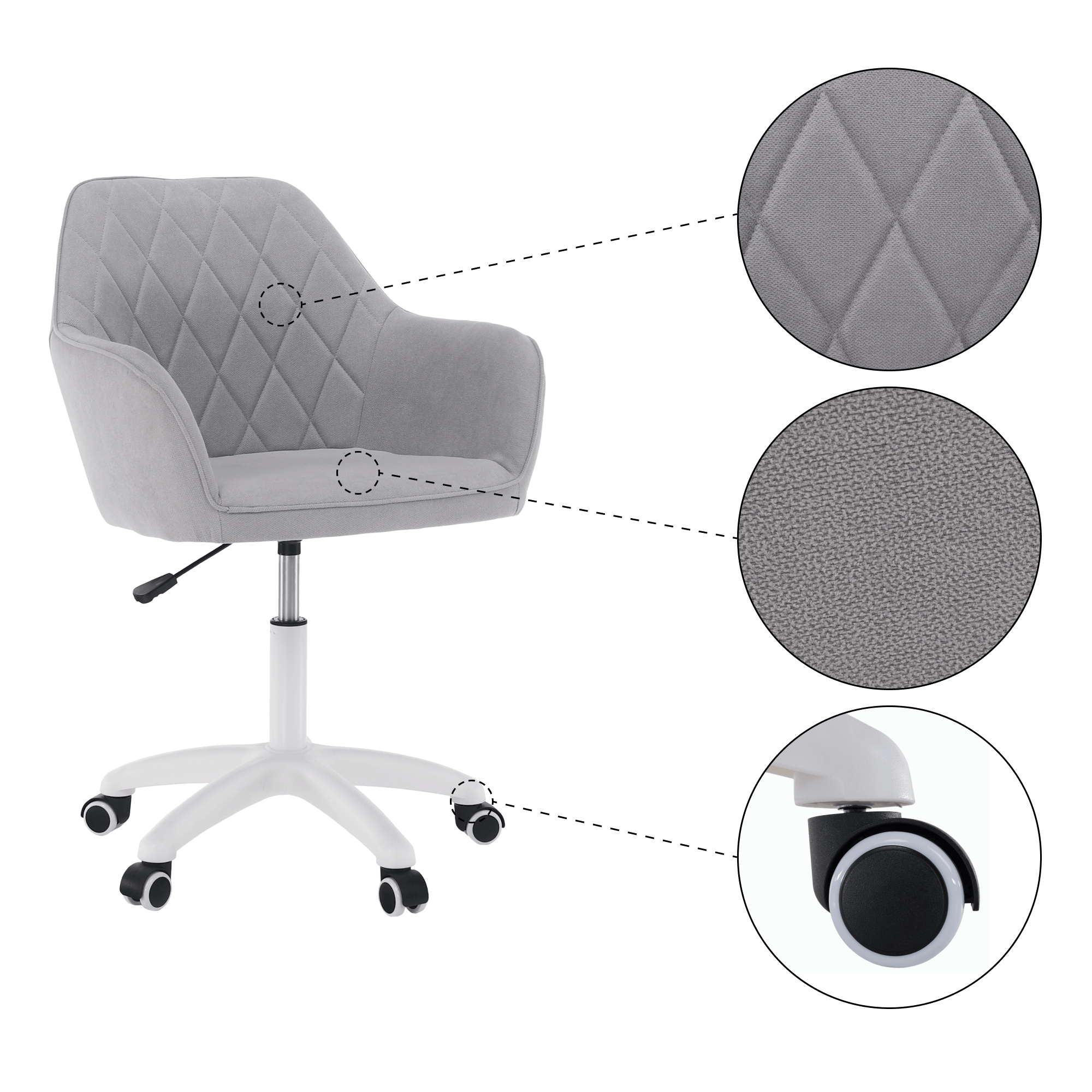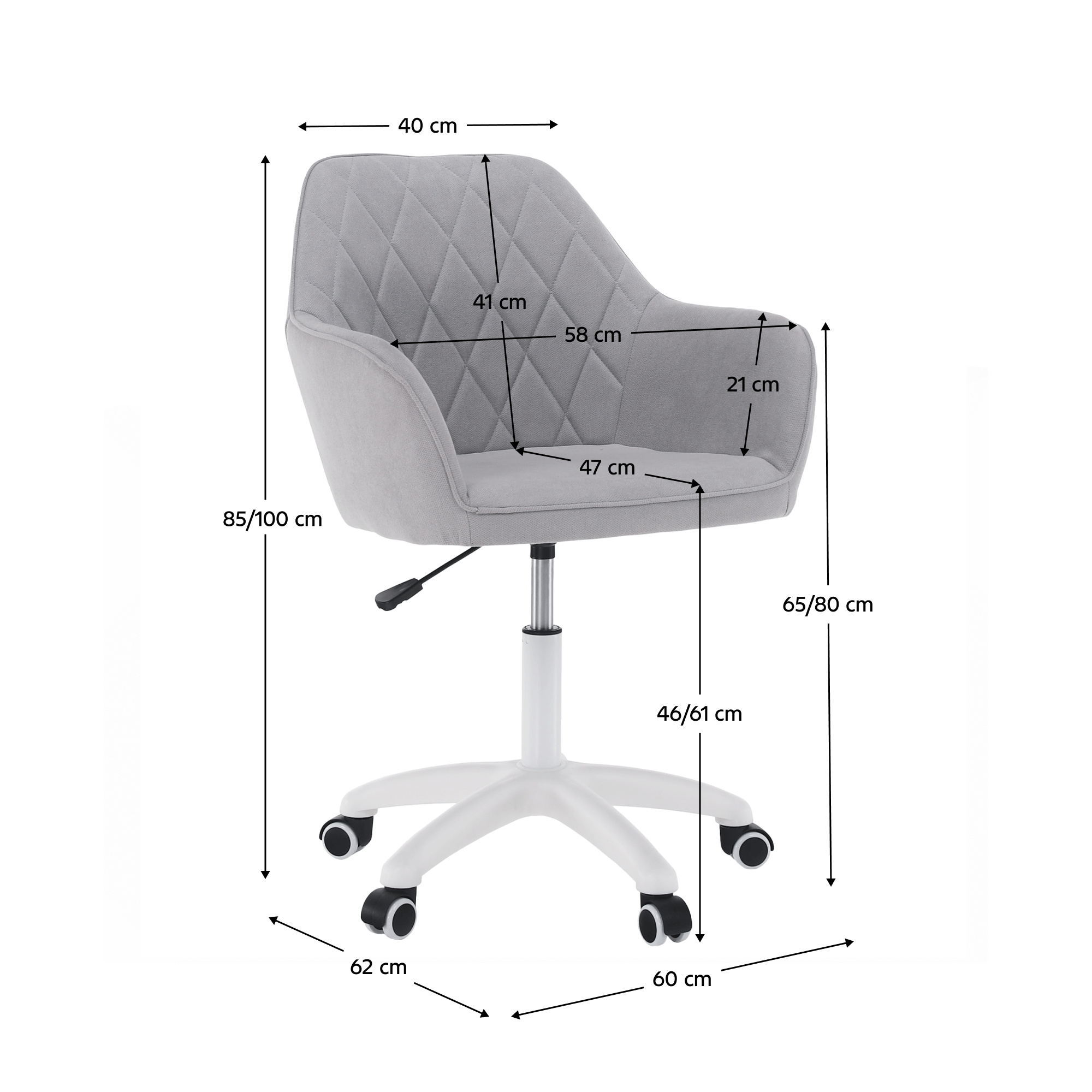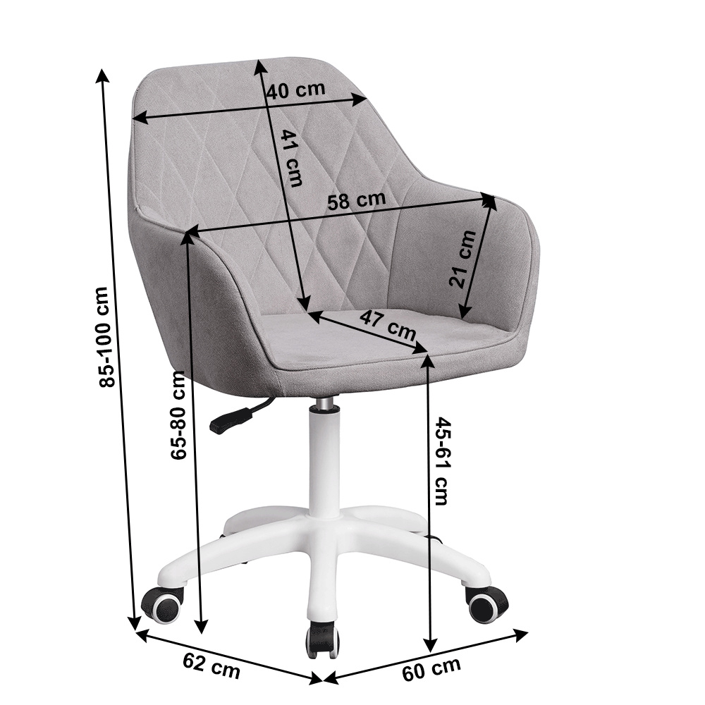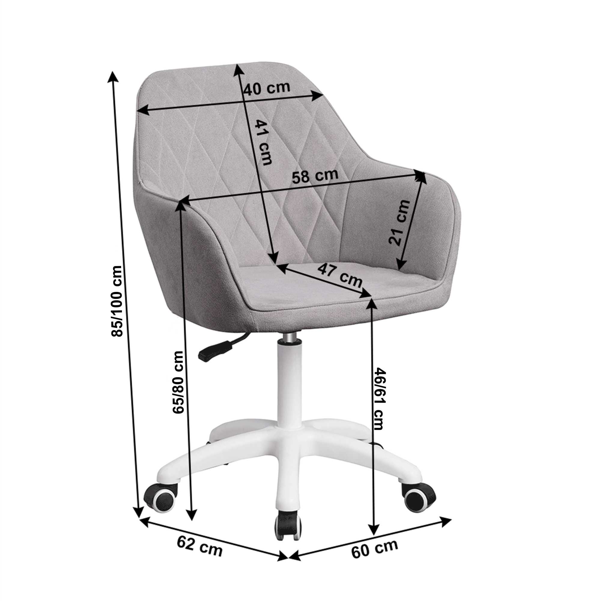 Materiál: látka/plast/kov Barva: šedá / bílá Oděruodolnost textilie podle testu Martindale: 80 000 oděrek Rozměry (ŠxHxV): 60x62x85-100cm Nastavení výšky křesla Nastavitelná výška sedu: 46-61 cm Hloubka sedu: 47cm Maximální nosnost: 90 kg otáčivé Pěticípá plastová růžice na kolečkách Univerzální kolečka vhodná pro měkké i tvrdé podlahy Dodávané v demontu