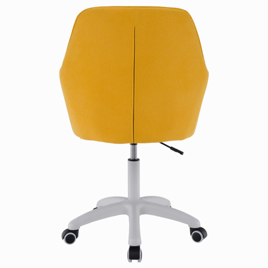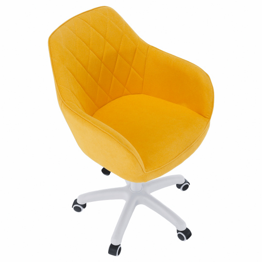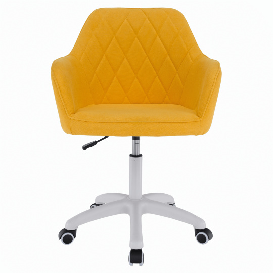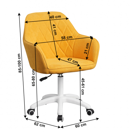 Materiál: látka /plast/kov Barva: žlutá / bílá Oděruodolnost textilie podle testu Martindale: 80 000 oděrek Rozměry (ŠxHxV): 60x62x85-100 cm Nastavení výšky křesla Nastavitelná výška sedu: 46-61 cm Hloubka sedu: 47cm Maximální nosnost: 90 kg otáčivé Pěticípá plastová růžice na kolečkách Univerzální kolečka vhodná pro měkké i tvrdé podlahy Dodávané v demontu