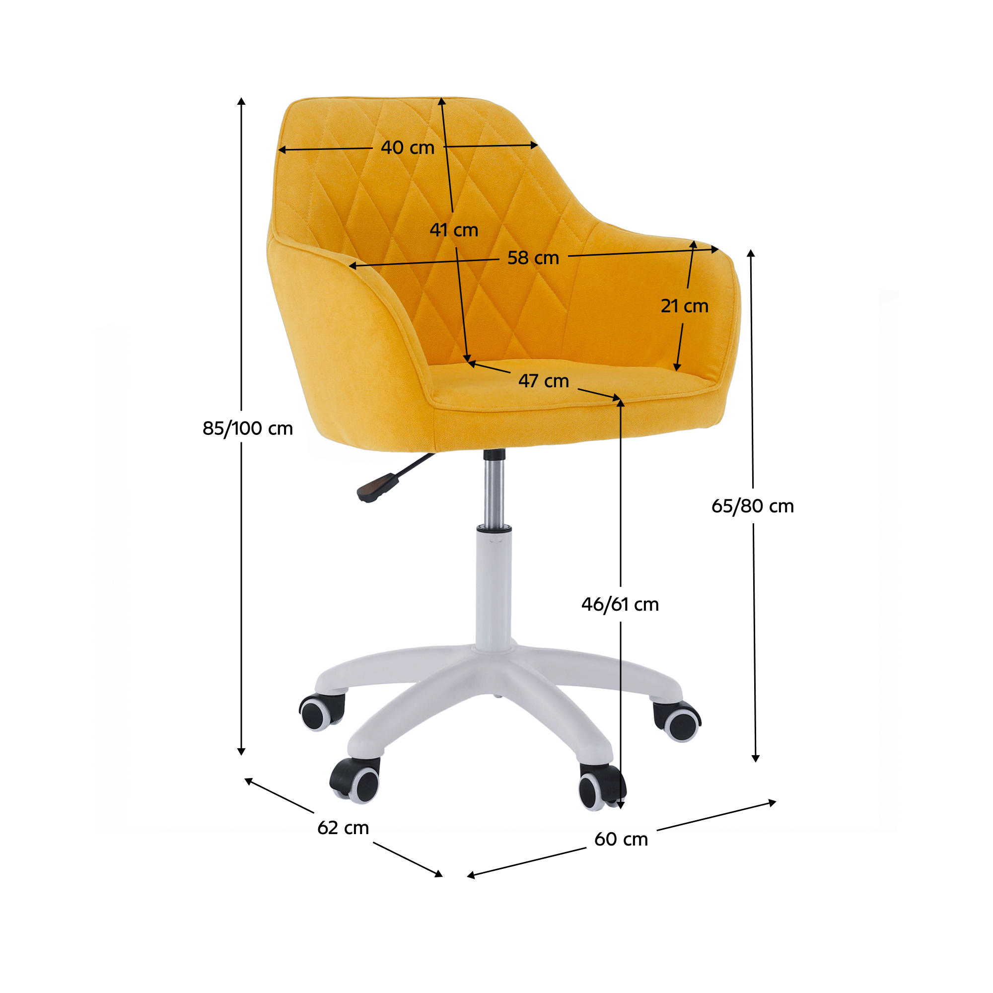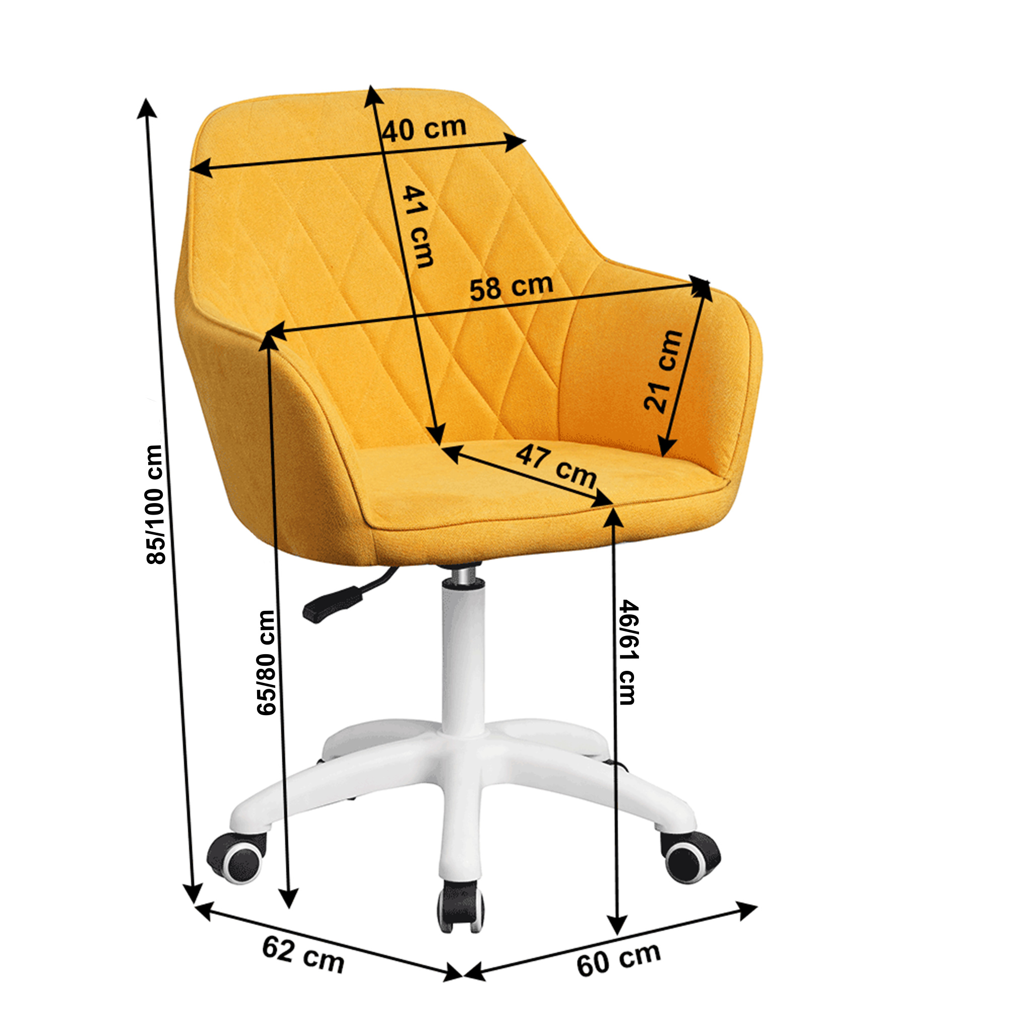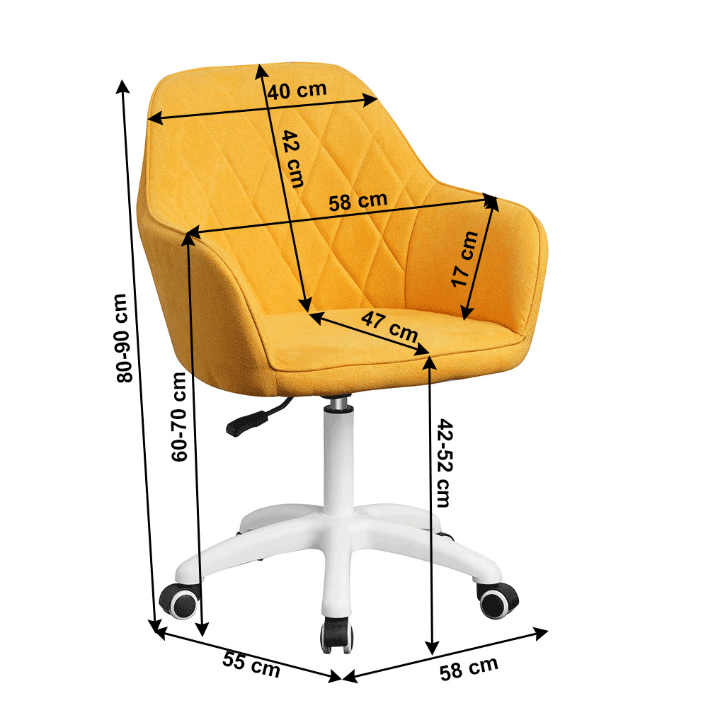 Materiál: látka /plast/kov Barva: žlutá / bílá Oděruodolnost textilie podle testu Martindale: 80 000 oděrek Rozměry (ŠxHxV): 60x62x85-100 cm Nastavení výšky křesla Nastavitelná výška sedu: 46-61 cm Hloubka sedu: 47cm Maximální nosnost: 90 kg otáčivé Pěticípá plastová růžice na kolečkách Univerzální kolečka vhodná pro měkké i tvrdé podlahy Dodávané v demontu