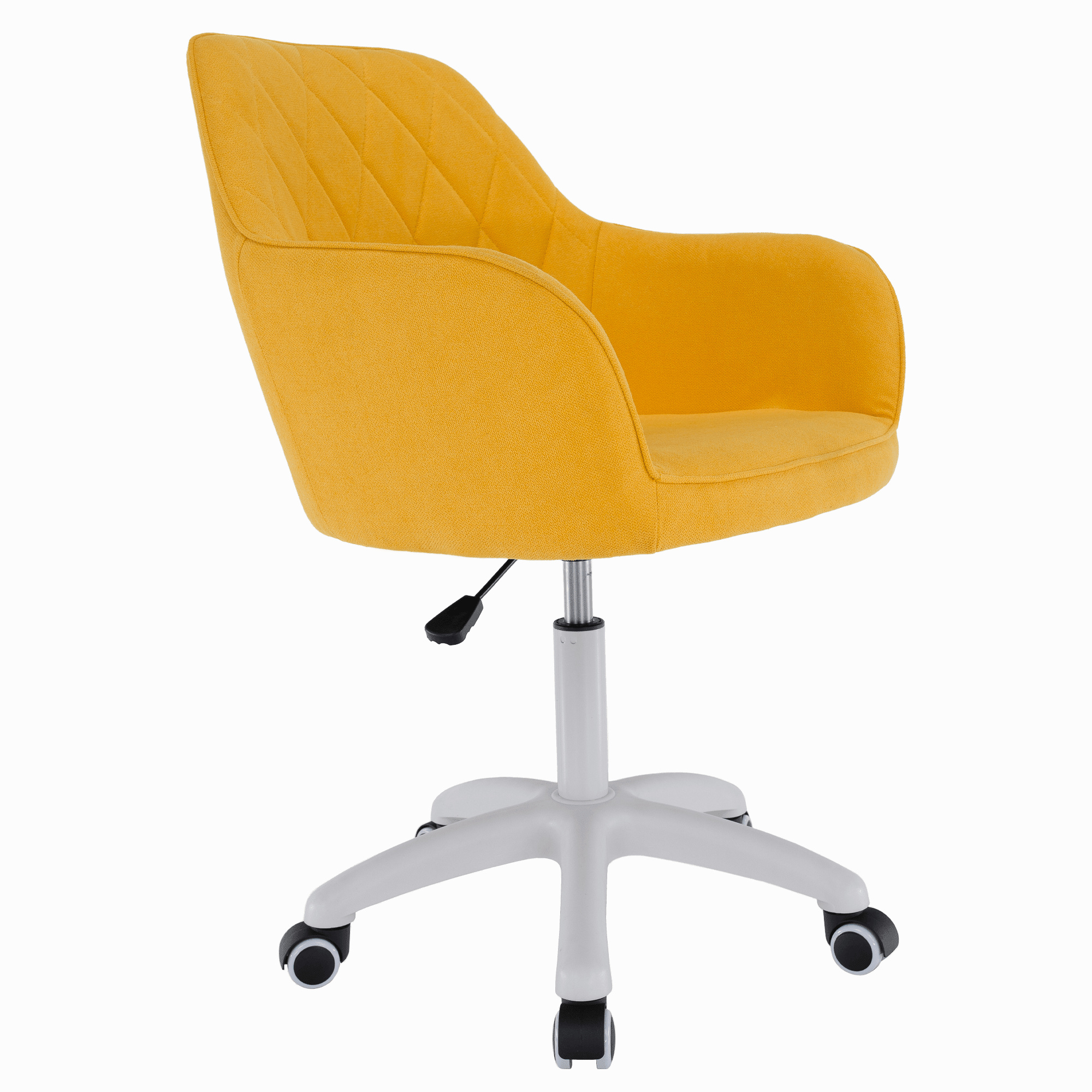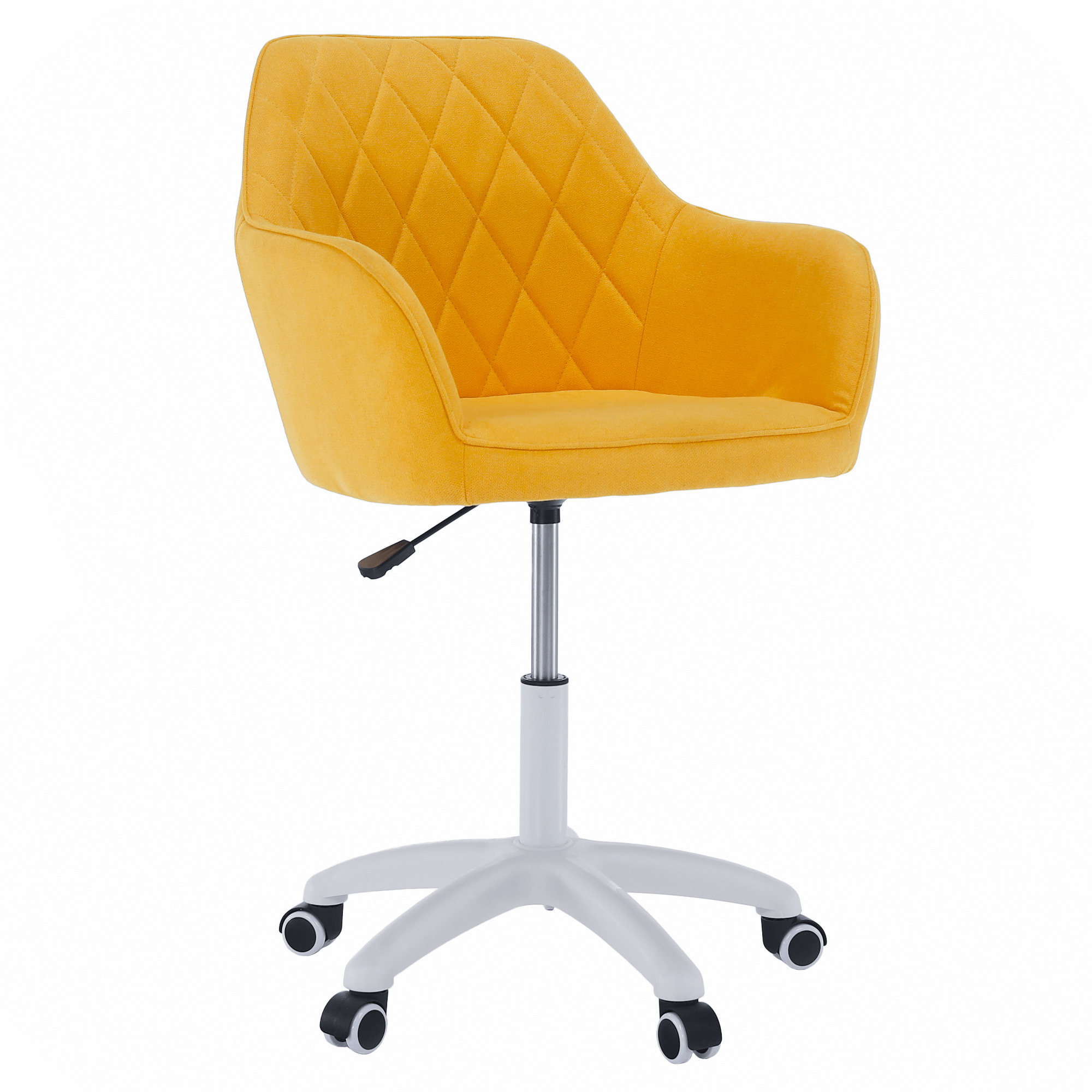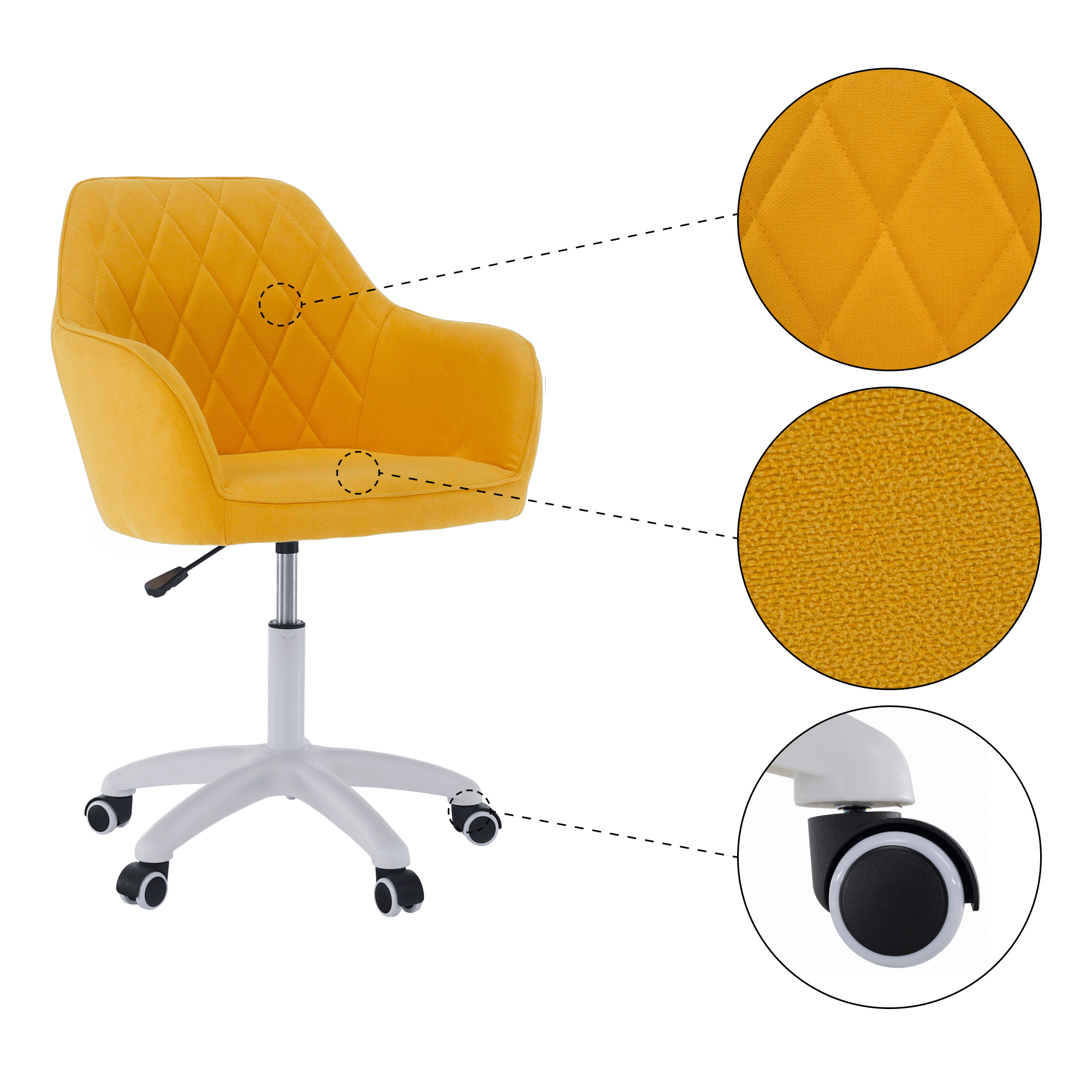 Materiál: látka /plast/kov Barva: žlutá / bílá Oděruodolnost textilie podle testu Martindale: 80 000 oděrek Rozměry (ŠxHxV): 60x62x85-100 cm Nastavení výšky křesla Nastavitelná výška sedu: 46-61 cm Hloubka sedu: 47cm Maximální nosnost: 90 kg otáčivé Pěticípá plastová růžice na kolečkách Univerzální kolečka vhodná pro měkké i tvrdé podlahy Dodávané v demontu