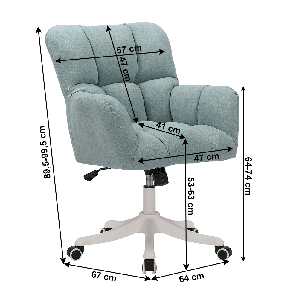 Materiál konstrukce: plast Barva: bílá Materiál čalounění: látka Oděruodolnost látky podle testu Martindale: 80.000 oděrek Barva: neo mint Rozměry (ŠxHxV): 64x67x89,5-99,5 cm Nastavitelná výška sedu: 53-63 cm Šířka sedu: 47 cm Hloubka sedu: 41 cm Výška zádové opěrky: 47 cm Šířka zádové opěrky: 57 cm Maximální nosnost: 110 kg S pístem Opěrky na ruce Dekorativní šití na opěradle a sedadle Plastová pětiramenná podstava Univerzální kolečka vhodná pro měkké i tvrdé podlahy funkce houpání Dodávané v demont