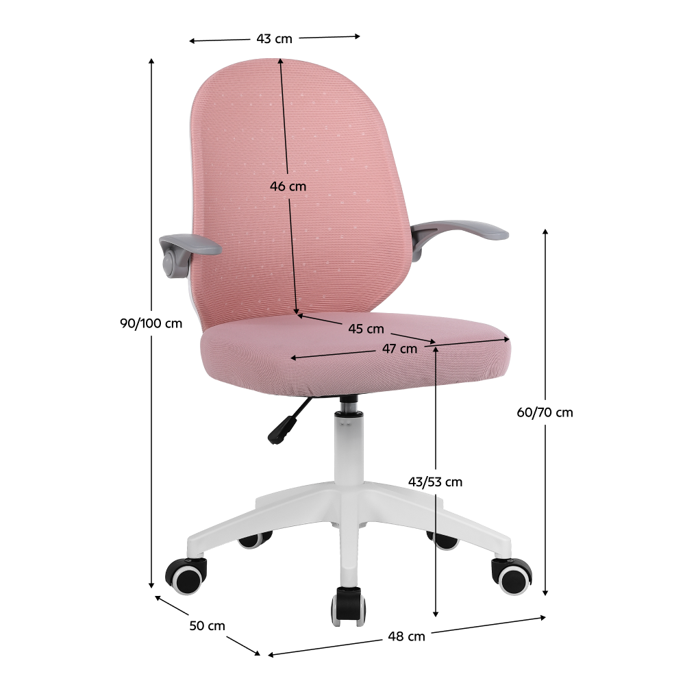 Materiál: síťovina/plast Oděruodolnost textilie podle testu Martindale: 15 000 oděrů Barva: růžová/bílá Rozměry (ŠxHxV): 48x50x90-100 cm Výška sedu: 43-53 cm Šířka sedu: 47 cm Hloubka sedu: 45 cm Výška zádové opěrky: 46 cm Šířka zádové opěrky: 43 cm Nosnost: 100 kg Nastavitelná výška sedu S opěrkami na ruce Sklopné opěrky na ruce Výška od země po opěrku na ruce: 60-70 cm Otočné Univerzální kolečka Vhodné pro tvrdé i měkké podlahy Pětiramenná podstava Dodáváno v demontu