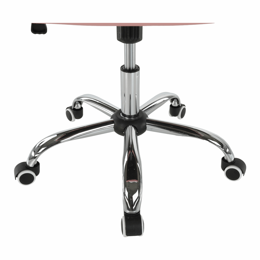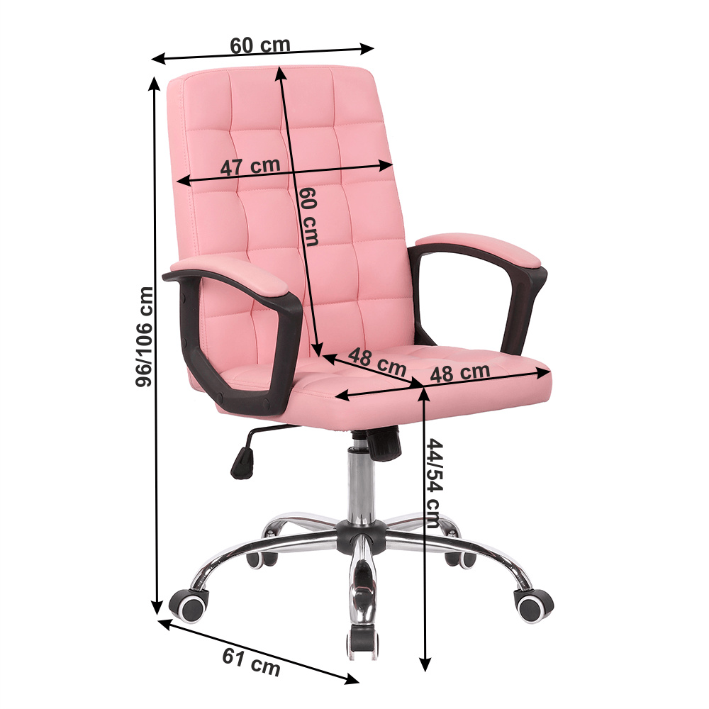 Materiál čalounění: ekokůže Oděruodolnost ekokůže podle testu Martindale: 100 000 oděrek Barva: růžová Materiál konstrukce: plast / kov Barva: černá / chrom Rozměry (ŠxHxV): 60x61x96-106 cm Nastavitelná výška sedu: 44-54 cm Šířka sedu: 48 cm Hloubka sedu: 48 cm Opěrka zad (ŠxV): 47x60 cm Maximální nosnost křesla: 110 kg houpací mechanismus dekorativní šití Čalouněné područky Univerzální kolečka Vhodné pro měkké i tvrdé podlahy Dodávané v demontu