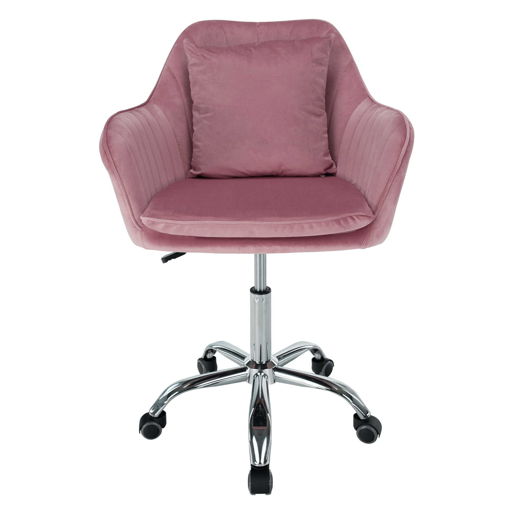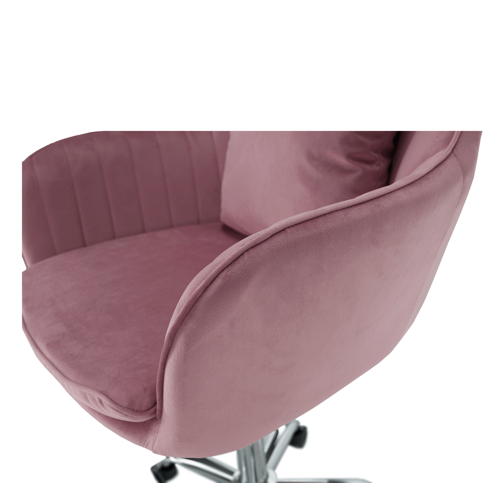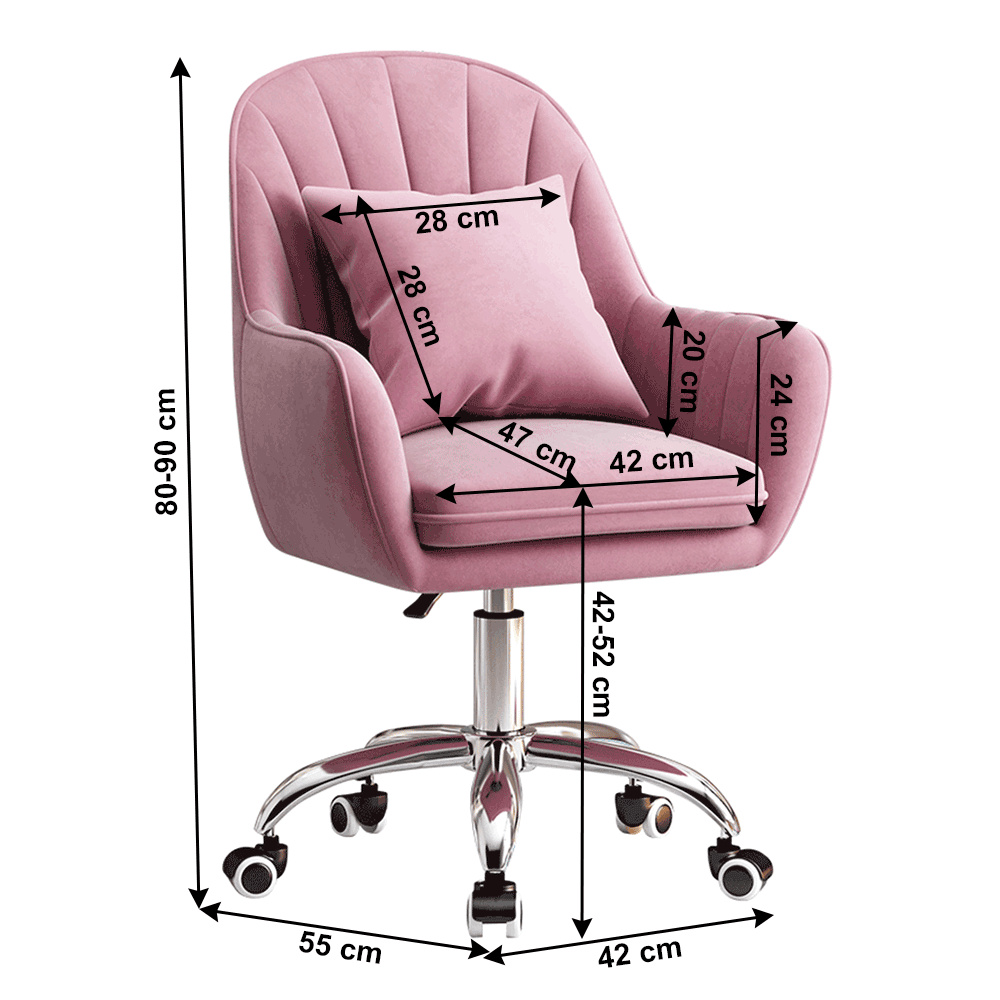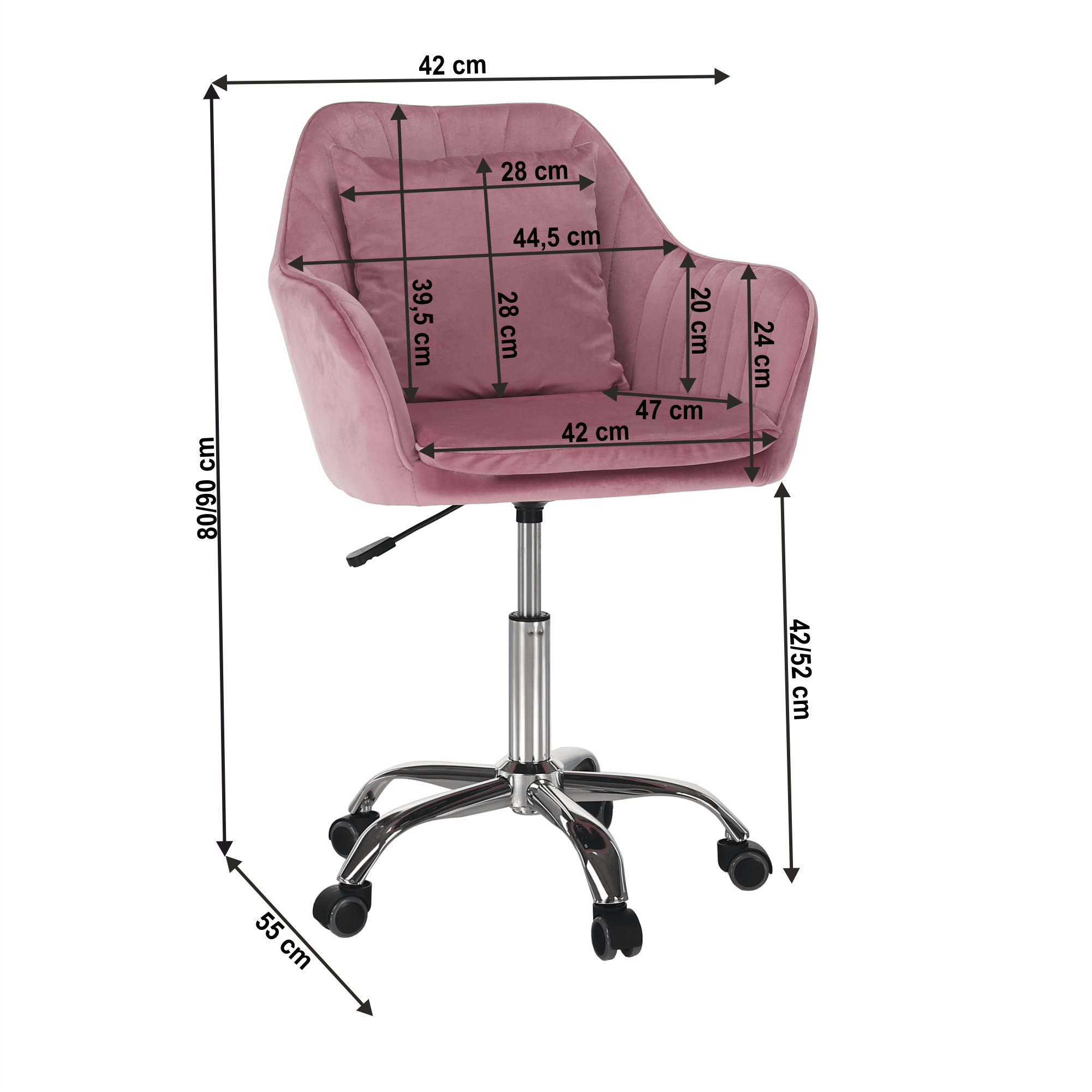 Kancelářské křeslo KLIAN Materiál: látka Velvet / chrom Oděruodolnost textilie podle testu Martindale: 85 000 oděrek Barva: růžová / chrom Rozměry (ŠxHxV): 59x61x87/101 cm Šířka sedu: 42 cm Výška opěrky na ruku: 18 cm Rozměry polštáře (ŠxV): 32x32 cm Výška sedu: 50/65 cm Hloubka sedu: 48 cm Opěrka zad (ŠxV): 48x41 cm Nosnost: 100 kg S polštářem Nastavitelná výška sedu otáčivé Univerzální kolečka vhodná pro měkké i tvrdé podlahy Dodávané v demontu