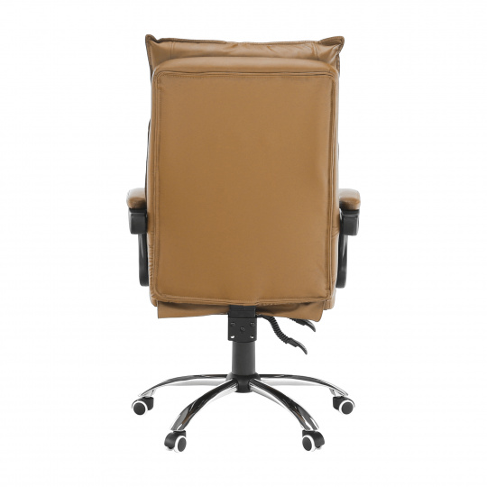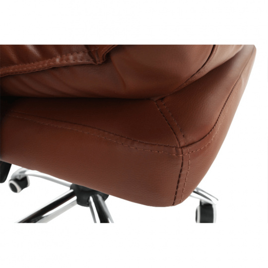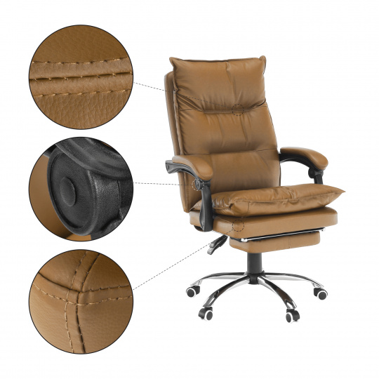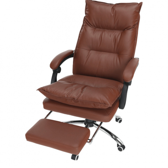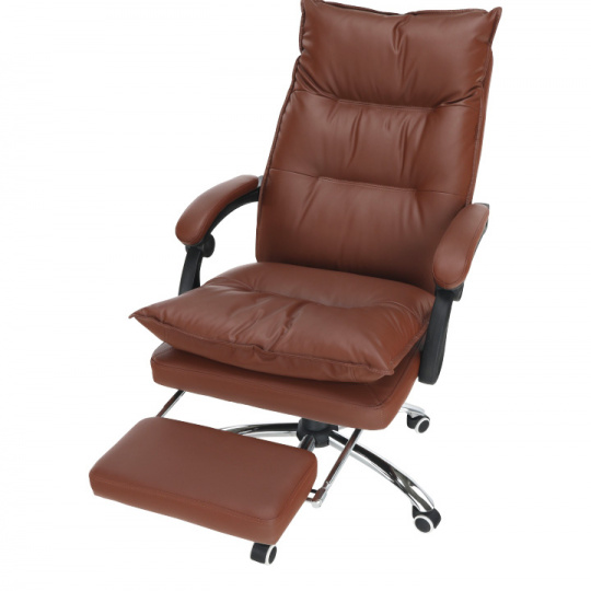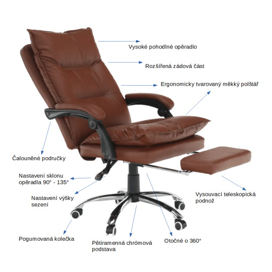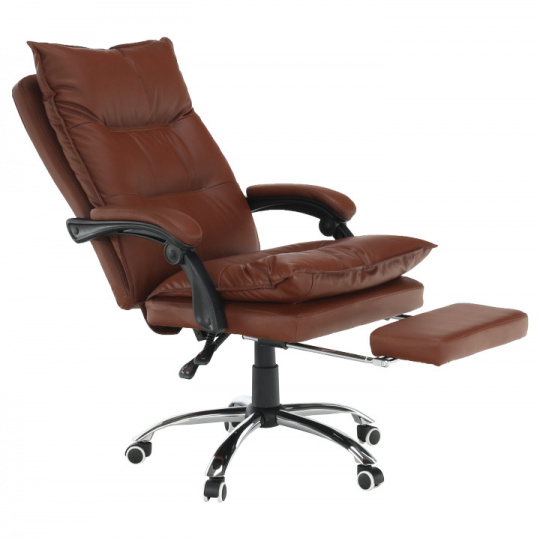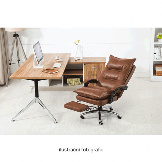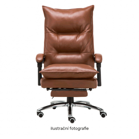 Kancelářské křeslo DRAKE s polohovací opěrkou zad a výsuvnou podnoží. Materiál: ekokůže / kov Oděruodolnost ekokůže podle testu Martindale: 100 000 oděrek Barva: hnědá / chrom Rozměry (ŠxHxV): 72x85x111-118 cm Výška sedu: 56-64 cm Hloubka sedu: 51 Výška od země po opěrku na ruce: 67-75 cm Nosnost: 110 kg Opěrka zad (ŠxV): 53x68 cm Sedadlo (ŠxH): 53x50 cm Výsuvná teleskopická podnož Otočná o 360 ° Nastavení sklonu opěradla 90 ° - 135 ° S ergonomickými polštáři na opěradle a sedadle Možnost nastavit výšku sedu Rozšířená zádová část Čalouněné plastové područky Pětiprvková chromová podstava Univerzální kolečka vhodná pro měkké i tvrdé podlahy Dodávané v demontu