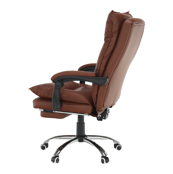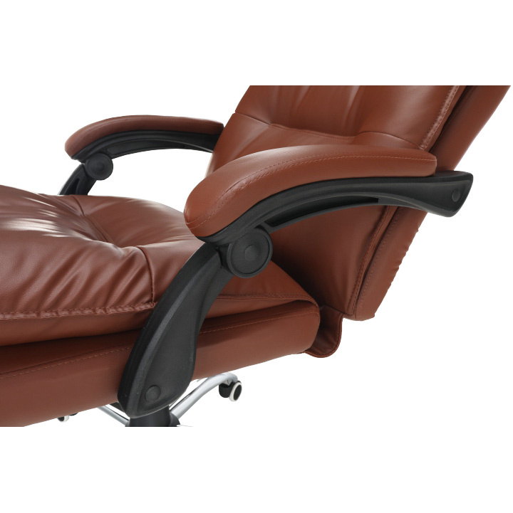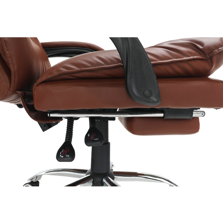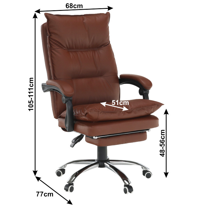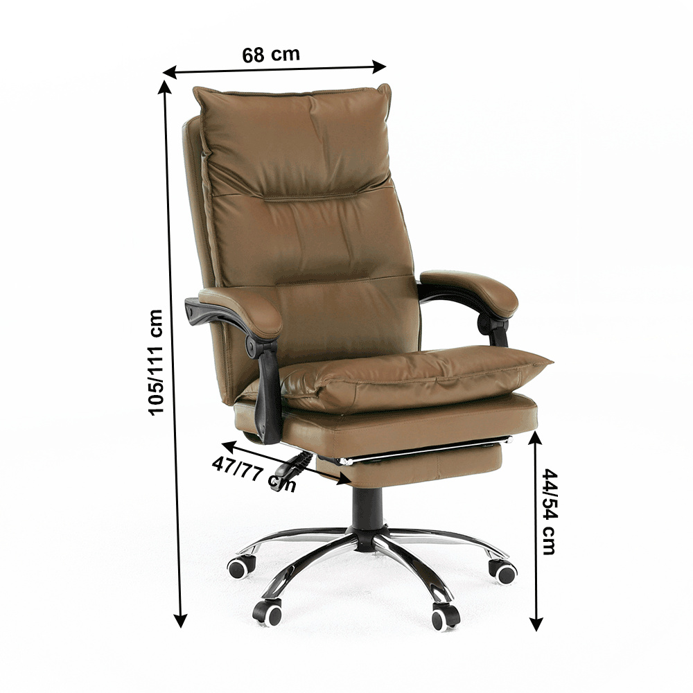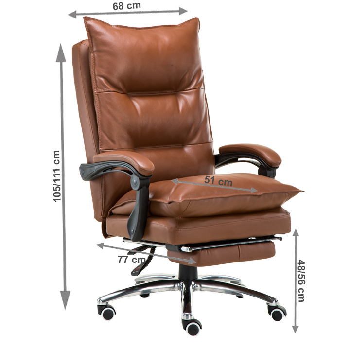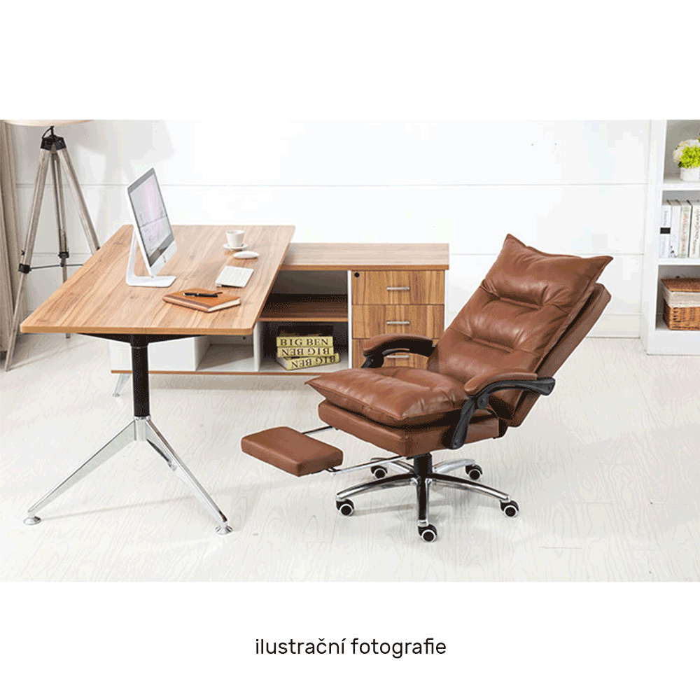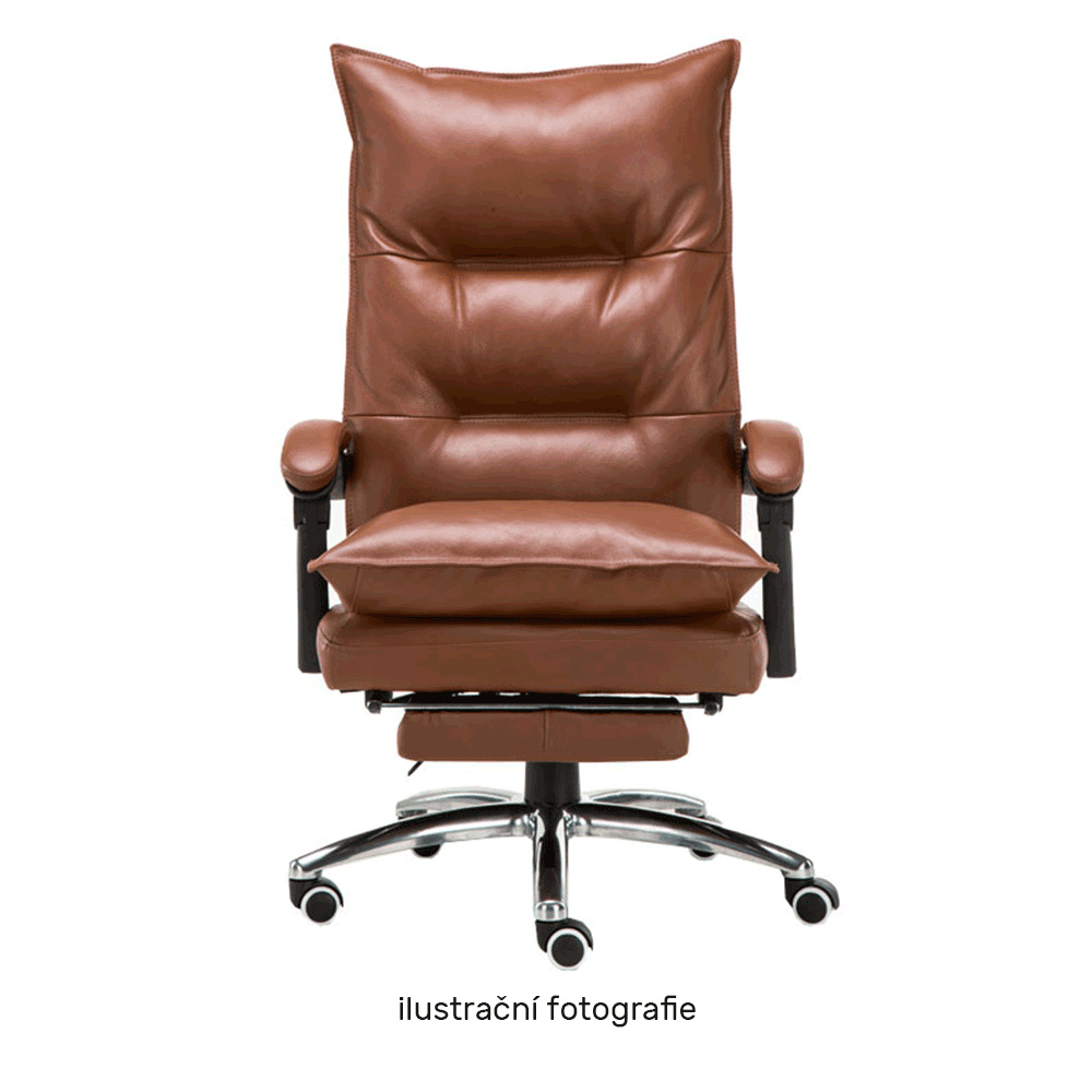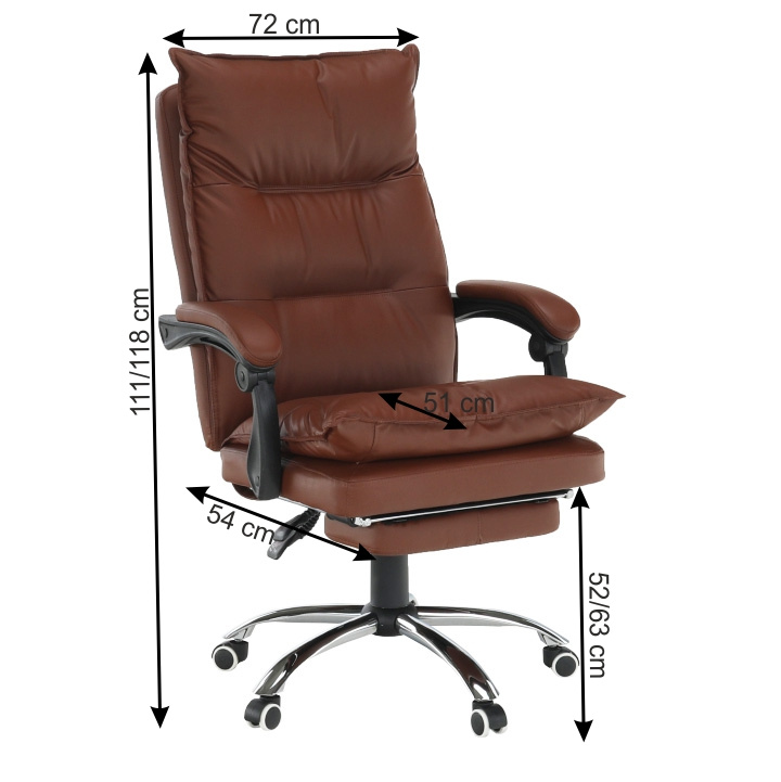 Kancelářské křeslo DRAKE s polohovací opěrkou zad a výsuvnou podnoží. Materiál: ekokůže / kov Oděruodolnost ekokůže podle testu Martindale: 100 000 oděrek Barva: hnědá / chrom Rozměry (ŠxHxV): 72x85x111-118 cm Výška sedu: 56-64 cm Hloubka sedu: 51 Výška od země po opěrku na ruce: 67-75 cm Nosnost: 110 kg Opěrka zad (ŠxV): 53x68 cm Sedadlo (ŠxH): 53x50 cm Výsuvná teleskopická podnož Otočná o 360 ° Nastavení sklonu opěradla 90 ° - 135 ° S ergonomickými polštáři na opěradle a sedadle Možnost nastavit výšku sedu Rozšířená zádová část Čalouněné plastové područky Pětiprvková chromová podstava Univerzální kolečka vhodná pro měkké i tvrdé podlahy Dodávané v demontu