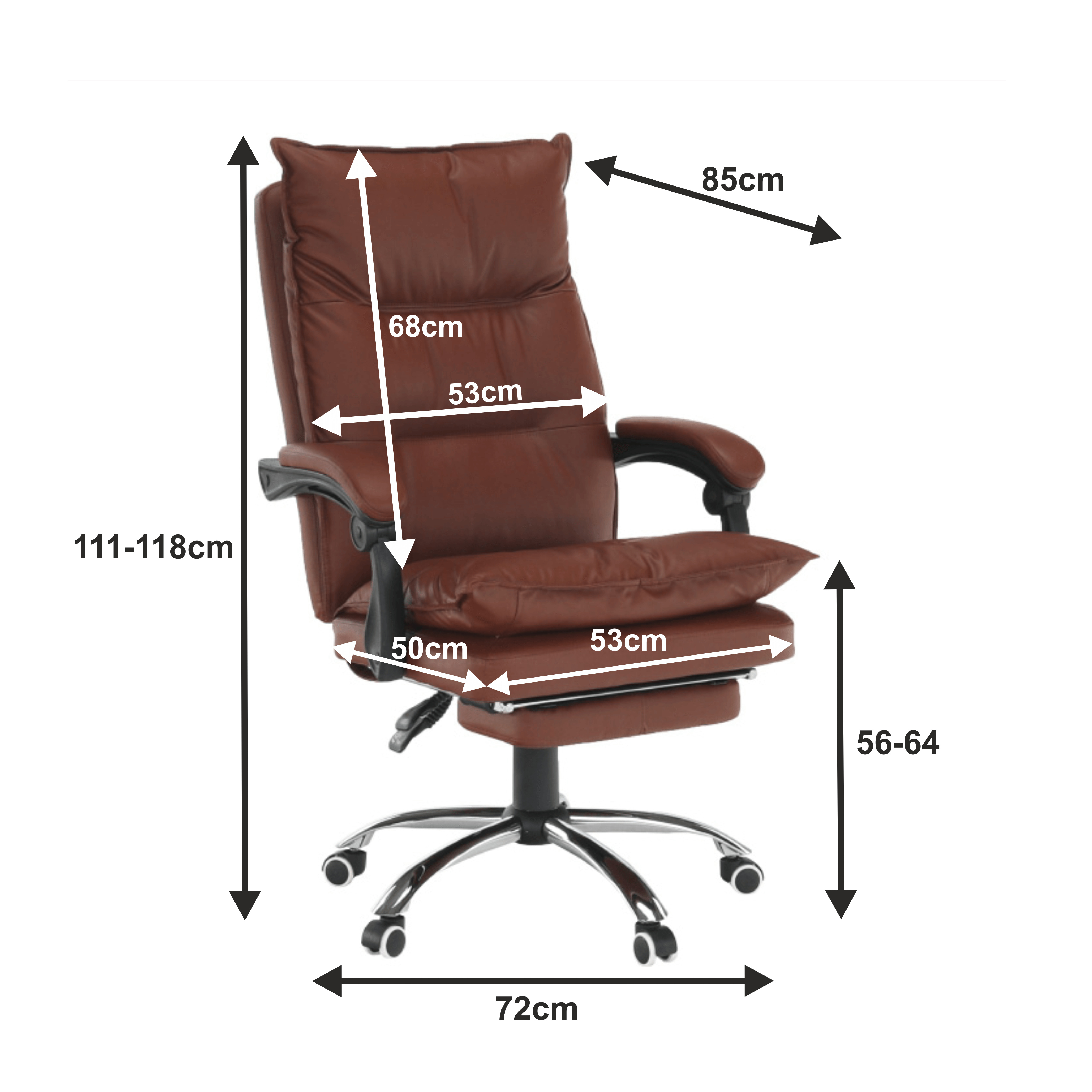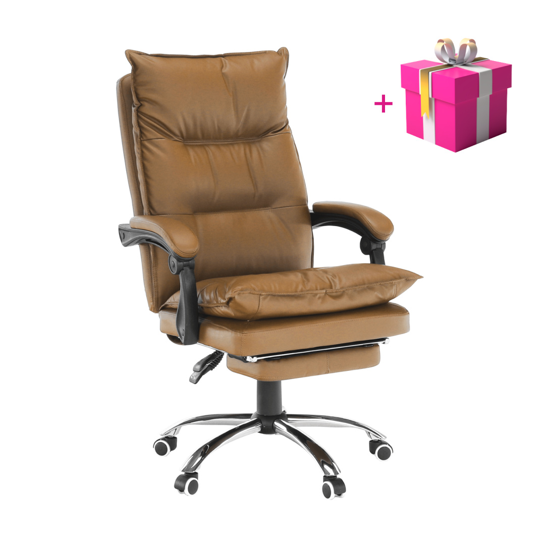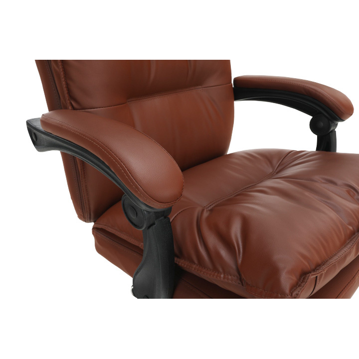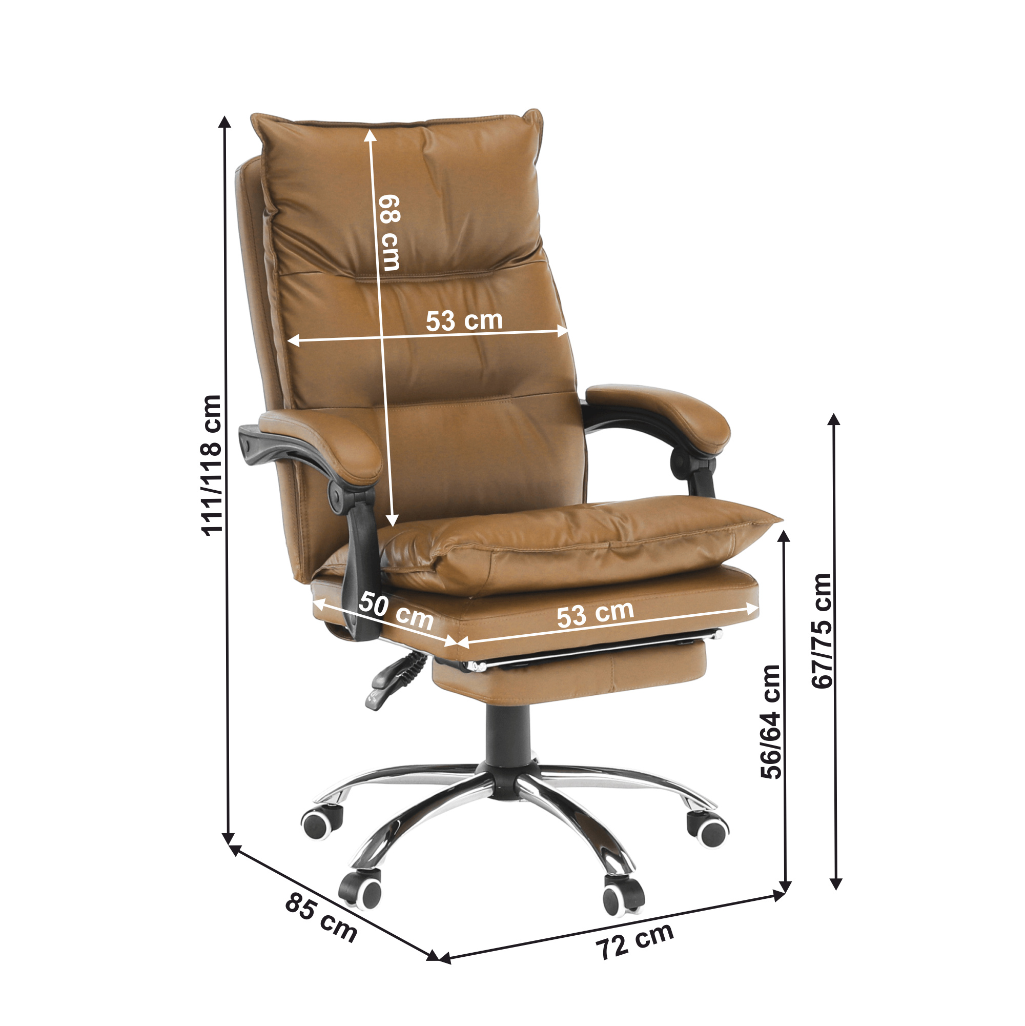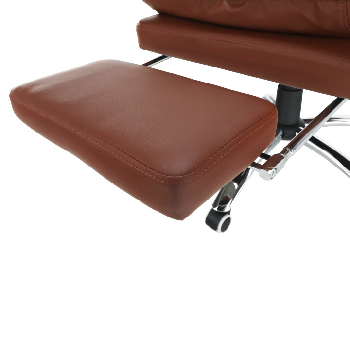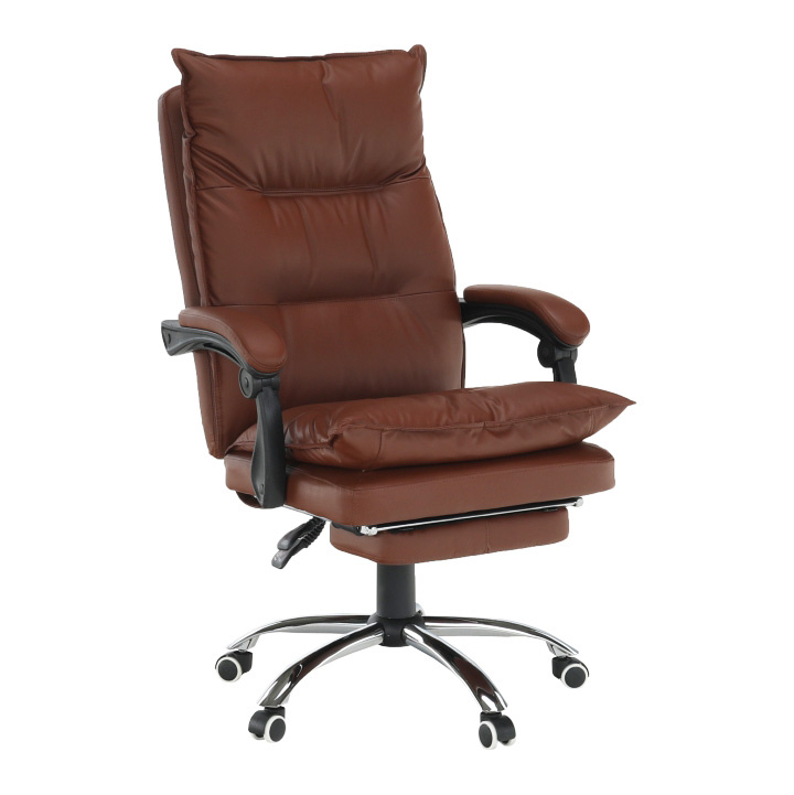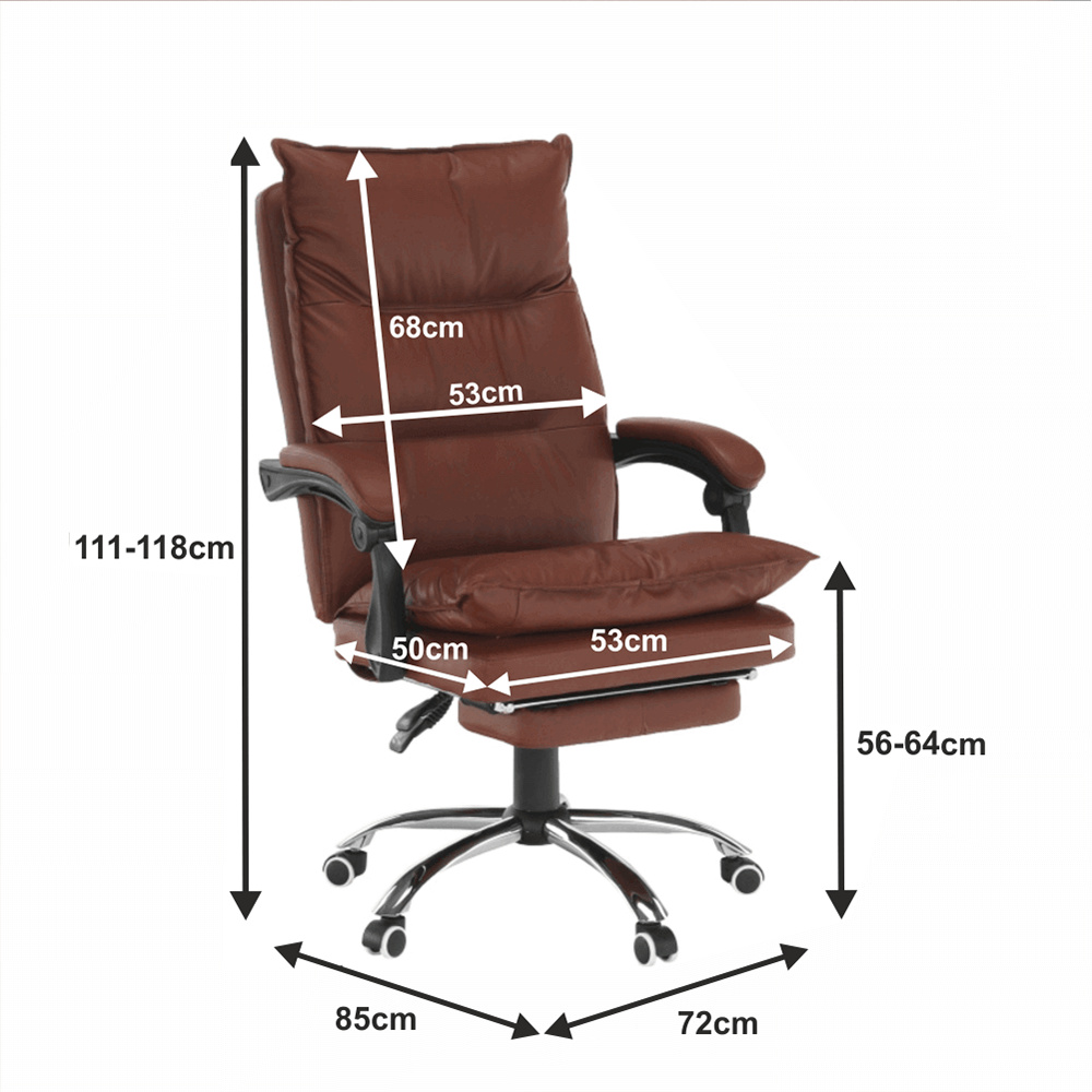 Kancelářské křeslo DRAKE s polohovací opěrkou zad a výsuvnou podnoží. Materiál: ekokůže / kov Oděruodolnost ekokůže podle testu Martindale: 100 000 oděrek Barva: hnědá / chrom Rozměry (ŠxHxV): 72x85x111-118 cm Výška sedu: 56-64 cm Hloubka sedu: 51 Výška od země po opěrku na ruce: 67-75 cm Nosnost: 110 kg Opěrka zad (ŠxV): 53x68 cm Sedadlo (ŠxH): 53x50 cm Výsuvná teleskopická podnož Otočná o 360 ° Nastavení sklonu opěradla 90 ° - 135 ° S ergonomickými polštáři na opěradle a sedadle Možnost nastavit výšku sedu Rozšířená zádová část Čalouněné plastové područky Pětiprvková chromová podstava Univerzální kolečka vhodná pro měkké i tvrdé podlahy Dodávané v demontu
