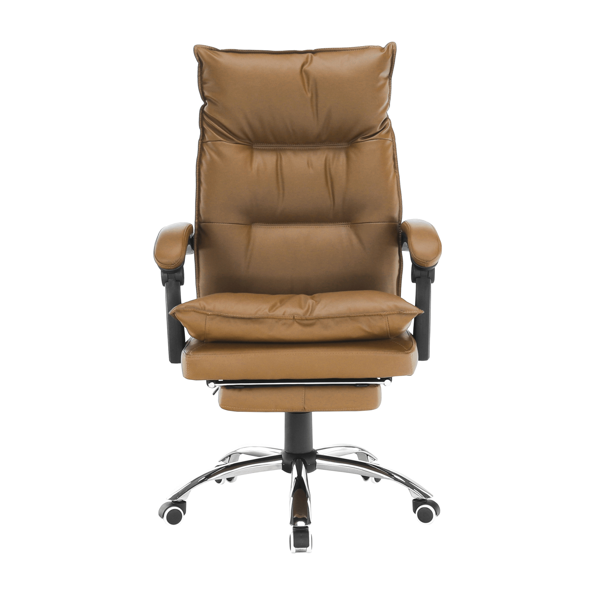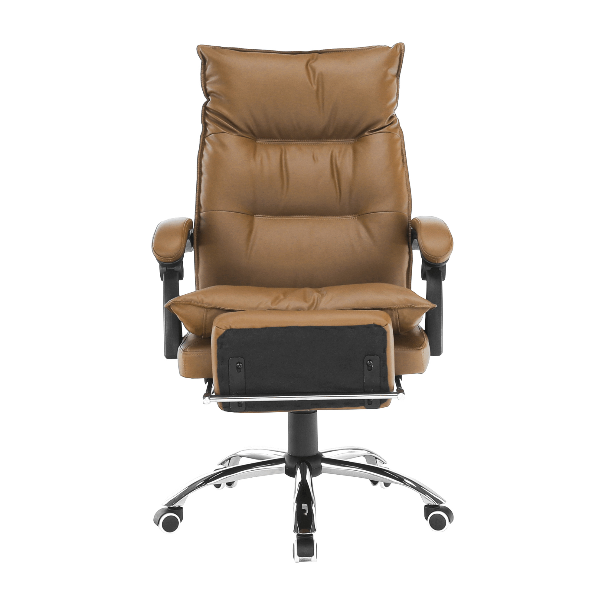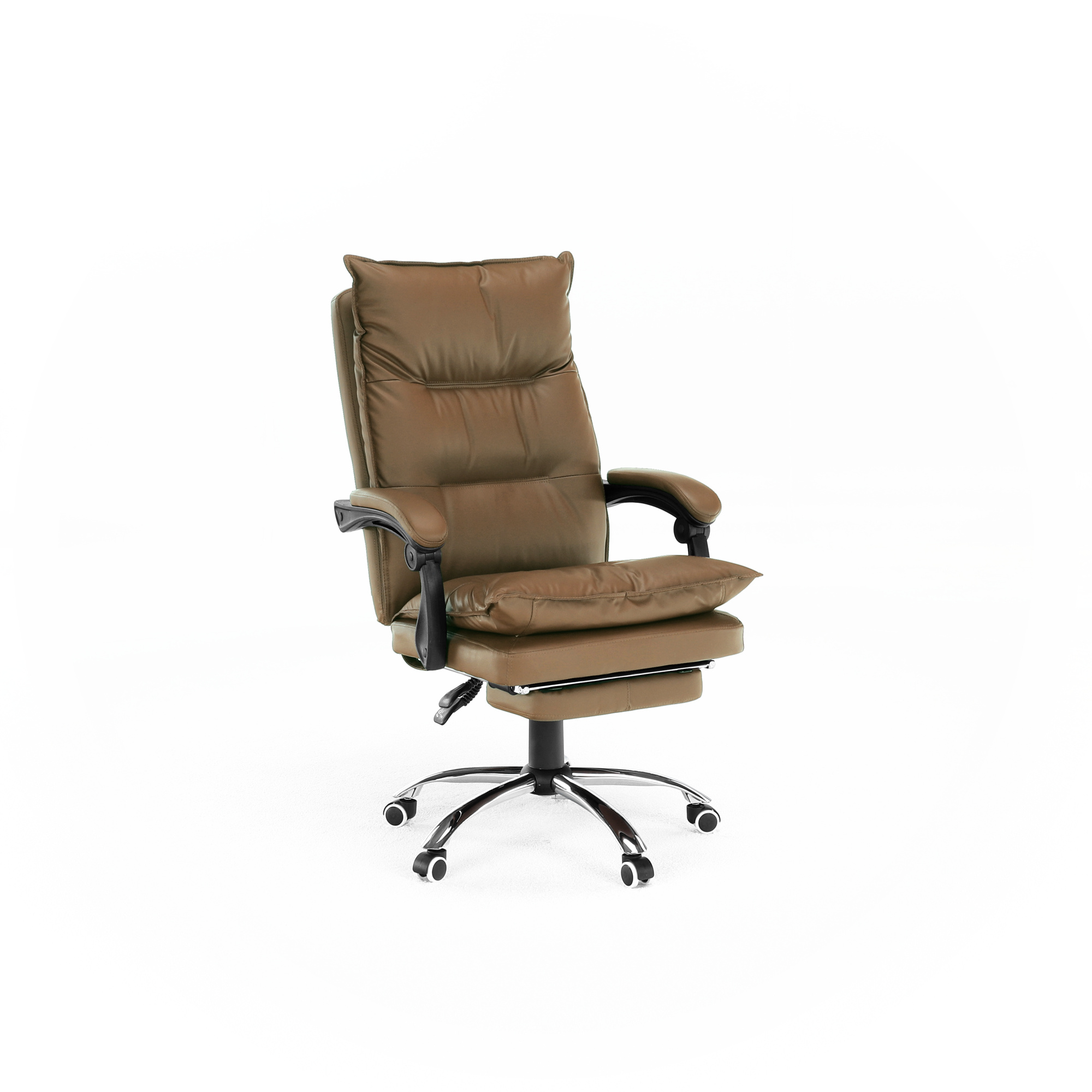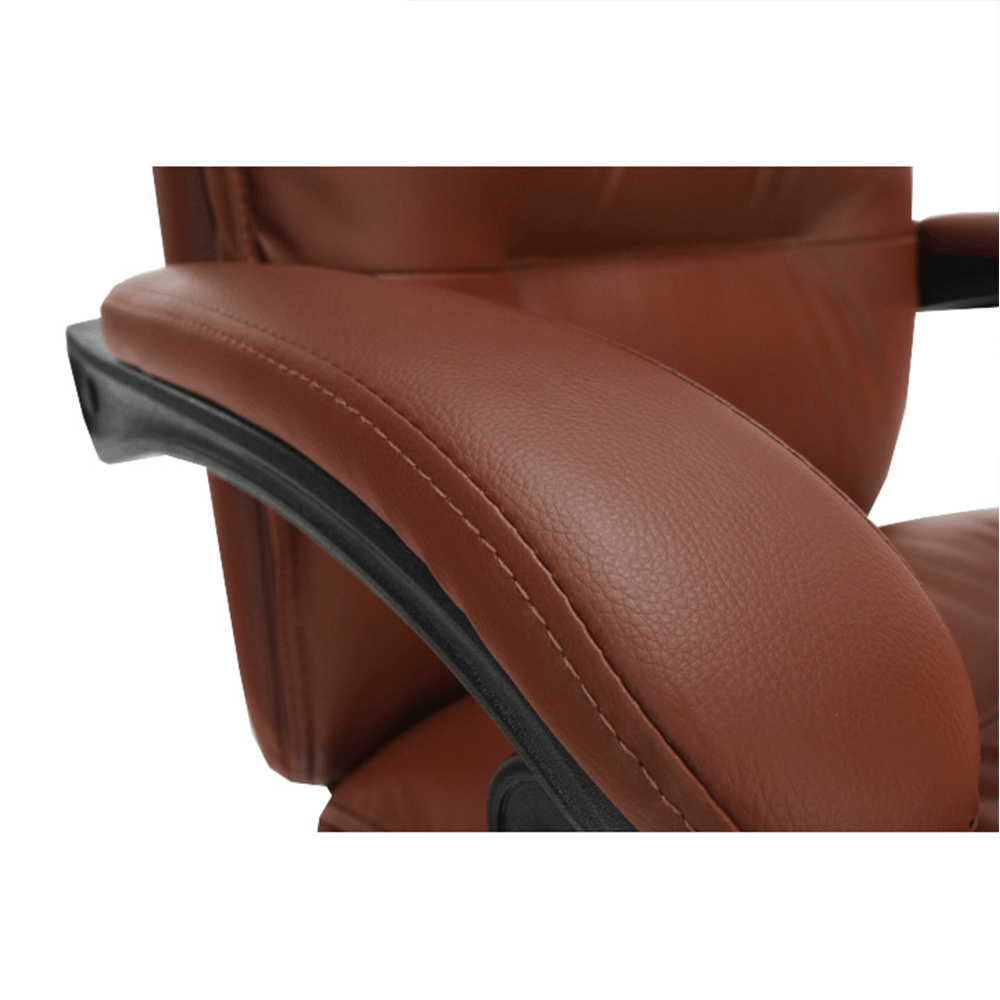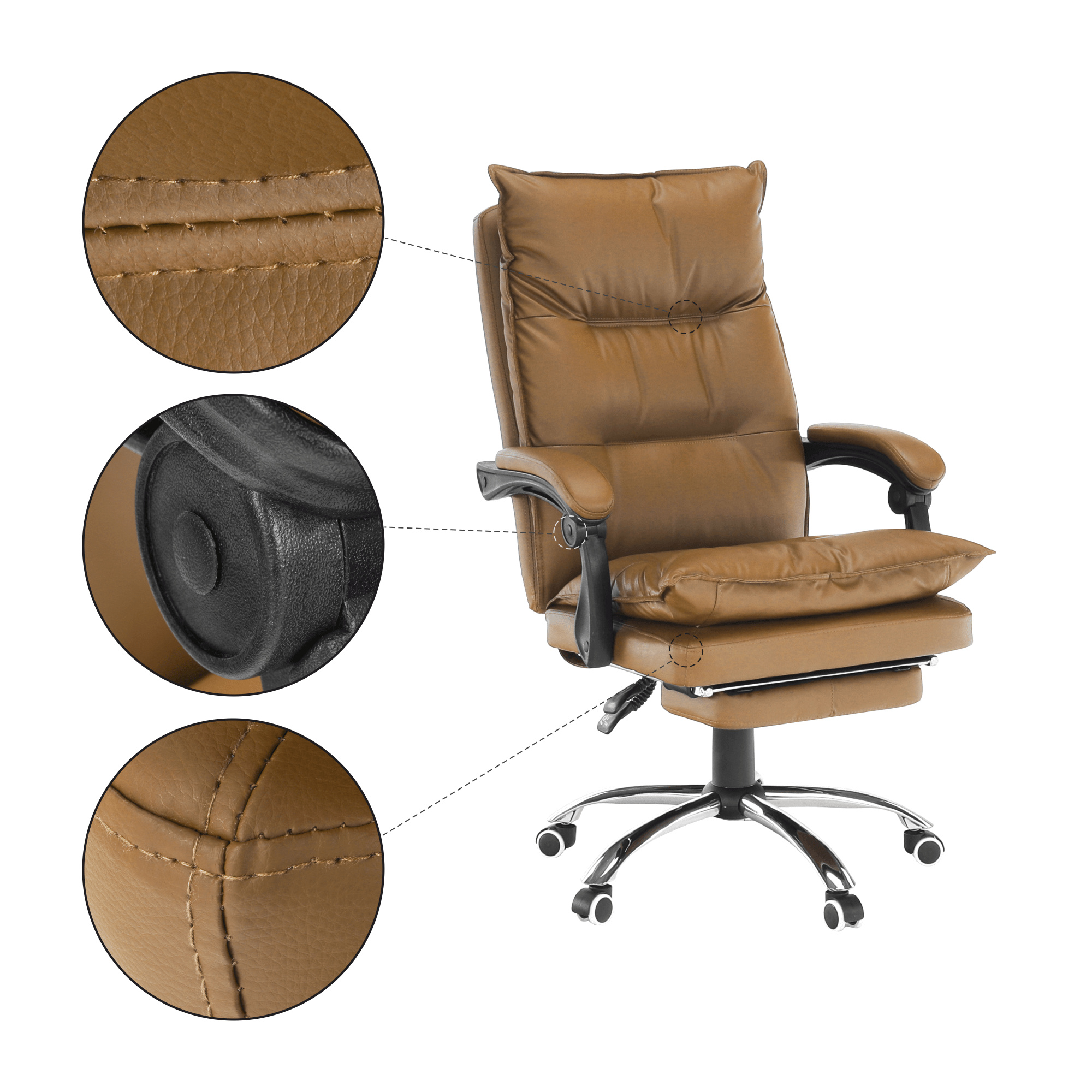 Kancelářské křeslo DRAKE s polohovací opěrkou zad a výsuvnou podnoží. Materiál: ekokůže / kov Oděruodolnost ekokůže podle testu Martindale: 100 000 oděrek Barva: hnědá / chrom Rozměry (ŠxHxV): 72x85x111-118 cm Výška sedu: 56-64 cm Hloubka sedu: 51 Výška od země po opěrku na ruce: 67-75 cm Nosnost: 110 kg Opěrka zad (ŠxV): 53x68 cm Sedadlo (ŠxH): 53x50 cm Výsuvná teleskopická podnož Otočná o 360 ° Nastavení sklonu opěradla 90 ° - 135 ° S ergonomickými polštáři na opěradle a sedadle Možnost nastavit výšku sedu Rozšířená zádová část Čalouněné plastové područky Pětiprvková chromová podstava Univerzální kolečka vhodná pro měkké i tvrdé podlahy Dodávané v demontu