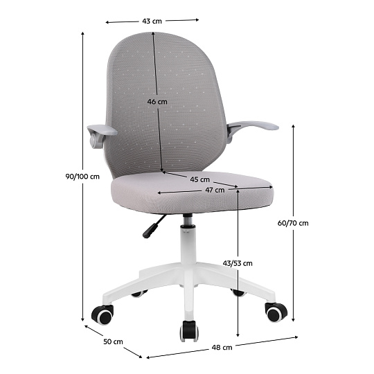 Materiál: síťovina/plast Oděruodolnost textilie podle testu Martindale: 15 000 oděrů Barva: šedá/bílá Rozměry (ŠxHxV): 48x50x90-100 cm Výška sedu: 43-53 cm Šířka sedu: 47 cm Hloubka sedu: 45 cm Výška zádové opěrky: 46 cm Šířka zádové opěrky: 43 cm Nosnost: 100 kg Nastavitelná výška sedu S opěrkami na ruce Sklopné opěrky na ruce Výška od země po opěrku na ruce: 60-70 cm Otočné Univerzální kolečka Vhodné pro tvrdé i měkké podlahy Pětiramenná podstava Dodáváno v demontu