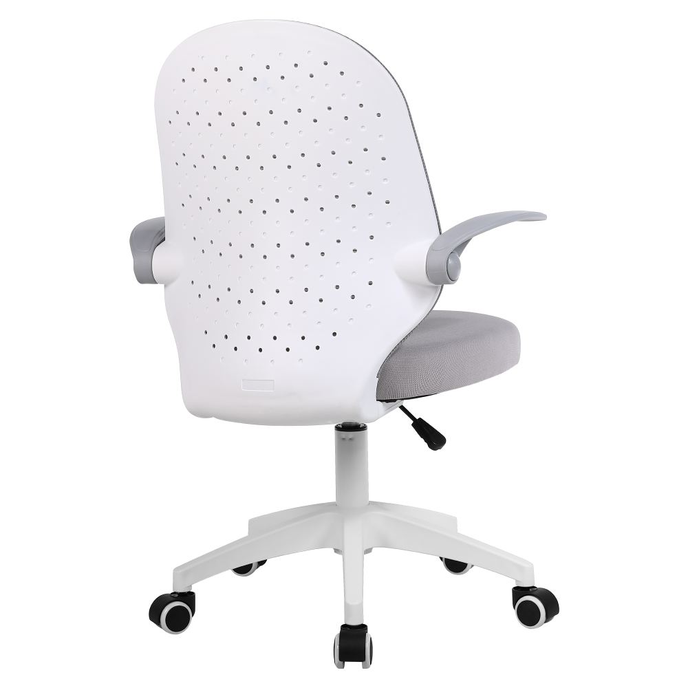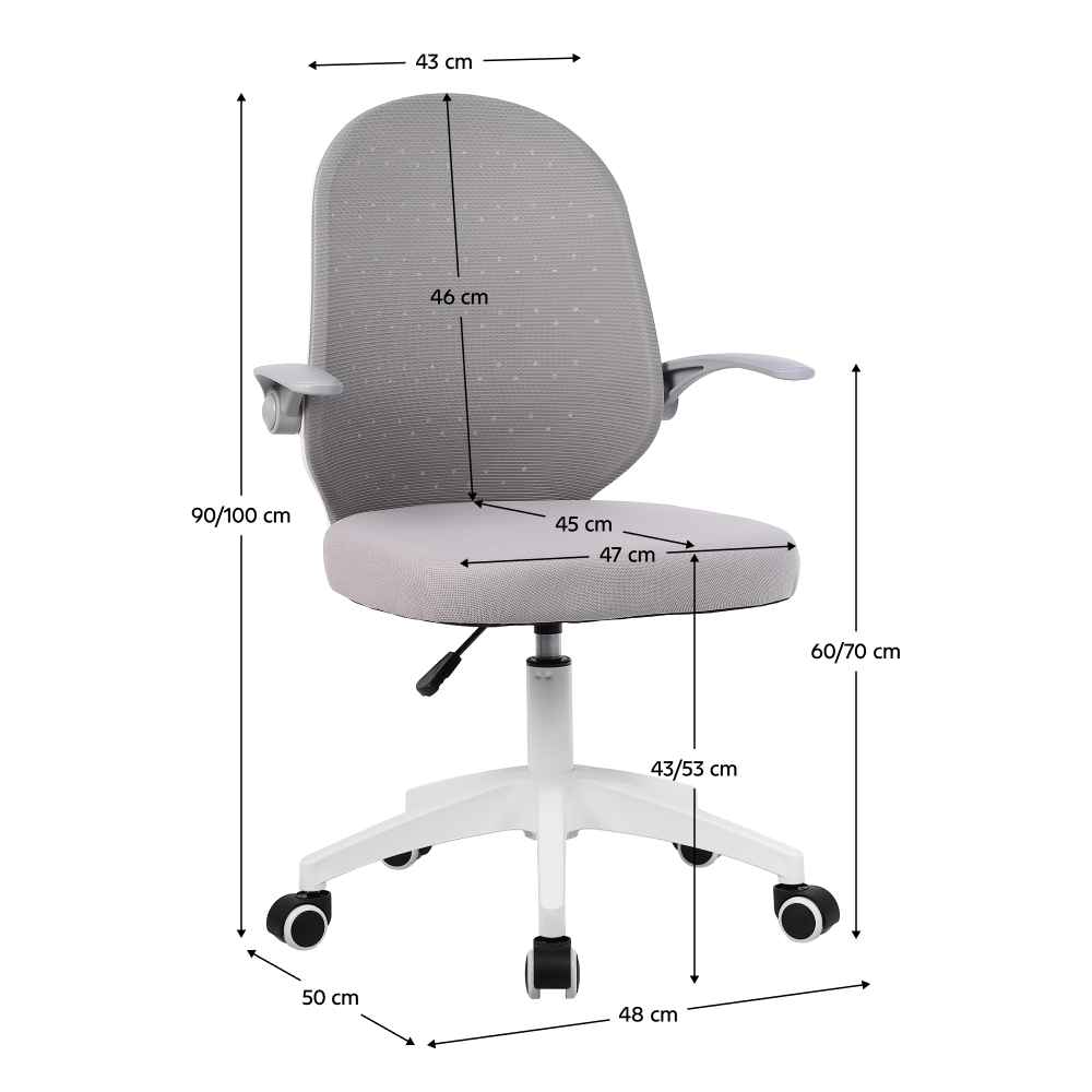 Materiál: síťovina/plast Oděruodolnost textilie podle testu Martindale: 15 000 oděrů Barva: šedá/bílá Rozměry (ŠxHxV): 48x50x90-100 cm Výška sedu: 43-53 cm Šířka sedu: 47 cm Hloubka sedu: 45 cm Výška zádové opěrky: 46 cm Šířka zádové opěrky: 43 cm Nosnost: 100 kg Nastavitelná výška sedu S opěrkami na ruce Sklopné opěrky na ruce Výška od země po opěrku na ruce: 60-70 cm Otočné Univerzální kolečka Vhodné pro tvrdé i měkké podlahy Pětiramenná podstava Dodáváno v demontu