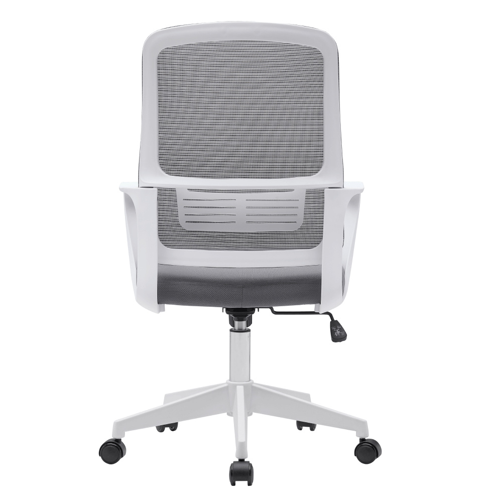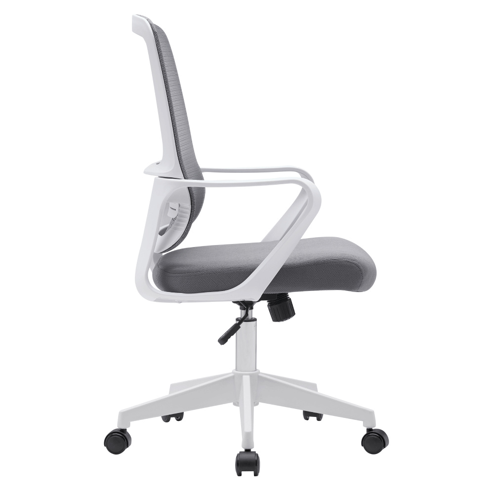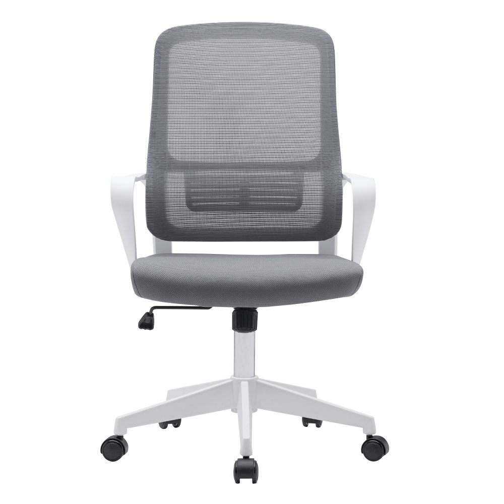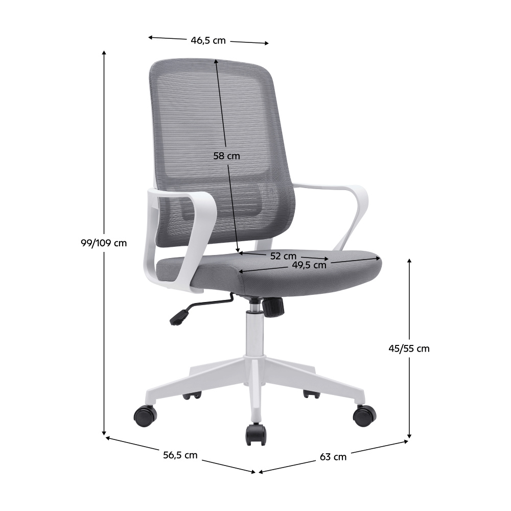 Materiál: síťovina/látka/plast Oděruodolnost síťoviny podle testu Martindale: 90 000 oděrů Oděruodolnost látky podle testu Martindale: 85 000 oděrů Barva: šedá/bílá Rozměry (ŠxHxV): 63x61x99-109 cm Výška sedu: 45-55 cm Hloubka sedu: 52 cm Šířka sedu: 51,5 cm Výška zádové opěrky: 58 cm Šířka zádové opěrky: 44 cm Nosnost: 100 kg Možnost nastavit výšku sedu Pětiramenná plastová podstava Univerzální kolečka Vhodné pro tvrdé i měkké podlahy Mechanismus houpání Dodáváno v demontu