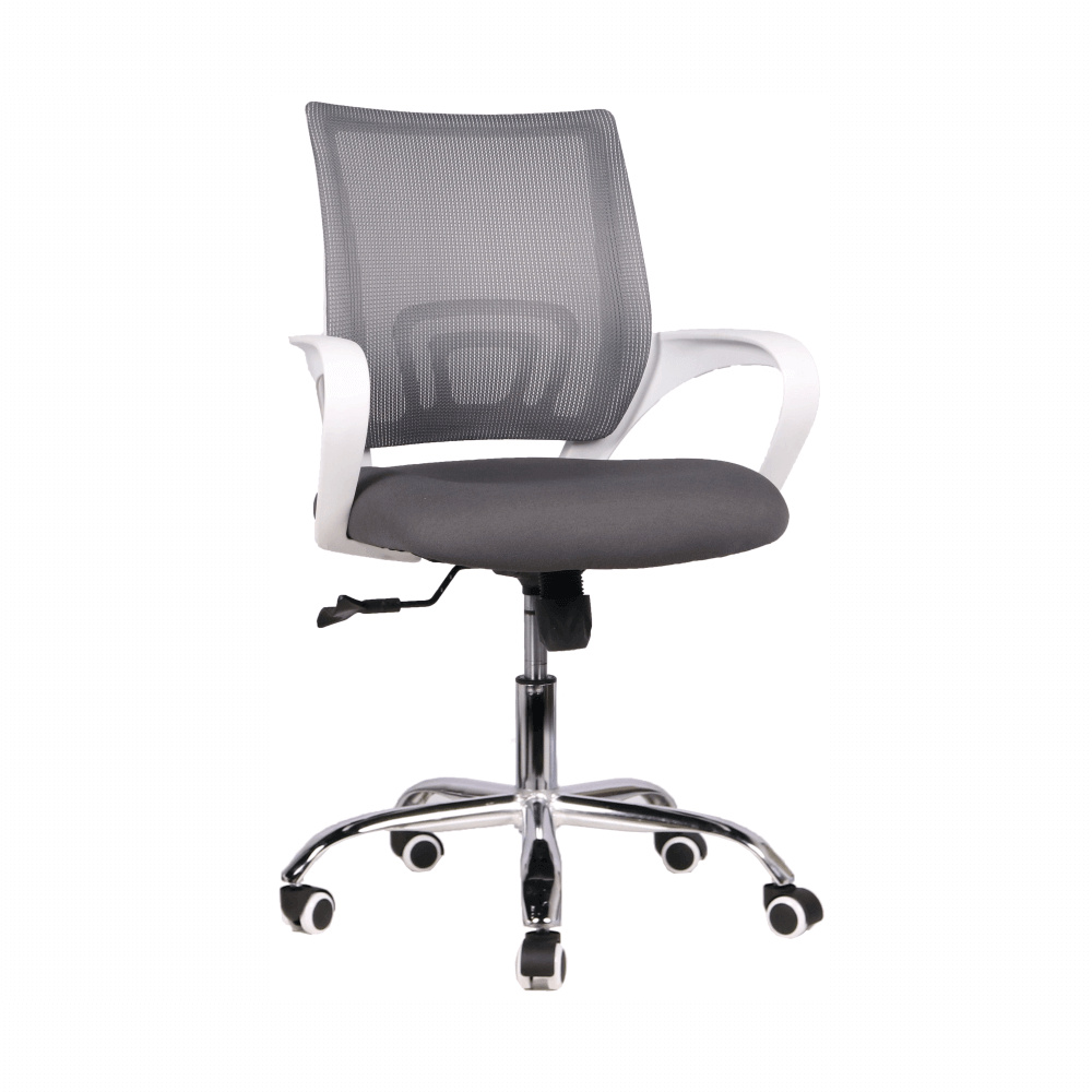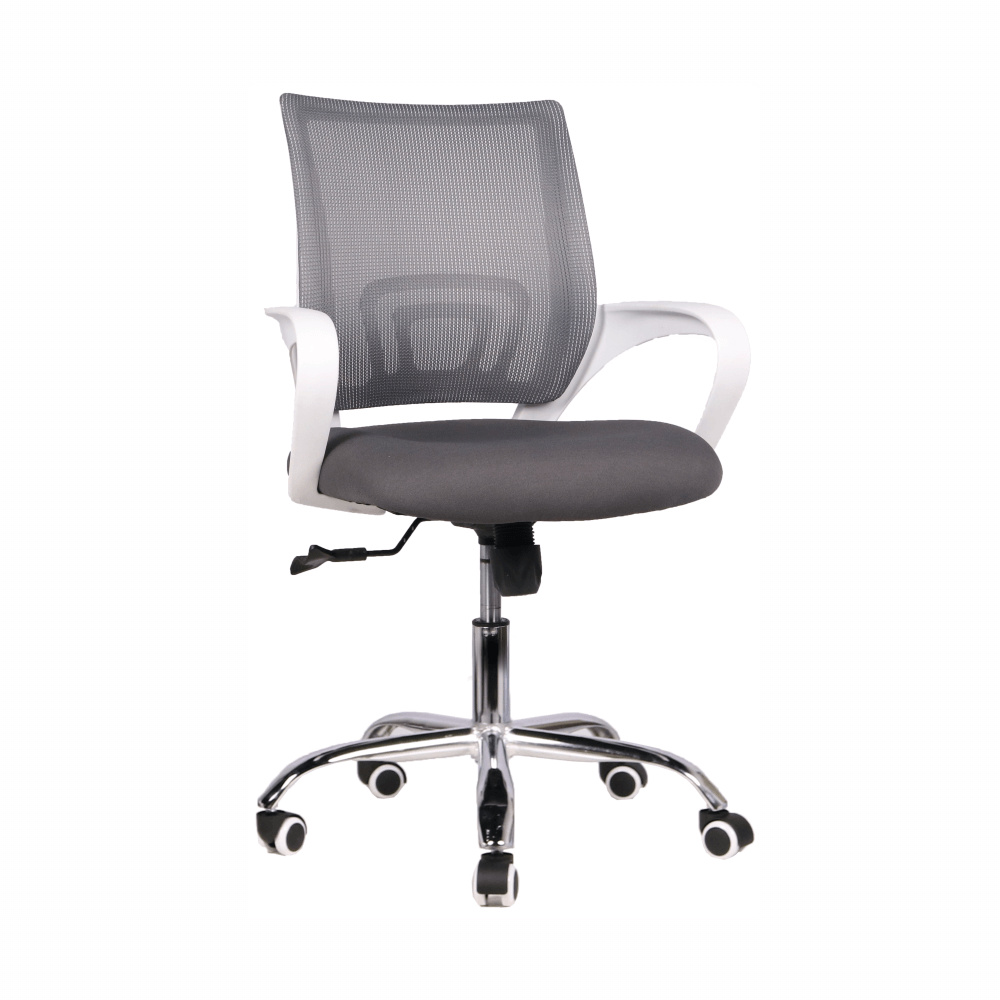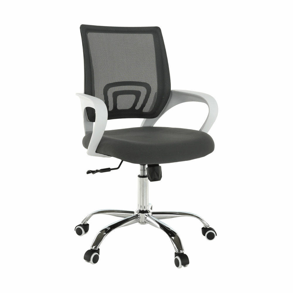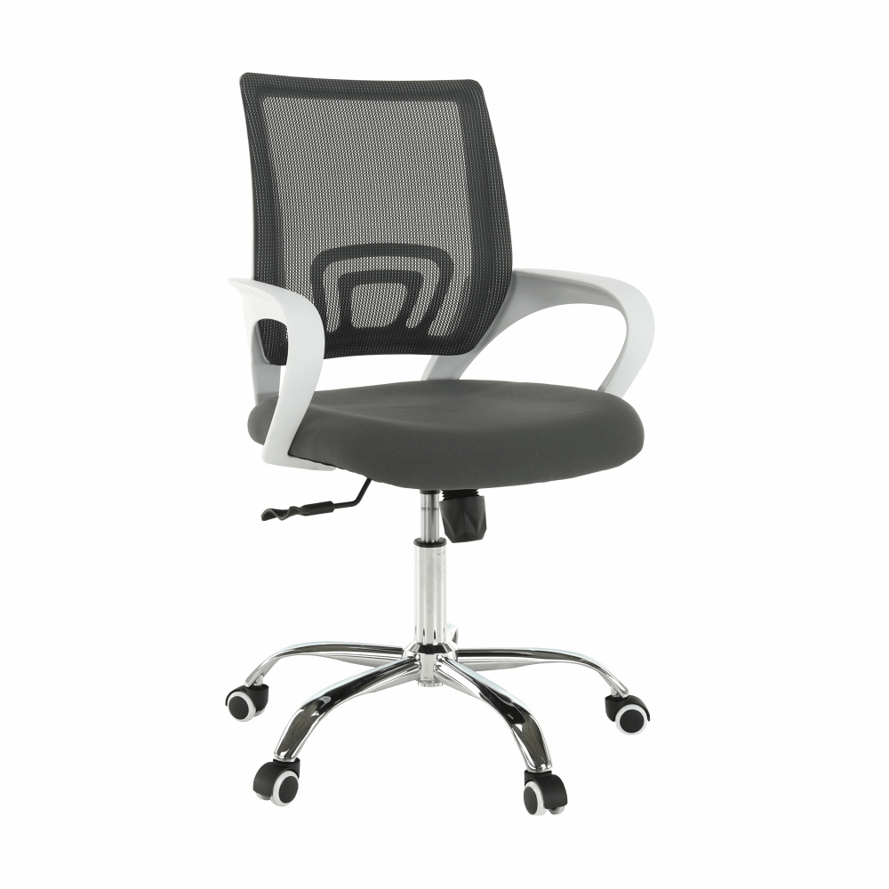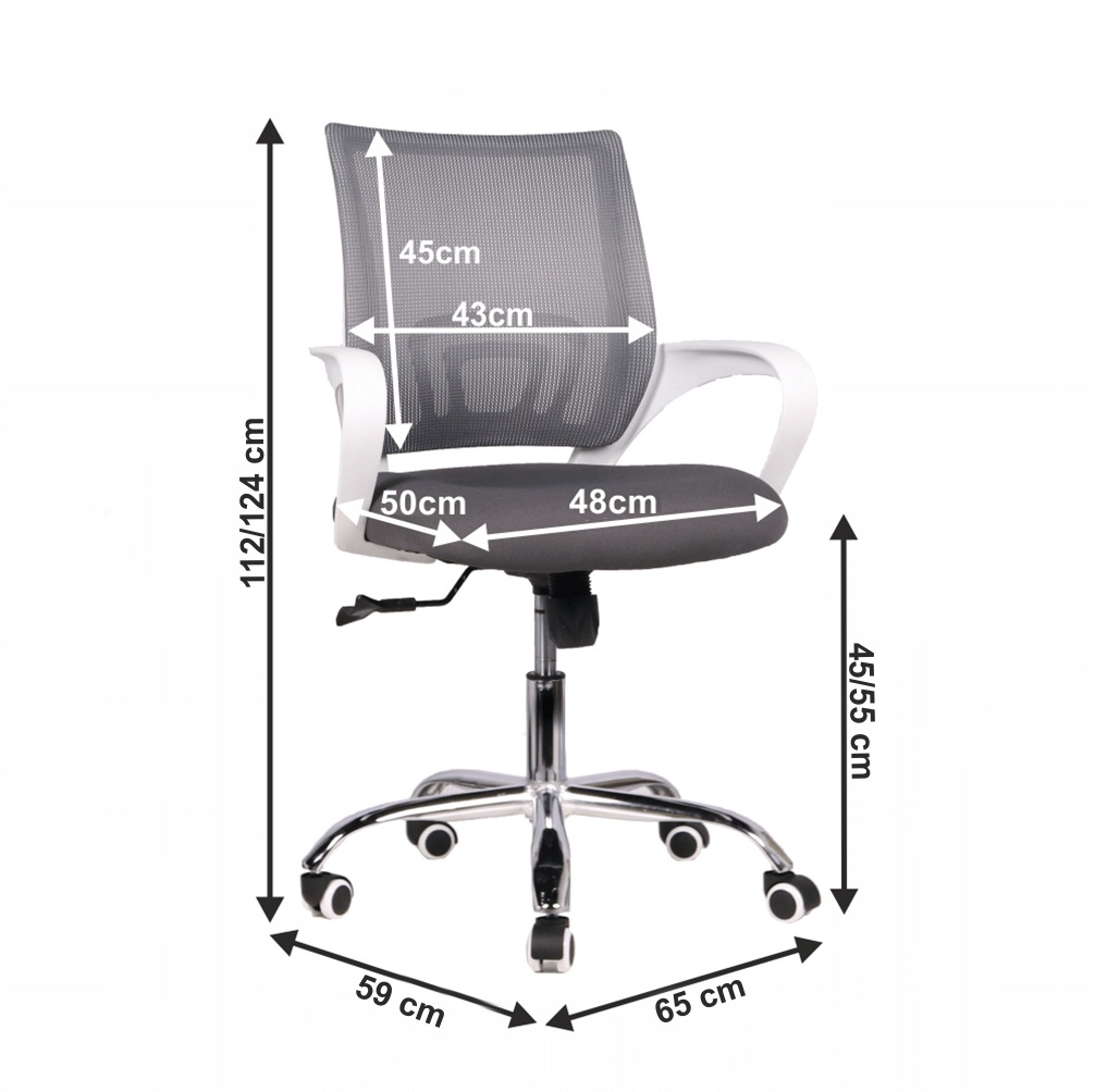 Materiál: látka / plast / kov Oděruodolnost textilie podle testu Martindale: 90 000 oděrek Barva: šedá / bílá / chromovaná Rozměry (ŠxHxV): 60x50x91-103 cm Nastavitelná výška sedu: 49-60 cm Hloubka sedu: 50 cm Šířka sedu: 48 cm Výška zádové opěrky (bez opěrky hlavy): 45 cm Šířka zádové opěrky: 43 cm Nosnost: 100 kg Univerzální kolečka vhodná pro měkké i tvrdé podlahy mechanismus houpání Plastová pěticípá růžice Plastové područky Plastová bederní podpěra Dodávané v demontu
