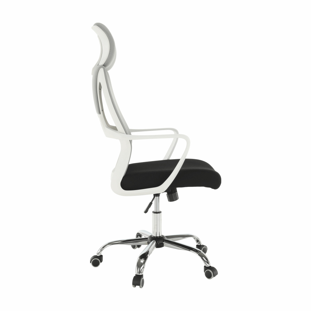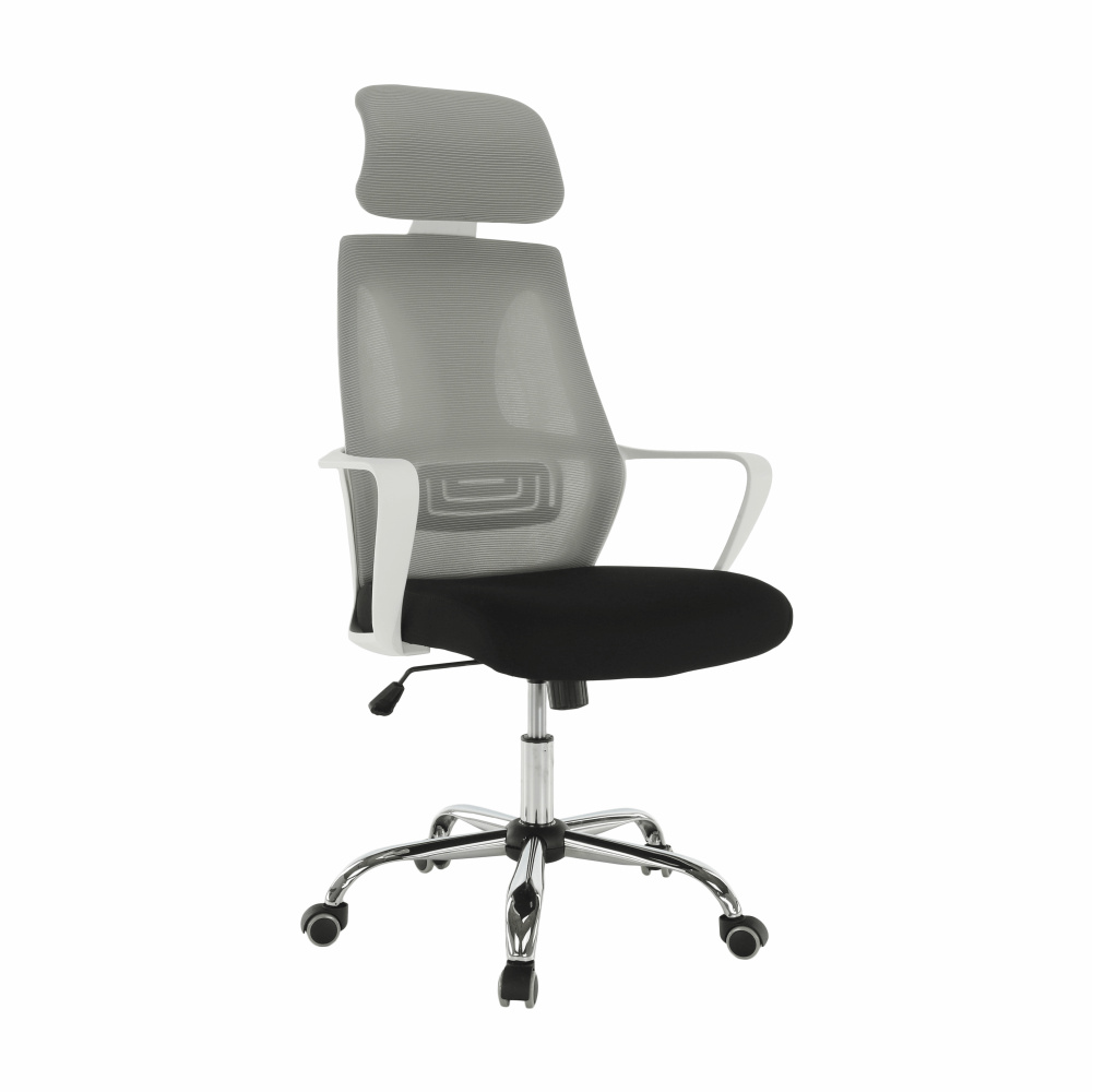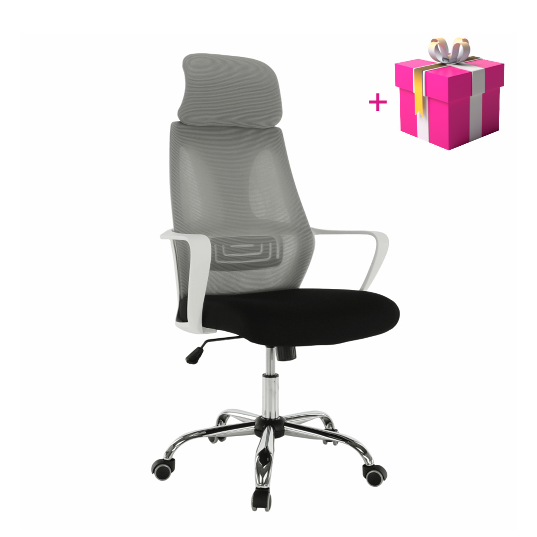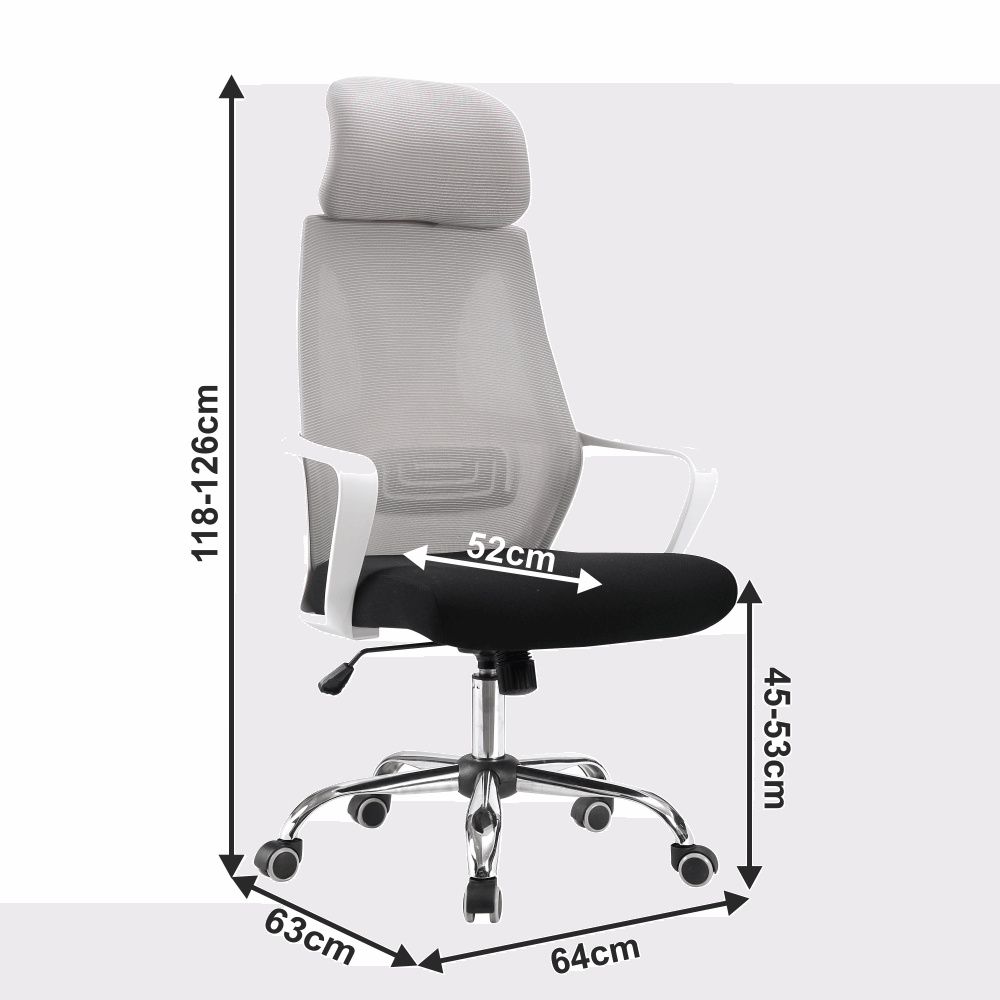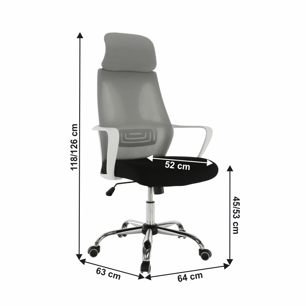 Materiál: látka / plast / kov Oděruodolnost textilie podle testu Martindale: 90 000 oděrek Barva: šedá / černá / bílá Rozměry (ŠxHxV): 64x63x118-126 cm Nastavitelná výška sedu: 45-53 cm Hloubka sedu: 52 cm Šířka sedu: 50 cm Výška zádové opěrky: 76-79,5 cm Šířka zádové opěrky: 49 cm Nosnost: 110 kg S opěrkou hlavy S područkami mechanismus houpání chromová podstava Univerzální kolečka vhodná pro měkké i tvrdé podlahy Dodávané v demontu