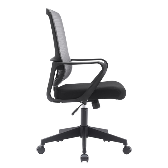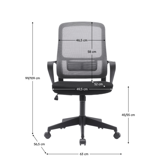 Materiál: síťovina/látka/plast Oděruodolnost síťoviny podle testu Martindale: 90 000 oděrů Oděruodolnost látky podle testu Martindale: 85 000 oděrů Barva: šedá/černá Rozměry (ŠxHxV): 63x56,5x99-109 cm Výška sedu: 45-55 cm Hloubka sedu: 52 cm Šířka sedu: 49,5 cm Výška zádové opěrky: 58 cm Šířka zádové opěrky: 46,5cm Nosnost: 100 kg Možnost nastavit výšku sedu Pětiramenná plastová podstava Univerzální kolečka Vhodné pro tvrdé i měkké podlahy Mechanismus houpání Dodáváno v demontu