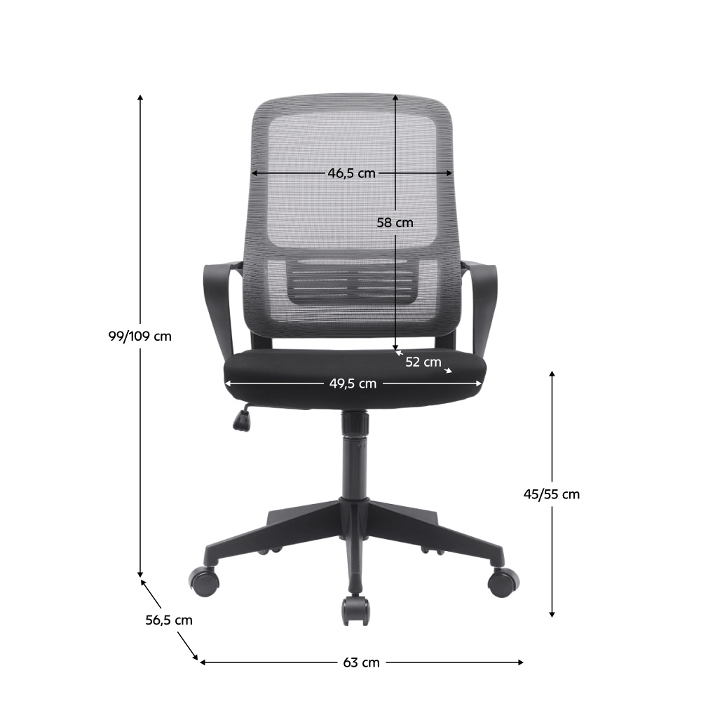 Materiál: síťovina/látka/plast Oděruodolnost síťoviny podle testu Martindale: 90 000 oděrů Oděruodolnost látky podle testu Martindale: 85 000 oděrů Barva: šedá/černá Rozměry (ŠxHxV): 63x56,5x99-109 cm Výška sedu: 45-55 cm Hloubka sedu: 52 cm Šířka sedu: 49,5 cm Výška zádové opěrky: 58 cm Šířka zádové opěrky: 46,5cm Nosnost: 100 kg Možnost nastavit výšku sedu Pětiramenná plastová podstava Univerzální kolečka Vhodné pro tvrdé i měkké podlahy Mechanismus houpání Dodáváno v demontu