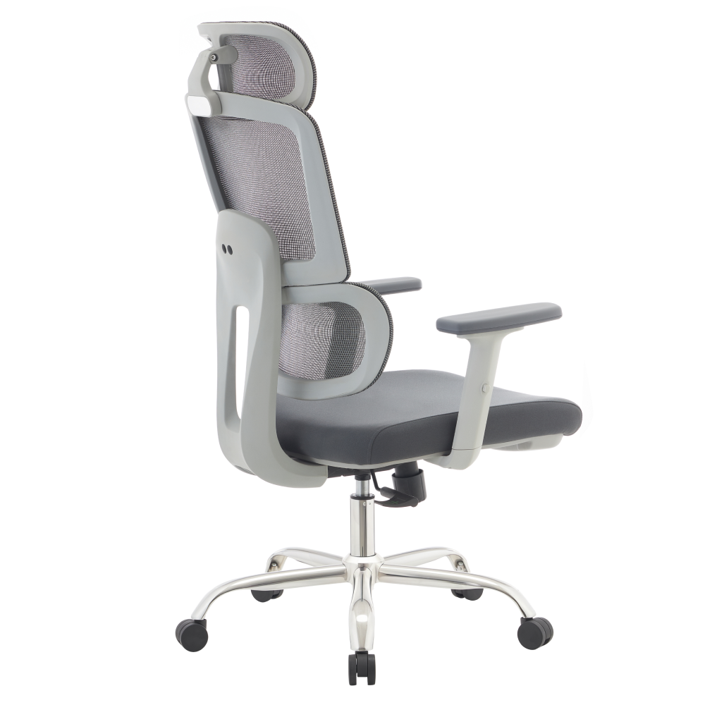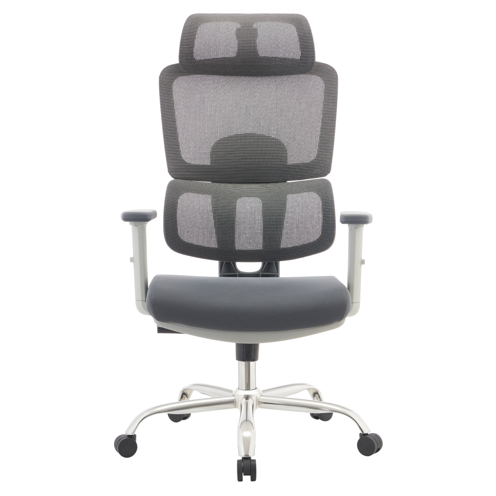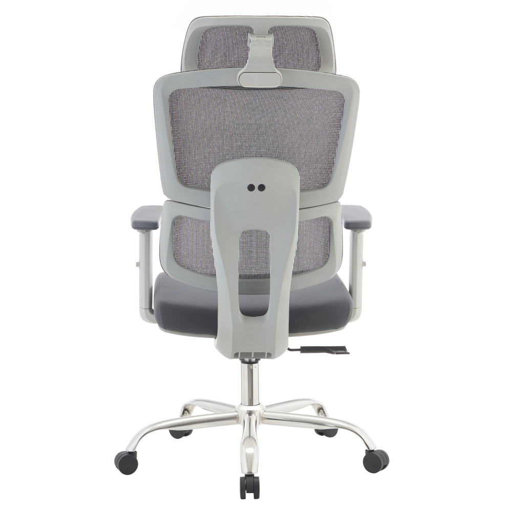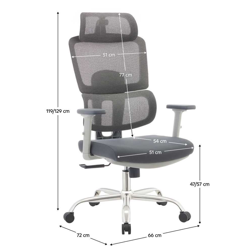 Materiál: síťovina/látka/plast/chrom Oděruodolnost síťoviny podle testu Martindale: 90 000 oděrů Oděruodolnost textilie podle testu Martindale: 80 000 oděrů Barva: šedá/chrom Rozměry (ŠxHxV): 66x72x119-129 cm Výška sedu: 47-57 cm Hloubka sedu: 54 cm Šířka sedu: 51 cm Šířka zádové opěrky: 51 cm Výška zádové opěrky: 77 cm Nosnost: 150 kg Otočná židle Mechanismus houpání Nastavitelná výška sedu S opěrkami na ruce Výškově nastavitelné opěrky na ruce S opěrkou hlavy Nastavitelný úhel opěrky hlavy Ergonomicky tvarovaná bederní část Praktická Dodáváno v demo