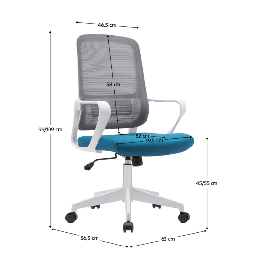 Materiál: síťovina/látka/plast Oděruodolnost síťoviny podle testu Martindale: 90 000 oděrů Oděruodolnost látky podle testu Martindale: 85 000 oděrů Barva: šedá/petrolejová/bílá Rozměry (ŠxHxV): 63x61x99-109 cm Výška sedu: 45-55 cm Hloubka sedu: 52 cm Šířka sedu: 51,5 cm Výška zádové opěrky: 58 cm Šířka zádové opěrky: 44 cm Nosnost: 100 kg Možnost nastavit výšku sedu Pětiramenná plastová podstava Univerzální kolečka Vhodné pro tvrdé i měkké podlahy Mechanismus houpání Dodáváno v demontu