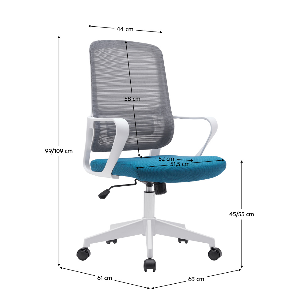 Materiál: síťovina/látka/plast Oděruodolnost síťoviny podle testu Martindale: 90 000 oděrů Oděruodolnost látky podle testu Martindale: 85 000 oděrů Barva: šedá/petrolejová/bílá Rozměry (ŠxHxV): 63x61x99-109 cm Výška sedu: 45-55 cm Hloubka sedu: 52 cm Šířka sedu: 51,5 cm Výška zádové opěrky: 58 cm Šířka zádové opěrky: 44 cm Nosnost: 100 kg Možnost nastavit výšku sedu Pětiramenná plastová podstava Univerzální kolečka Vhodné pro tvrdé i měkké podlahy Mechanismus houpání Dodáváno v demontu