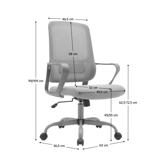 Materiál: síťovina/kov/plast Oděruodolnost síťoviny podle testu Martindale: 90 000 oděrů Barva: šedá Rozměry (ŠxHxV): 63x56,5x99-109 cm Výška sedu: 45-55 cm Hloubka sedu: 52 cm Šířka sedu: 49,5 cm Výška zádové opěrky: 58 cm Šířka zádové opěrky: 46,5cm Nosnost: 100 kg Možnost nastavit výšku sedu Pětiramenná kovová podstava Univerzální kolečka Vhodné pro tvrdé i měkké podlahy Mechanismus houpání Dodáváno v demontu
