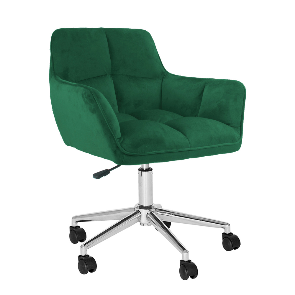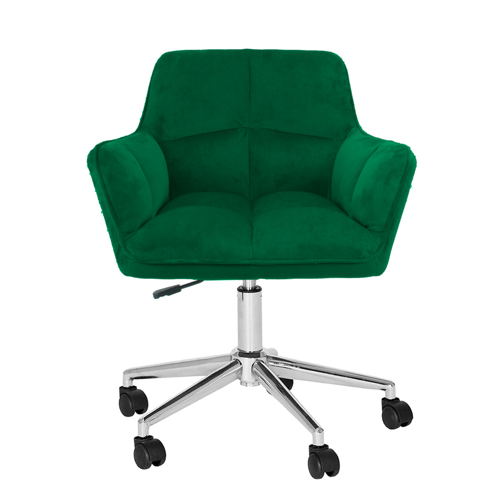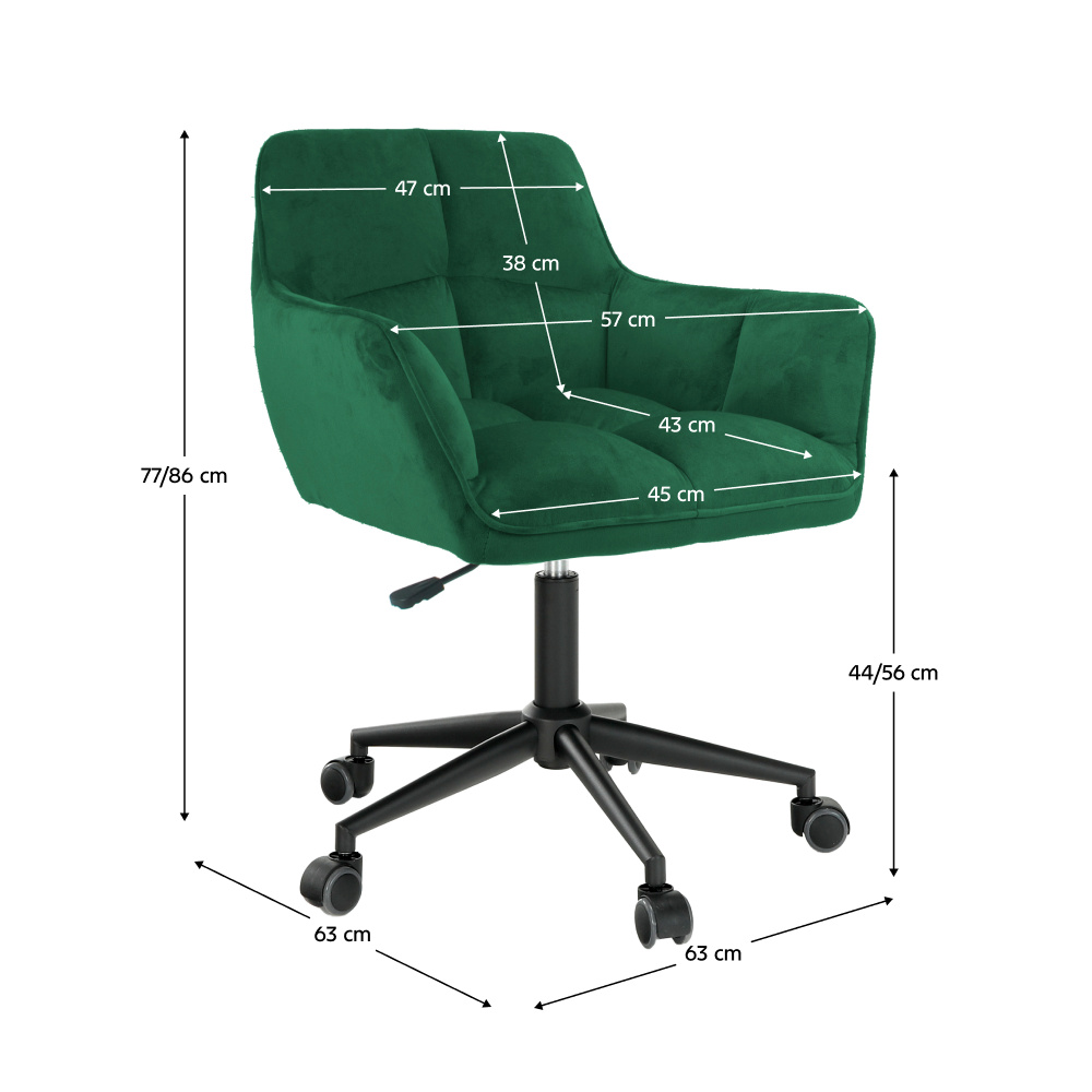 Materiál: látka Velvet/kov Oděruodolnost textilie podle testu Martindale: 85 000 oděrů Barva: smaragdová/černá Rozměry (ŠxHxV): 63x63x77/86 cm Nastavitelná výška sedu : 44/56 cm Hloubka sedu:43 cm Šířka sedu:45 cm Výška zádové opěrky:38 cm Šířka zádové opěrky:47 cm Maximální nosnost: 100 kg Nastavení výšky sedu Otočné sedátko Na kolečkách Dodáváno v demontu