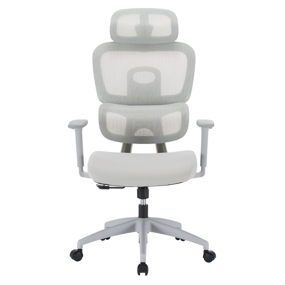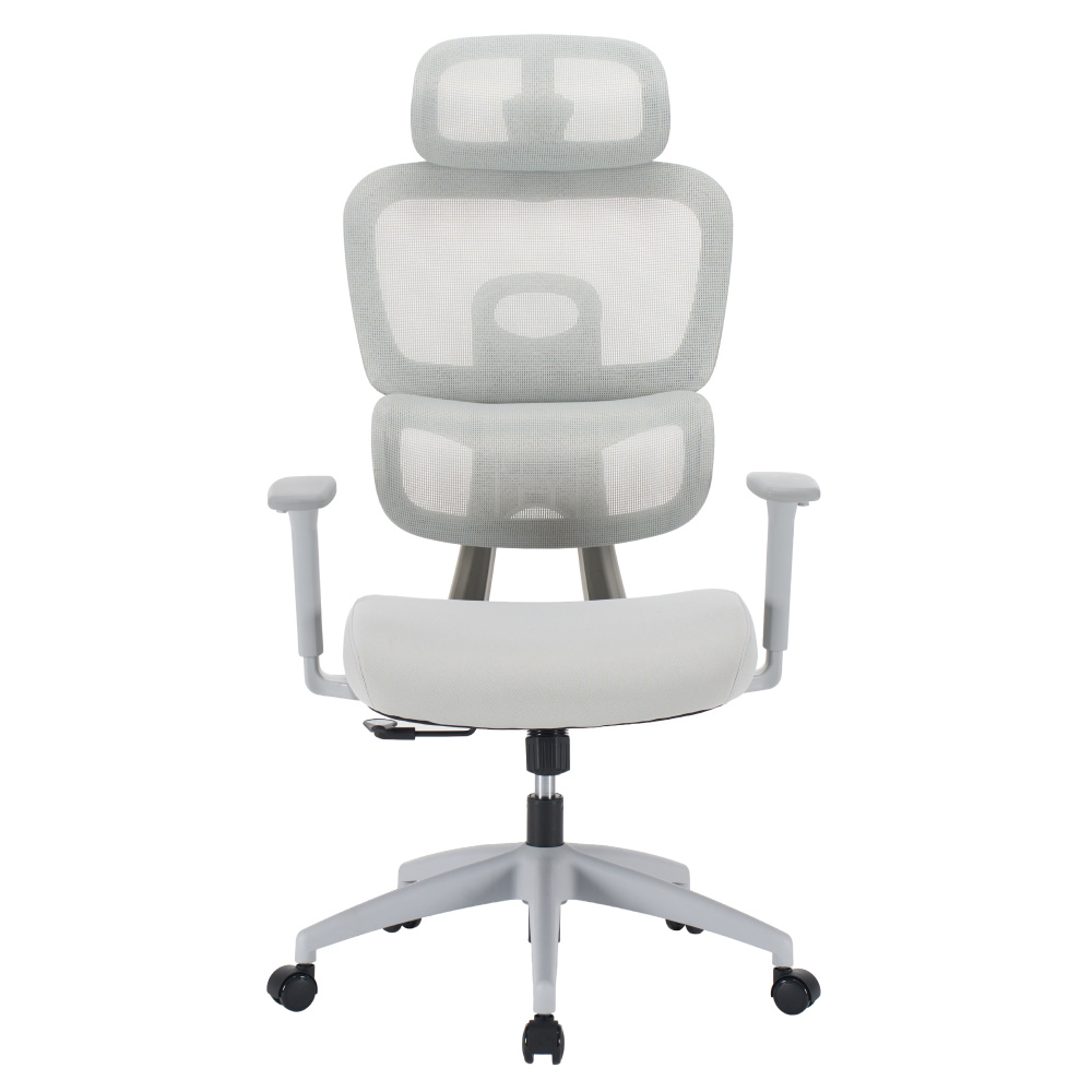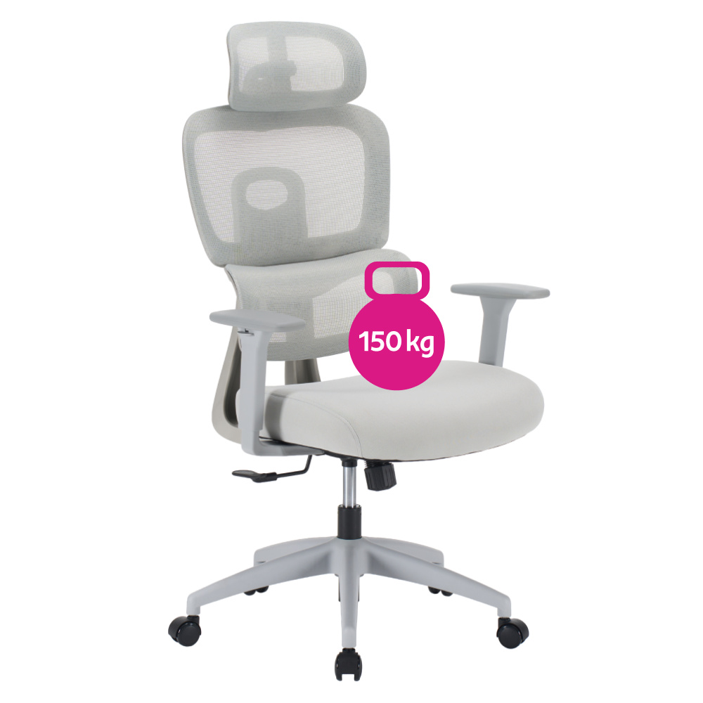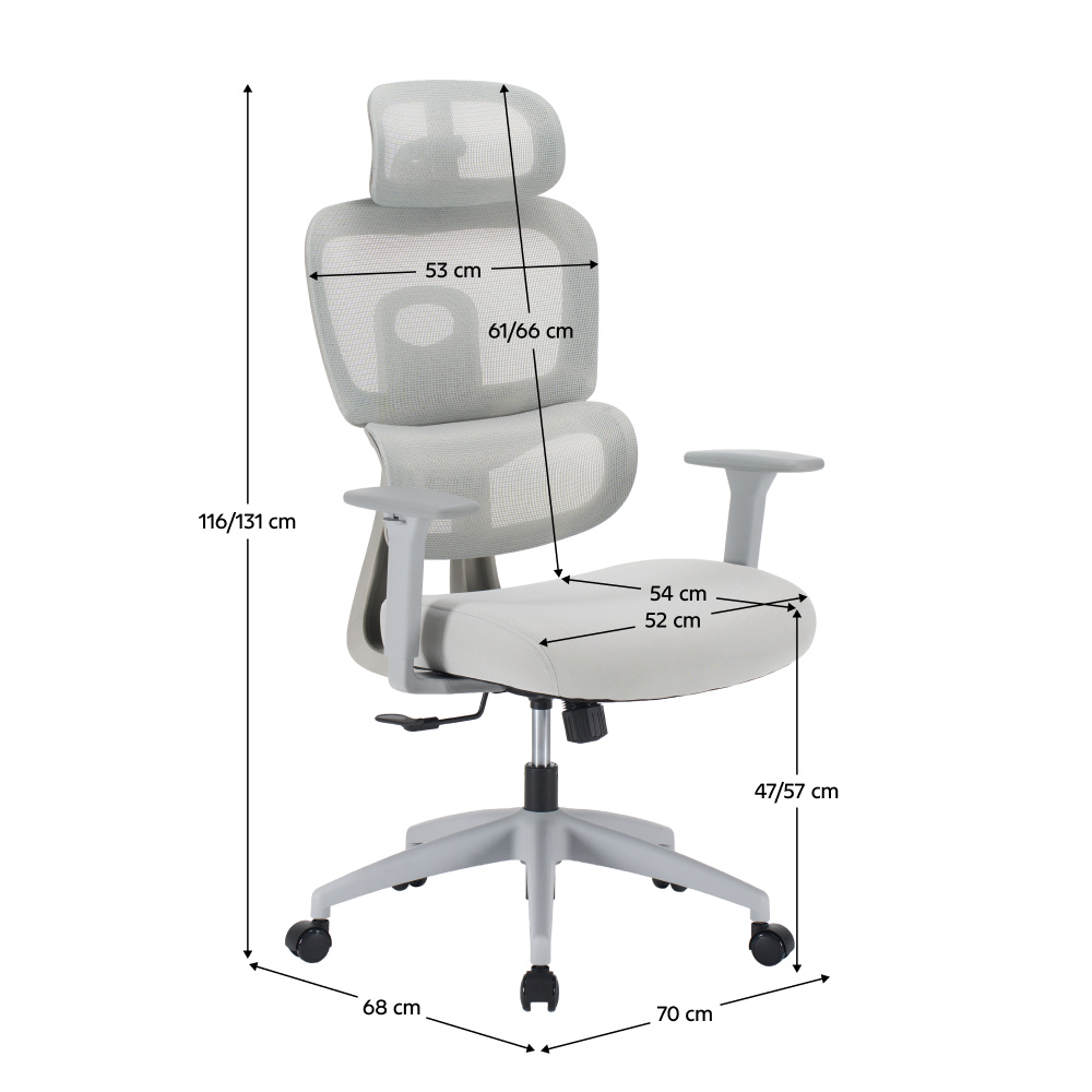 Materiál: síťovina/látka/plast Oděruodolnost síťoviny podle testu Martindale: 90 000 oděrů Oděruodolnost látky podle testu Martindale: 80 000 oděrů Barva: světle šedá/šedá Rozměry (ŠxHxV): 70x68x116-121/126-131 cm Výška sedu: 47-57 cm Hloubka sedu: 54 cm Šířka sedu: 52 cm Šířka zádové opěrky: 53 cm Výška zádové opěrky: 61-66 cm Nosnost: 150 kg Otočná židle Funkce houpání Nastavitelná výška sedu Dynamická bederní opěrka Nastavitelná výška zádové opěrky 3 pozice nastavení výšky zádové opěrky Nastavitelný úhel opěrky hlavy Výškově nastavitelné opěrky na ruce Pohodlné a měkké sedátko Univerzální kolečka Kolečka jsou vhodná pro měkké i tvrdé podlahy Praktická Ergonomické vlastnosti Dodáváno v demontu