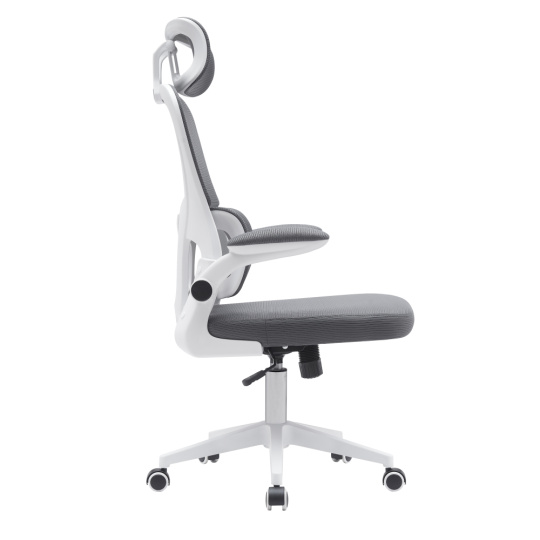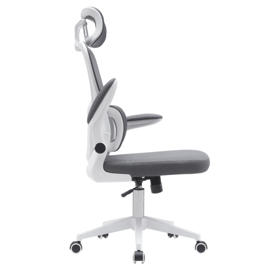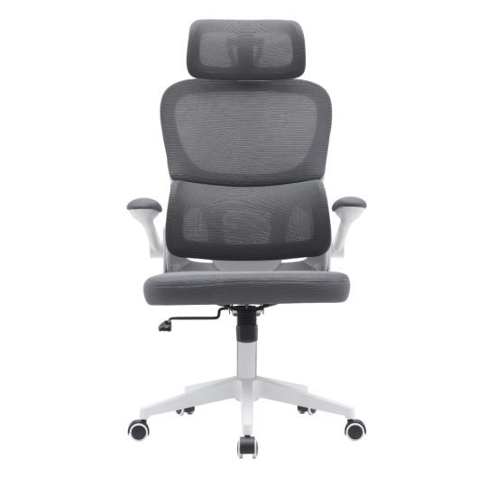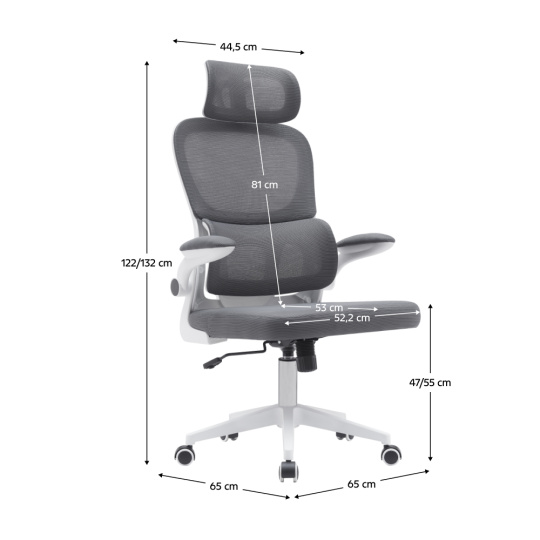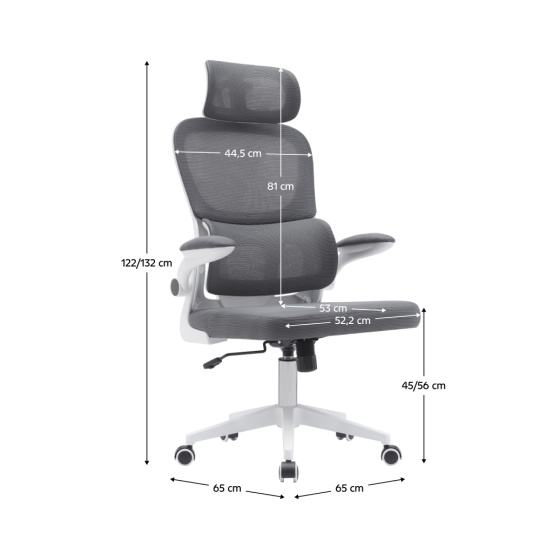 Materiál: síťovina/plast Oděruodolnost síťoviny podle testu Martindale: 90 000 oděrů Barva: tmavě šedá/bílá Rozměry (ŠxHxV): 65x65x122-132 cm Výška sedu: 47-55 cm Hloubka sedu: 53 cm Šířka sedu: 52,2 cm Výška zádové opěrky: 81 cm Šířka zádové opěrky: 44,5 cm Nosnost: 100 kg Čalouněné sklápěcí opěrky na ruce Nastavitelná opěrka hlavy Možnost nastavit výšku sedu Pětiramenná plastová podstava Univerzální kolečka Vhodné pro tvrdé i měkké podlahy Mechanismus houpání Dodáváno v demontu