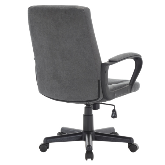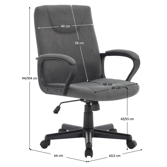 Materiál: látka/plast Oděruodolnost textilie podle testu Martindale: 80 000 oděrů Barva: tmavě šedá/černá Rozměry (ŠxHxV): 60,5x66x94-104 cm Výška sedu: 43-53 cm Šířka sedu: 49 cm Hloubka sedu: 48 cm Výška zádové opěrky: 58 cm Šířka zádové opěrky: 49 cm Nosnost: 100 kg Hmotnost: 10,8 kg Nastavitelná výška sedu Otočná Mechanismus houpání S kolečky Čalouněné opěrky na ruce Kancelářské Dodáváno v demontu