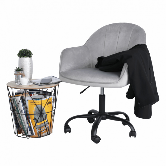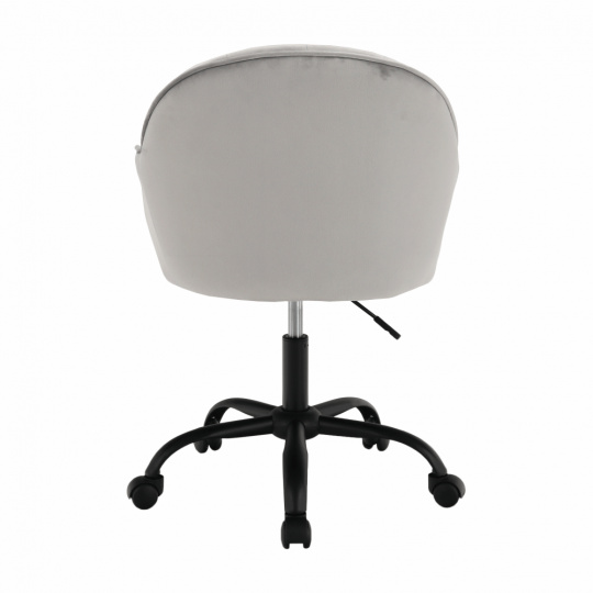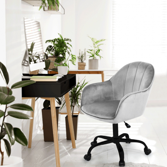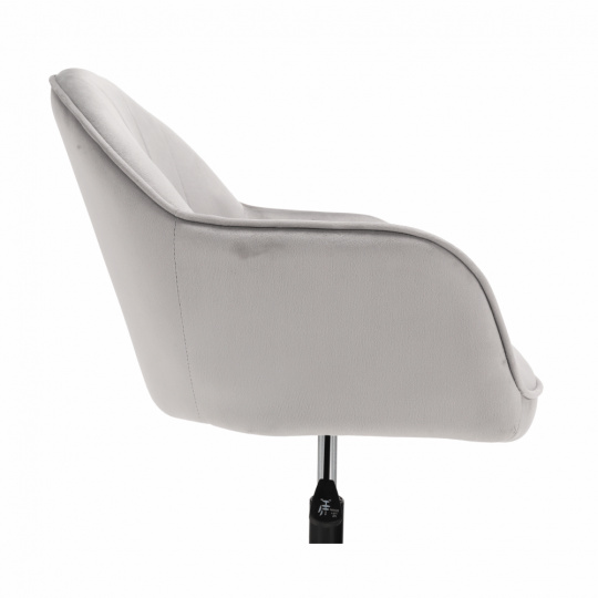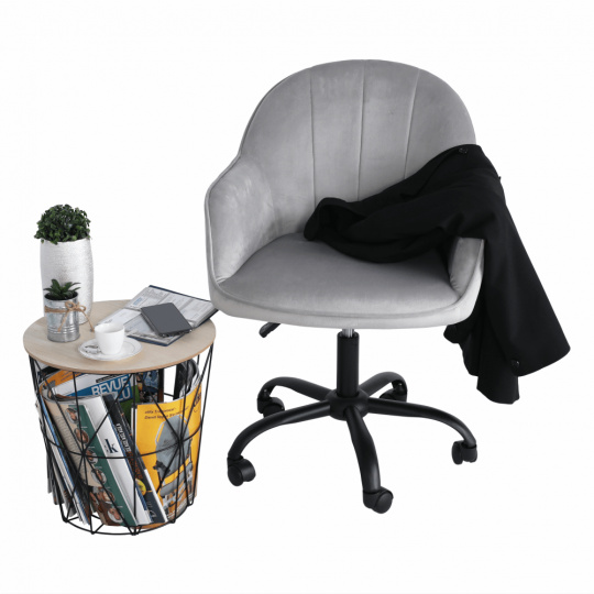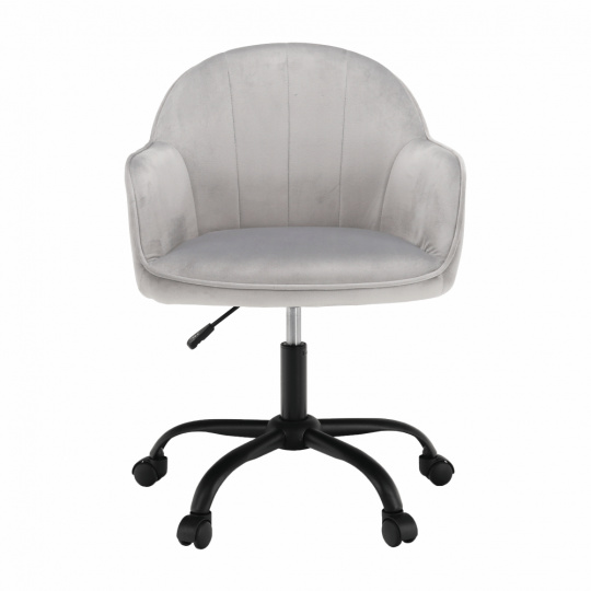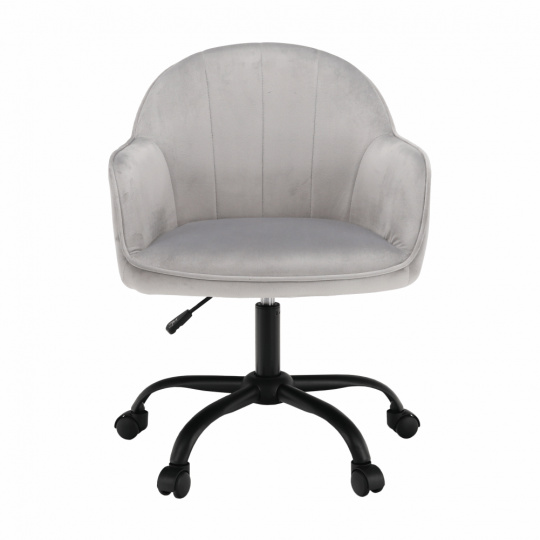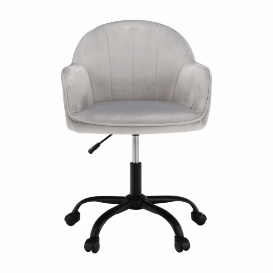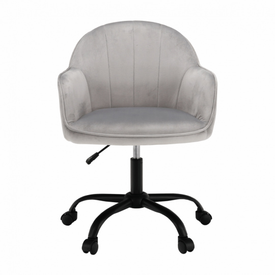 Materiál: Velvet látka / kov Oděruodolnost textilie podle testu Martindale: 80 000 oděrek Barva: světlešedá / černá Rozměry (ŠxHxV): 59x62x82 / 92 cm Nastavení výšky křesla Nastavitelná výška sedu: 45-54 cm Hloubka sedu: 46,5 cm Šířka sedu: 46 cm Šířka zádové opěrky: 54 cm Výška zádové opěrky: 43 cm Maximální nosnost: 110 kg otáčivé pěticípá růžice na kolečkách Dodávané v demontu