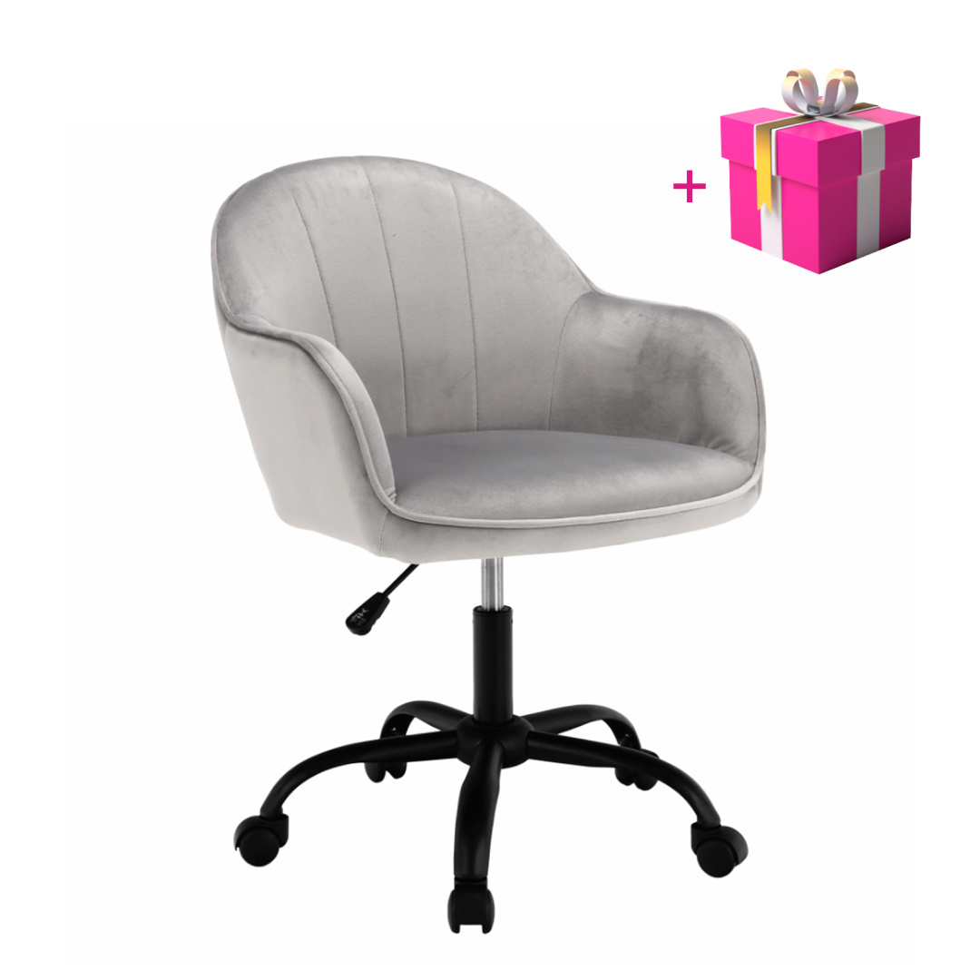 Materiál: Velvet látka / kov Oděruodolnost textilie podle testu Martindale: 80 000 oděrek Barva: světlešedá / černá Rozměry (ŠxHxV): 59x62x82 / 92 cm Nastavení výšky křesla Nastavitelná výška sedu: 45-54 cm Hloubka sedu: 46,5 cm Šířka sedu: 46 cm Šířka zádové opěrky: 54 cm Výška zádové opěrky: 43 cm Maximální nosnost: 110 kg otáčivé pěticípá růžice na kolečkách Dodávané v demontu