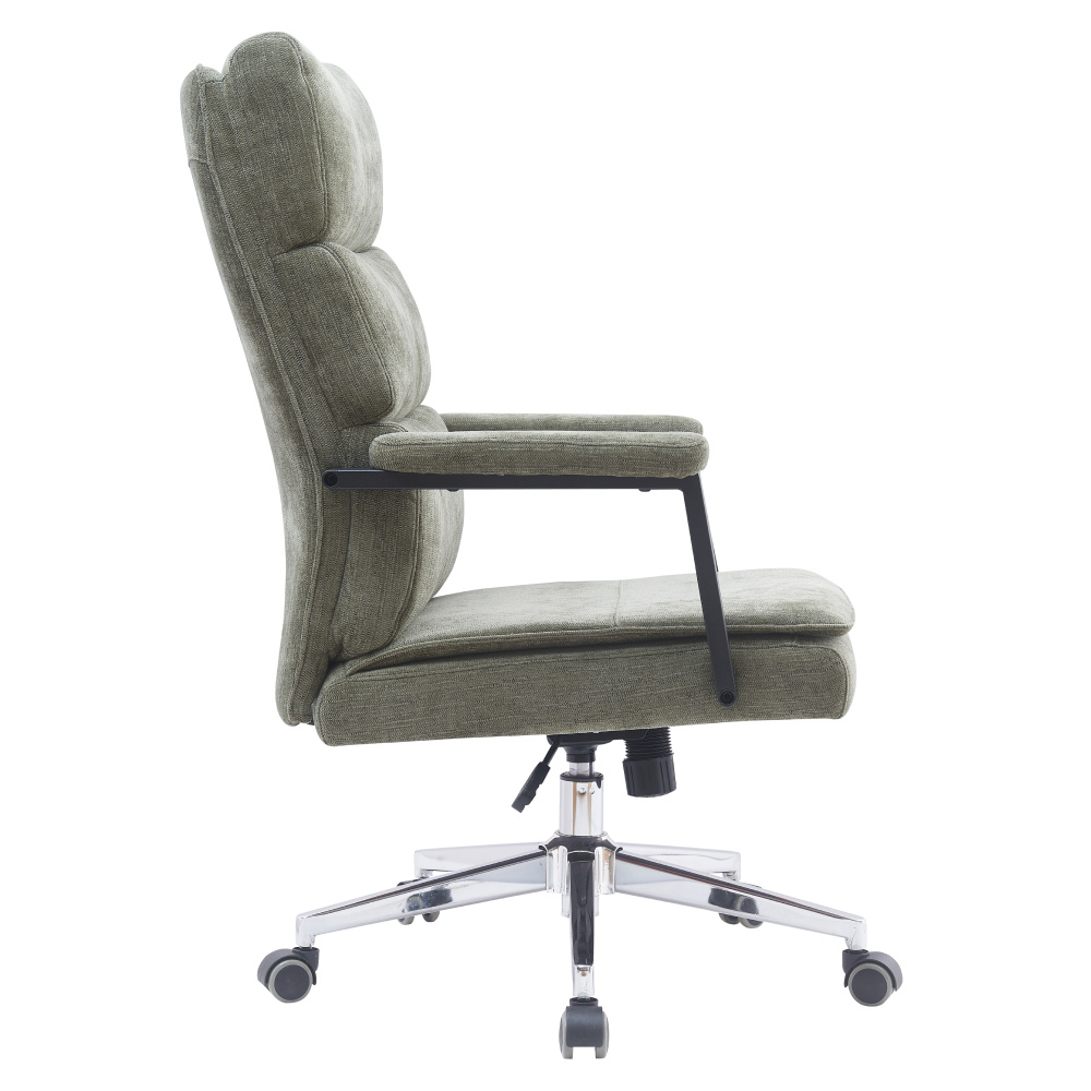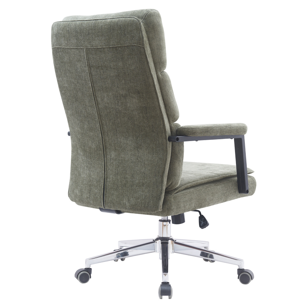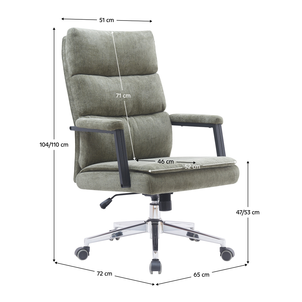 Materiál: látka/kov Oděruodolnost textilie podle testu Martindale: 80 000 oděrů Barva: zelená/chrom Rozměry (ŠxHxV): 65x72x104/110 cm Výška sedu: 47/53 cm Hloubka sedu: 46 cm Šířka sedu: 52 cm Šířka zádové opěrky: 51 cm Výška zádové opěrky: 71 cm Nosnost: 130 kg Hmotnost: 15,7 kg S čaluněnými opěrkami na ruce Otočné Možnost nastavit výšku sedu Mechanismus houpání Pětiramenná chromová podstava Univerzální kolečka Vhodné pro měkké i tvrdé podlahy Dodáváno v demontu