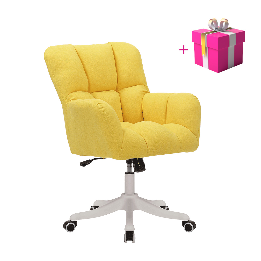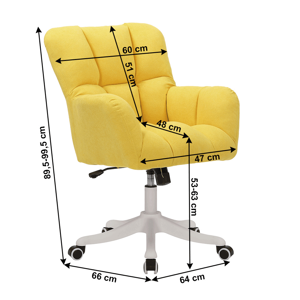 Materiál konstrukce: plast Barva: bílá Materiál čalounění: látka Oděruodolnost látky podle testu Martindale: 80.000 oděrek Barva: žlutá Rozměry (ŠxHxV): 64x67x89,5-99,5 cm Nastavitelná výška sedu: 53-63 cm Šířka sedu: 47 cm Hloubka sedu: 41 cm Výška zádové opěrky: 47 cm Šířka zádové opěrky: 57 cm Maximální nosnost: 110 kg S pístem Opěrky na ruce Dekorativní šití na opěradle a sedadle Plastová pětiramenná podstava Univerzální kolečka vhodná pro měkké i tvrdé podlahy funkce houpání Dodávané v demont