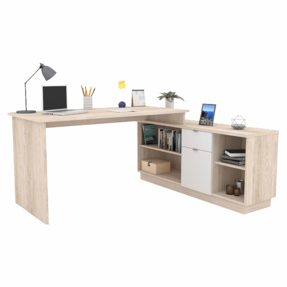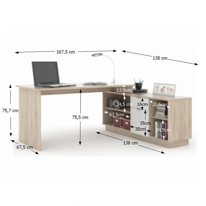 Rohový PC stůl s policemi a skříňkou se šuplíkem Materiál: DTD laminovaná Barva: dub sonoma / bílá Celkové rozměry (ŠxHxV): 167,5x138x75 cm Rozměry stolu (ŠxHxV): 167,5x67,5x75 cm Rozměry úložného prostoru (ŠxHxV): 138x40x61,5 cm Tloušťka materiálu korpus: 16/22 mm
