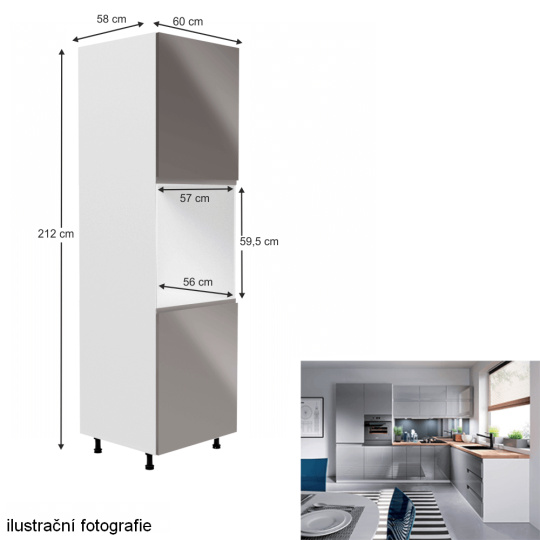 Materiál: DTD laminovaná/MDF Barva: bílá/šedá extra vysoký lesk Rozměry (ŠxHxV): 60x58x212 cm Vnitřní rozměr na troubu (ŠxHxV): 57x56x59,5 cm Tloušťka materiálu: 15 mm Systém tichého zavírání dvířek S výsuvným kovovým košem e nutno objednat potřebný počet ukončení spodní lišty Spodní lištu je nutno objednat zvlášť, přičemž daný rozměr je třeba uvést do poznámky Nutno doobjednat 2 ks úchytů na sokl Levé provedení Dodáváno v demontu  Pracovní deska není součástí skříněk. Je možné si doobjednat pracovní desku v provedení dub artisan o tloušťce 38 mm za 1.690 Kč/bm. Možnost dokoupit dřez, dřezovou baterii a příslušenství. Ke spodním skříňkám máte možnost dokoupit spodní lištu/sokl v bílé barvě o rozměru 1 bm za 210 Kč nebo 2 bm za 420 Kč a ukončení na sokl o hloubce 47 cm nebo 58 cm za 140 Kč. Ke každé dolní skříňce, kromě D25PZ, je třeba doobjednat 2 ks úchytek na sokl - cena 30 Kč/2ks.