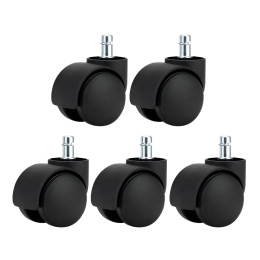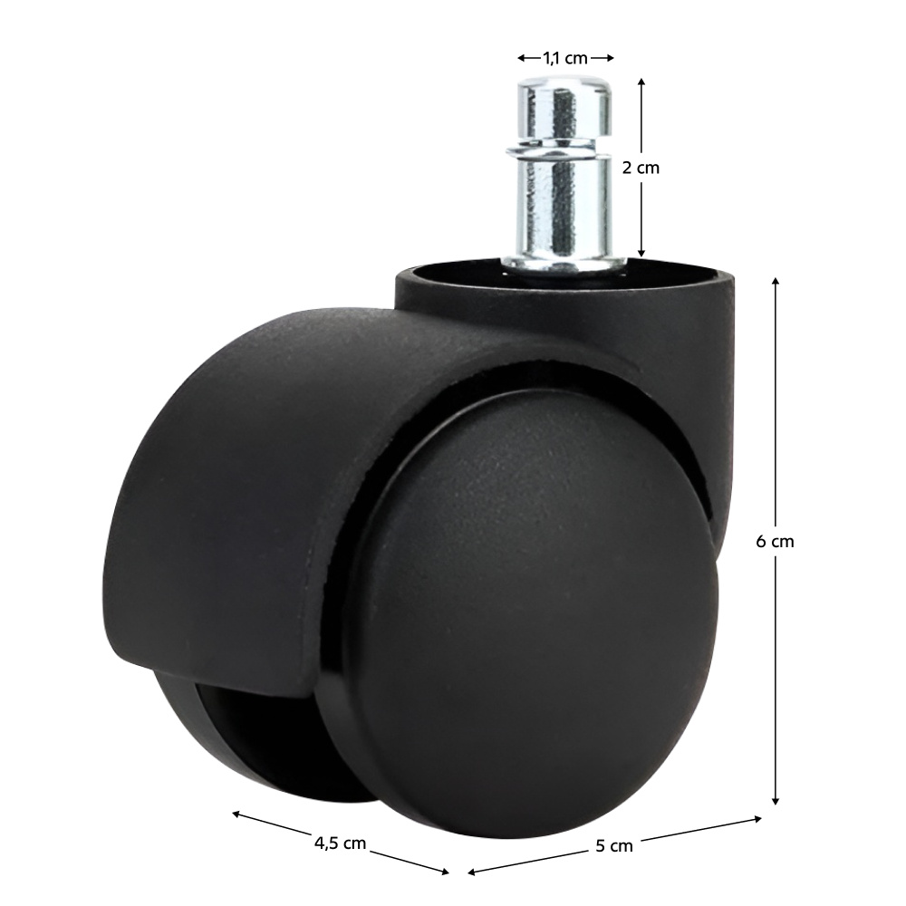 Materiál: nylonový plast Barva: černá Průměr kolečka: 5 cm Šířka kolečka: 4,5 cm Délka vřetene: 2 cm Průměr vřetene: 1,1 cm Náhradní kolečka Zatížení kolečka: Max. 50 kg Set 5 ks Vhodné pro měkké podlahy Pro kancelářská křesla Pro kancelářské židle Náhradní kolečka Jednoduchá montáž jen kliknutím Otočné o 360°