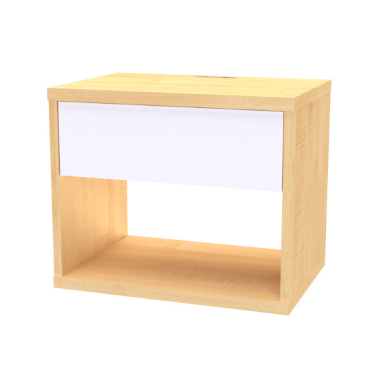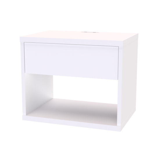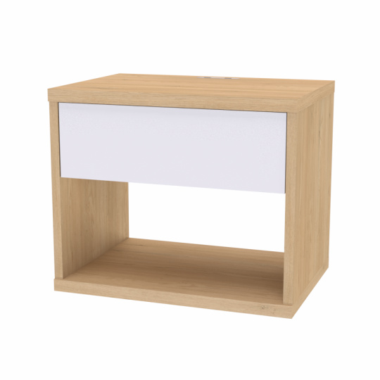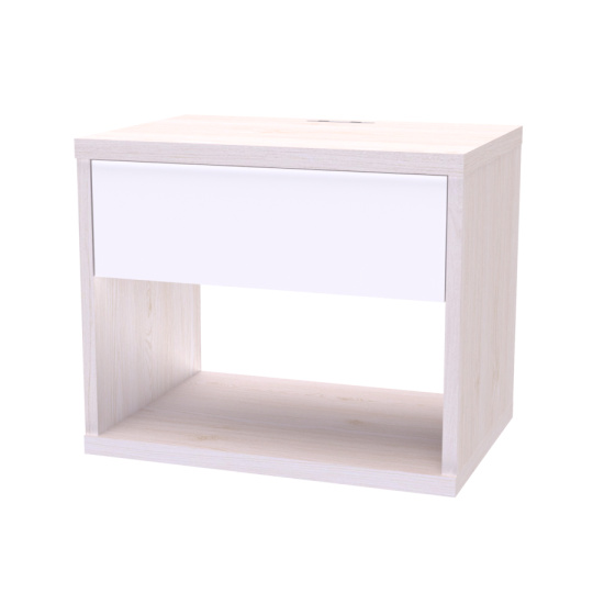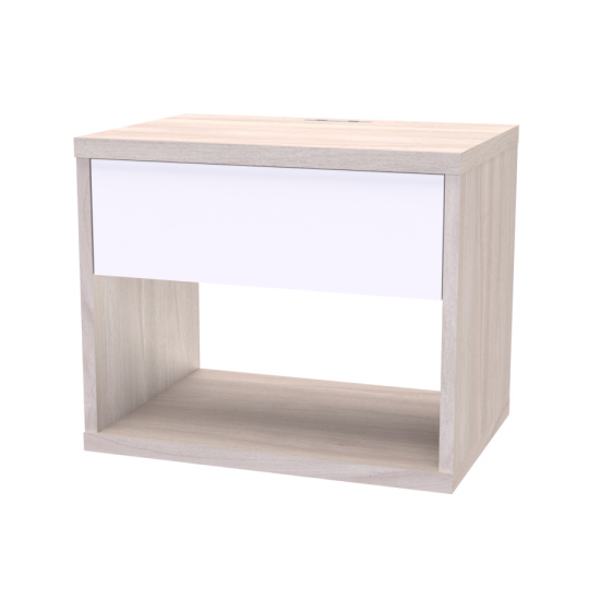 Noční stolek je určený k zavěšení na stěnu, ale můžete jej postavit i samostatně. Vyrobený je z laminované dřevotřísky v kombinaci síly 25 a 18 mm. Bez-úchytková zásuvka je vybavená skrytými plno-výsuvnými pojezdy s tlumením a dotahem. Součástí je kvalitní kování a spojovací materiál bez použití plastových součástek (vyjma ochranných krytek)
