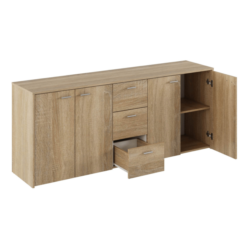 Materiál: laminovaná DTD Barva: dub sonoma Rozměry (ŠxHxV): 180x42x74,5 cm Tloušťka materiálu: 1,6 cm Policová Čtyřdveřová Tři zásuvky S plastovými úchytkami Barva úchytek: stříbrná Nosnost vrchní police: 10 kg Nosnost vnitřních polic: 5 kg Nosnost zásuvek: 5 kg Plastové kluzáky Doporučujeme připevnit ke zdi Kvalitní slovenský výrobek Dodávána v demontu