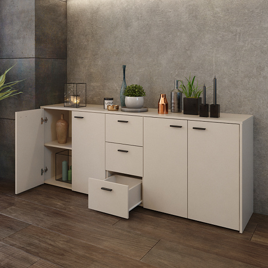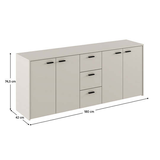Materiál: laminovaná DTD Barva: kašmír Rozměry (ŠxHxV): 180x42x74,5 cm Tloušťka materiálu: 1,6 cm Policová Čtyřdveřová Tři zásuvky S plastovými úchytkami Barva úchytek: stříbrná Nosnost vrchní police: 10 kg Nosnost vnitřních polic: 5 kg Nosnost zásuvek: 5 kg Plastové kluzáky Doporučujeme připevnit ke zdi Kvalitní slovenský výrobek Dodávána v demontu
