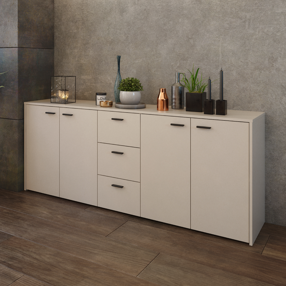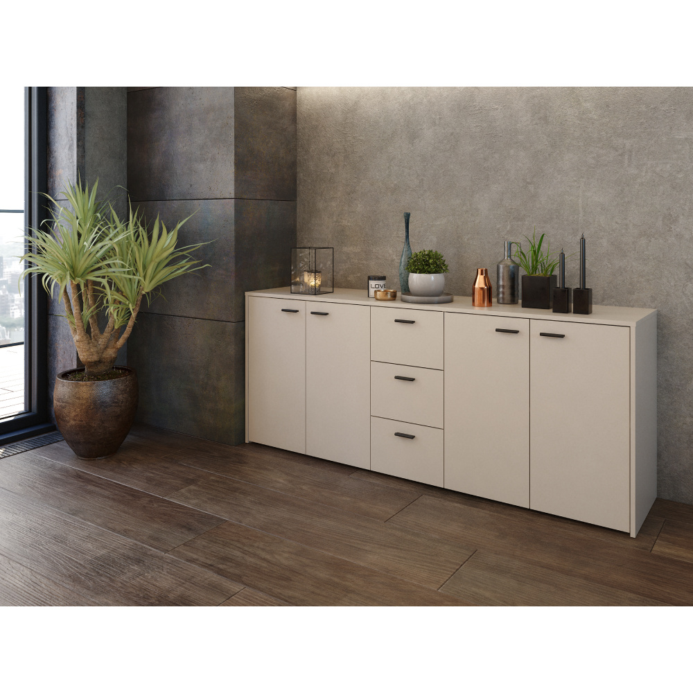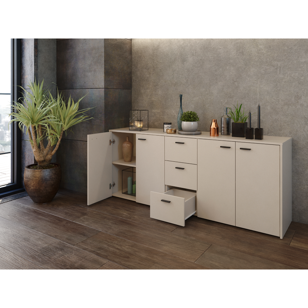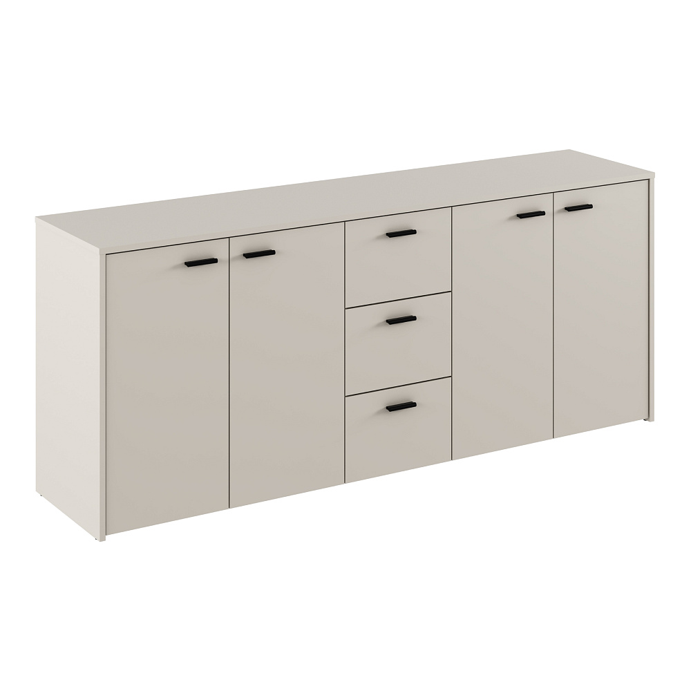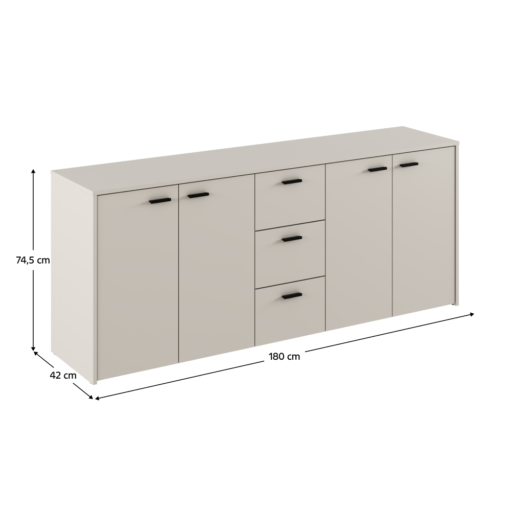 Materiál: laminovaná DTD Barva: kašmír Rozměry (ŠxHxV): 180x42x74,5 cm Tloušťka materiálu: 1,6 cm Policová Čtyřdveřová Tři zásuvky S plastovými úchytkami Barva úchytek: stříbrná Nosnost vrchní police: 10 kg Nosnost vnitřních polic: 5 kg Nosnost zásuvek: 5 kg Plastové kluzáky Doporučujeme připevnit ke zdi Kvalitní slovenský výrobek Dodávána v demontu