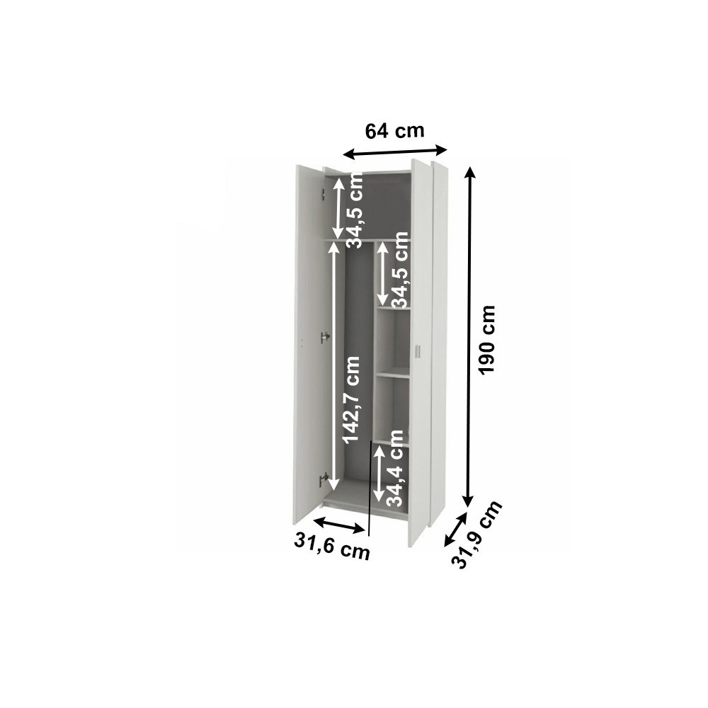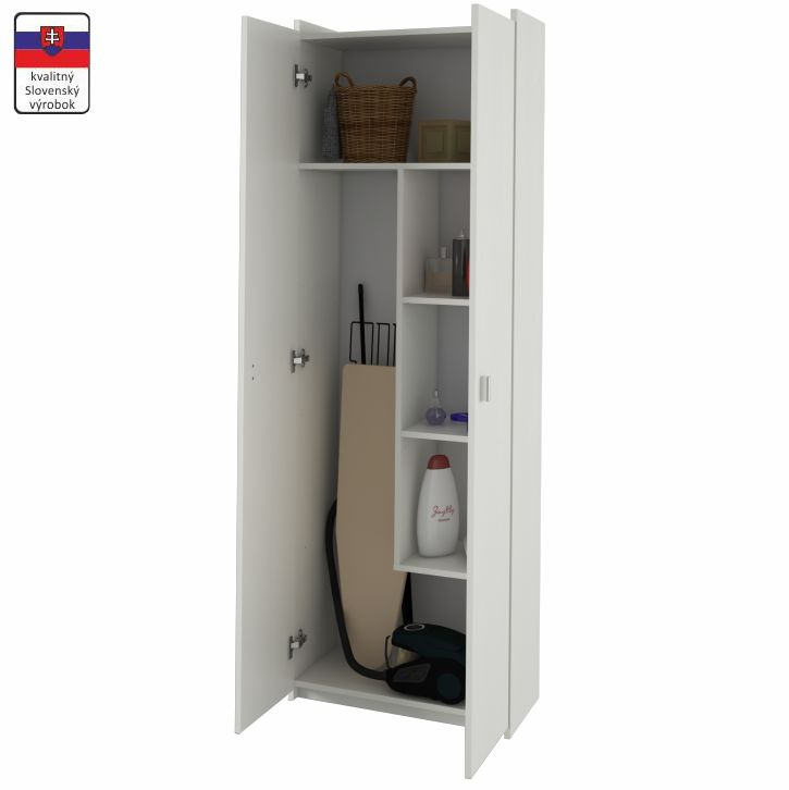 Materiál: laminovaná DTD Barva: bílá Rozměry (ŠxHxV): 64x32x190 cm Skříňka (ŠxHxV): 64x30x63,6 cm Šířka dvířek: 31,6 cm Regálová police (ŠxHxV): 64x32x123 cm Výška mezi policemi: 36,2 cm Prostor na pračku (ŠxHxV): 60,8x32x85,2 cm Přečnívající část nad skříňkou: 4 cm Tloušťka materiálu: 16 mm S policemi Dvoudveřová skříňka Kvalitní slovens
