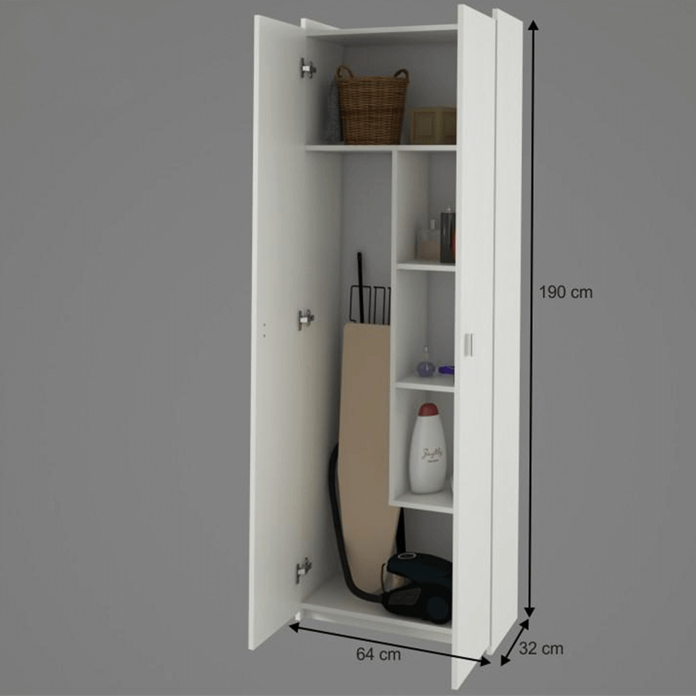 Materiál: laminovaná DTD Barva: bílá Rozměry (ŠxHxV): 96x32x190 cm Rozměr pro pračku (ŠxHxV): 60,8x32x85 cm Tloušťka materiálu: 1,6 cm Otevřený úložný prostor S policemi Nosnost na polici: 5 kg S plastovými úchytkami Skříňka je postavena na kluzácích Čtyřdveřová skříňka Univerzální dvířka na regálu Praktické vytvoření úložného prostoru Kv