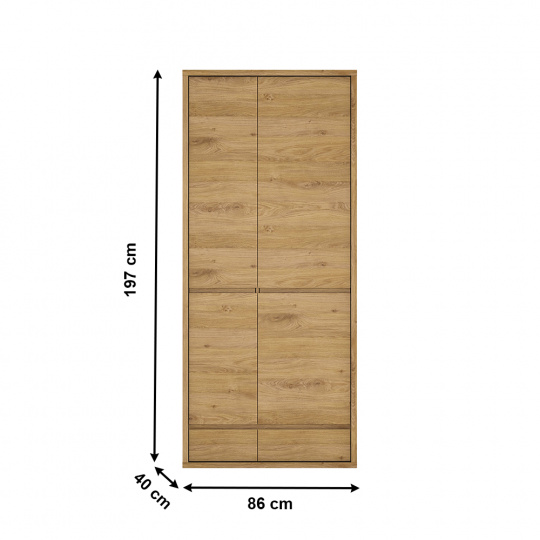 Materiál: laminovaná DTD Barevné provedení: dub Shetland/šedá Rozměry (ŠxHxV): 86x58x197 cm Tloušťka korpusu: 2,8 cm bez úchytová Jednoduchá a elegantní kombinovaná hrubý korpus 2 šuplíky 4 poličky 2 tyče zavřená moderní styl vysoká kvalita precizní zpracování Odolný vůči poškrábání, UV záření, vysokým teplotám S nožičkami Nosnost poličky: 5 kg Nosnost šuplíku: 5 kg Dodávané v demontu