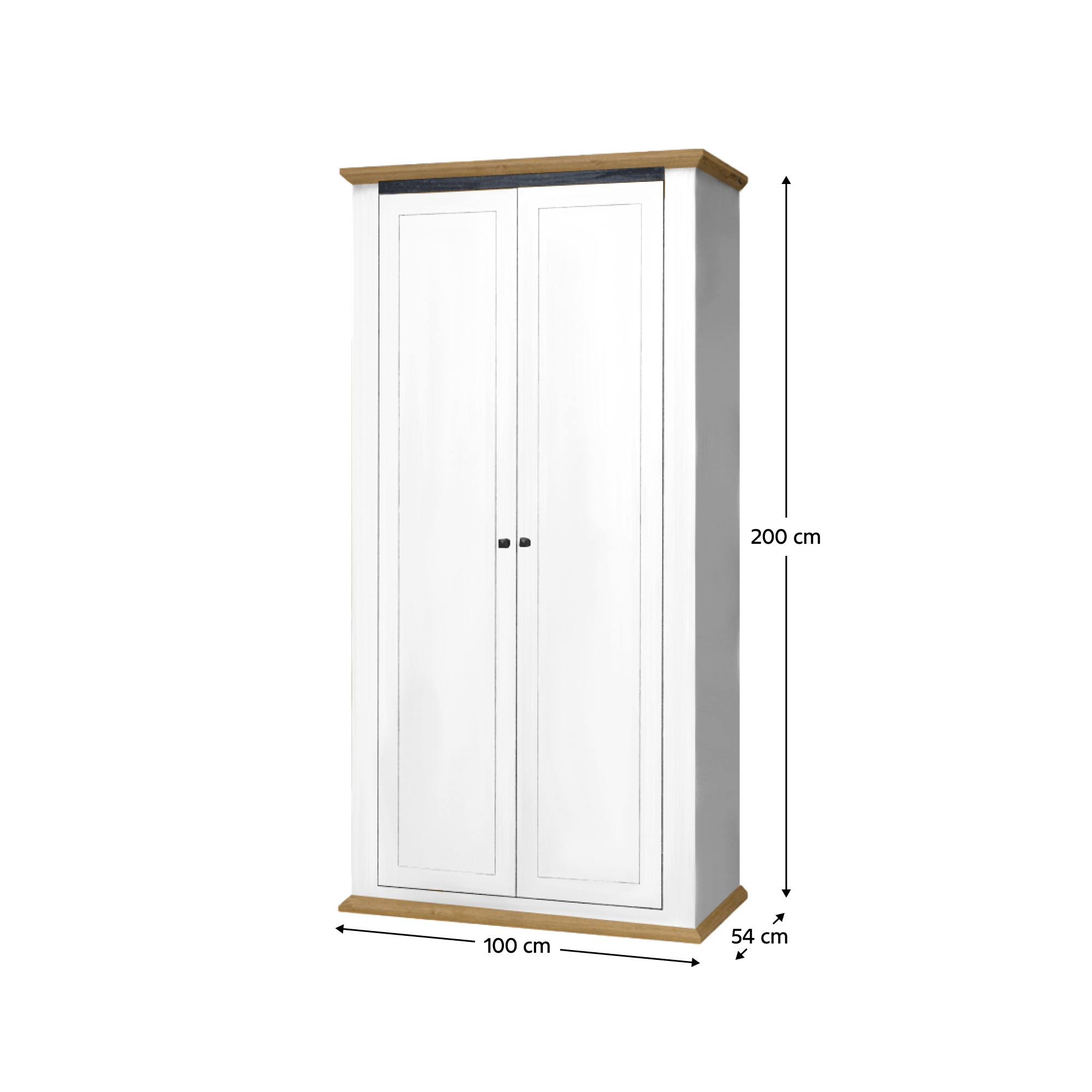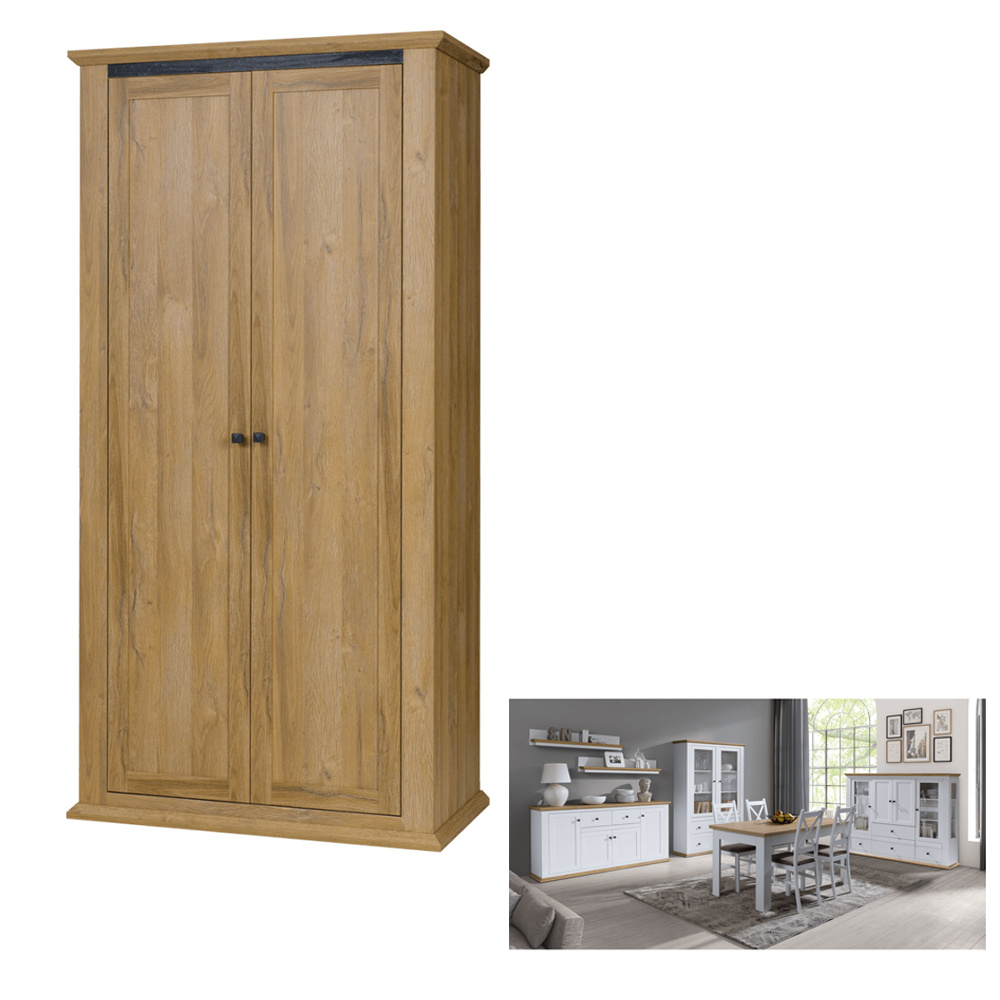 Materiál: DTD laminovaná / ABS hrany Barva: bílá / dub grand Rozměry (ŠxHxV): 100x54x200 cm Tloušťka materiálu: 40 mm dvoudveřová věšáková S věšákovou tyčí policová S úchytkami S 3D efektem elegantní V provensálském stylu kovové úchytky Dodávané v demontu
