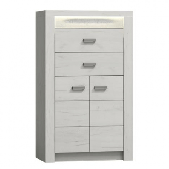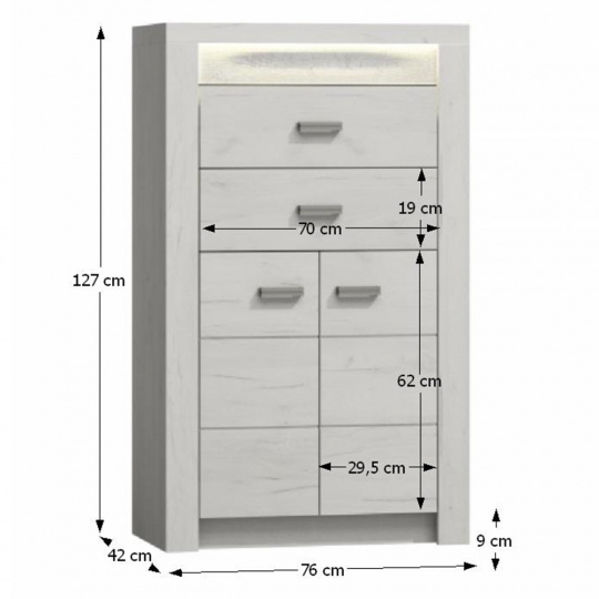 Komoda Infinity I-06 Korpus hrubý až 48 mm, Tloušťka materiálu zbývající části: 16 mm, úchytky kovové Materiál DTD laminovaná, ABS hrany, barevné provedení: jasan bílý Rozměry ŠxHxV: 76x42x127 cm. Možnost dokoupení LED osvětlení v ceně 840 Kč. Dodávané v demontu.